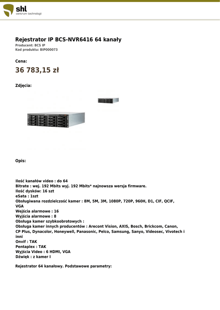 Rejestrator IP BCS-NVR6416 64 kanały Producent: BCS IP Kod produktu: BIP000073 Cena: 36 783,15 zł Zdjęcia: Opis: Ilość kanałów video : do 64 Bitrate : wej. 192 Mbits wyj. 192 Mbits* najnowsza wersja firmware. Ilość dysków: 16 szt eSata : 1szt Obsługiwana rozdzielczość kamer : 8M, 5M, 3M, 1080P, 720P, 960H, D1, CIF, QCIF, VGA Wejścia alarmowe : 16 Wyjścia alarmowe : 8 Obsługa kamer szybkoobrotowych : Obsługa kamer innych producentów : Arecont Vision, AXIS, Bosch, Brickcom, Canon, CP Plus, Dynacolor, Honeywell, Panasonic, Pelco, Samsung, Sanyo, Videosec, Vivotech i inni Onvif : TAK Pentaplex : TAK Wyjścia Video : 6 HDMI, VGA Dźwięk : z kamer I Rejestrator 64 kanałowy. Podstawowe parametry: ● ● ● ● ● ● ● ● ● ● ● ● Ilość kanałów video : do 64 Bitrate : wej. 192 Mbits wyj. 192 Mbits* najnowsza wersja firmware Ilość dysków: 16 szt eSata : 1szt Obsługiwana rozdzielczość kamer : 8M, 5M, 3M, 1080P, 720P, 960H, D1, CIF, QCIF,VGA Wejścia alarmowe : 16 Wyjścia alarmowe : 8 Obsługa kamer szybkoobrotowych Obsługa kamer innych producentów : Arecont Vision, AXIS, Bosch, Brickcom, Canon,CP Plus, Dynacolor, Honeywell, Panasonic, Pelco, Samsung, Sanyo, Videosec, Vivotech iinniOnvif : TAK Pentaplex : TAK Wyjścia Video : 6 HDMI, VGA Dźwięk : z kamer IP