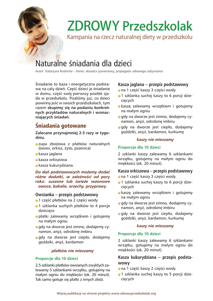 ZDROWY Przedszkolak Kampania na rzecz naturalnej diety w przedszkolu Naturalne śniadania dla dzieci Autor: Katarzyna Rudnicka – trener, doradca żywieniowy, propagator zdrowego odżywiania Śniadanie to baza i energetyczna podstawa na cały dzień. Część dzieci je śniadanie w domu, część swój pierwszy posiłek zjada w przedszkolu. Pisaliśmy już, co dzieci powinny jeść w swoich przedszkolach, tym razem skupimy się na podaniu konkretnych przykładów naturalnych i wzmacniających śniadań. Śniadania gotowane Zalecane przynajmniej 2-3 razy w tygodniu. ¥¥ zupa zbożowa z płatków naturalnych (owies, orkisz, żyto, pszenica) ¥¥ kasza jaglana ¥¥ kasza orkiszowa ¥¥ kasza kukurydziana. Do dań podstawowych możemy dodać różne dodatki, w zależności od pory roku: suszone lub świeże sezonowe owoce, bakalie, orzechy, przyprawy. Owsianka – przepis podstawowy ¥¥ 1 część płatków na 2 części wody ¥¥ 1 szklanka suchych płatków to 4 porcje dziecięce ¥¥ płatki zalewamy wrzątkiem i gotujemy na małym ogniu ¥¥ gdy na dworze jest zimno, dodajemy cynamon, anyż, odrobinę imbiru ¥¥ gdy na dworze jest ciepło, dodajemy goździki, anyż, kardamon płatków nie mieszamy Proporcje dla 10 dzieci 2,5 szklanki płatków owsianych zwykłych zalewamy 5 szklankami wrzątku, gotujemy na małym ogniu do miękkości (ok. 20 minut). Tak samo gotuje się płatki z innych zbóż. Kasza jaglana – przepis podstawowy ¥¥ na 1 część kaszy 3 części wody ¥¥ 1 szklanka suchej kaszy to 6 porcji dziecięcych ¥¥ kaszę zalewamy wrzątkiem i gotujemy na małym ogniu ¥¥ gdy na dworze jest zimno, dodajemy cynamon, anyż, odrobinę imbiru ¥¥ gdy na dworze jest ciepło, dodajemy goździki, anyż, kardamon, kurkumę kaszy nie mieszamy Proporcje dla 10 dzieci 2 szklanki kaszy zalewamy 6 szklankami wrzątku, gotujemy na małym ogniu do miękkości (ok. 20 minut). Kasza orkiszowa – przepis podstawowy ¥¥ na 1 część kaszy 3 części wody ¥¥ 1 szklanka suchej kaszy to 6 porcji dziecięcych ¥¥ kaszę zalewamy wrzątkiem i gotujemy na małym ogniu ¥¥ gdy na dworze jest zimno, dodajemy cynamon, anyż, odrobinę imbiru ¥¥ gdy na dworze jest ciepło, dodajemy goździki, anyż, kardamon, kurkumę kaszy nie mieszamy Proporcje dla 10 dzieci 2 szklanki kaszy zalewamy 6 szklankami wrzątku, gotujemy na małym ogniu do miękkości (ok. 20 minut). Kasza kukurydziana – przepis podstawowy ¥¥ na 1 część kaszy 2 części wody ¥¥ 1 szklanka suchej kaszy to 5 porcji dziecięcych Więcej publikacji na stronie projektu www.zdrowyprzedszkolak.org ¥¥ kaszę rozprowadzamy w części wody (zimnej) i wlewamy do wrzątku ¥¥ gotujemy na małym ogniu, mieszając ¥¥ gdy na dworze jest zimno, dodajemy cynamon, anyż, odrobinę imbiru lub gałki muszkatałowej ¥¥ gdy na dworze jest ciepło, dodajemy goździki, anyż, kardamon lub kurkumę. Proporcje dla 10 dzieci 2 szklanki kaszy zalewamy 4 szklankami wrzątku, gotujemy na małym ogniu do miękkości (ok. 20 minut). Do gotowanych zbóż (z przepisów podstawowych) na stole stawiamy (w małych miseczkach) do wyboru dzieci: ¥¥ masło, miód, niskosłodzoną marmoladę porzeczkowa, powidła śliwkowe ¥¥ masło, prażone wiórki kokosowe, prażone płatki migdałowe, prażony sezam ¥¥ masło, miód, rodzynki, pokrojone jabłka, pokrojone gruszki (gdy na dworze jest zimno, rodzynki i owoce powinny być gotowane z kaszą lub płatkami) ¥¥ odcedzone owoce z ugotowanego kompotu: suszone morele, śliwki, rodzynki, daktyle, figi, jabłka, gruszki; czysty kompot podany do picia ¥¥ rozdrobnione orzechy włoskie, laskowe, nerkowca. Dzięki dodatkom postawionym na stole dzieci mogą same komponować posiłek. Jest to również alternatywa dla tych dzieci, które mają alergię na określony składnik (np. orzechy włoskie). Każdego dnia mogą pojawiać się inne zestawy, dzięki czemu posiłki będą urozmaicone, a dzieci będą miały okazję spróbować smaku pojedynczych składników i sprawdzać, które im smakują. Pieczywo i pasty do pieczywa Dzieci powinny jeść również dobrej jakości pieczywo, najlepiej chleb razowy na zakwasie, chleb razowy z ziarenkami, bułki pełnoziarniste. Pytanie – z czym? Z masłem, to na pewno. A co zamiast szynki i sera? Świetnie sprawdzają się różnorakie pasty. Oprócz znanych wszystkim past z ryby wędzonej, jajek czy twarogu, istnieje wiele past zbożowo-warzywnych, które stanowią doskonałe urozmaicenie dziecięcego jadłospisu. To również alter- natywa dla dzieci wegetariańkich. Pasty są zdrowe i tanie! Pomarańczowa pasta z kaszy jaglanej i marchwi (przepis na 10 porcji) Szklankę ugotowanej kaszy jaglanej (najlepiej ciepłej, ale niekoniecznie) zmiksować ze szklanką ugotowanej marchwi, dodać szczyptę kardamonu, soli i parę kropli cytryny. Jeśli jest zbyt gęsta, dodać odrobinę wrzątku. Pasta obniża chęć na słodycze. Zielona pasta brokułowa (przepis na 10 porcji) Ugotować 1 mały brokuł, odcedzić. Na suchej patelni uprażyć 2 łyżki wiórków kokosowych, ostudzić. Zmiksować brokuł z wiórkami, doprawić sokiem z cytryny, pieprzem i solą; można dolać oliwy lub oleju lnianego. Pasta jest świetnym źródłem wapnia. Dziecięcy humus – pasta z cieciorki (przepis na 10 porcji) Szklankę cieciorki namoczyć na noc w 2 szklankach wody, ugotować ją do miękkości. Na suchej patelni uprażyć pół szklanki sezamu (aż zacznie pachnieć), ostudzić. Zmiksować ugotowaną cieciorkę, sezam, dwie łyżki masła, pół szklanki wrzątku. Dodać sól i pieprz ziołowy do smaku. Pasta jest doskonałym źródłem magnezu, fosforu i żelaza. Można użyć gotowej cieciorki ze słoika. Może być też wersja z natką pietruszki lub koperkiem – pasta będzie miała zielony kolor. Do wyrobu past możemy użyć wszelkich ugotowanych warzyw (brokuł, brukselka, marchewka, fasola jaś, cieciorka itd.), przyprawionych pieprzem, solą, sokiem z cytryny. Możemy 