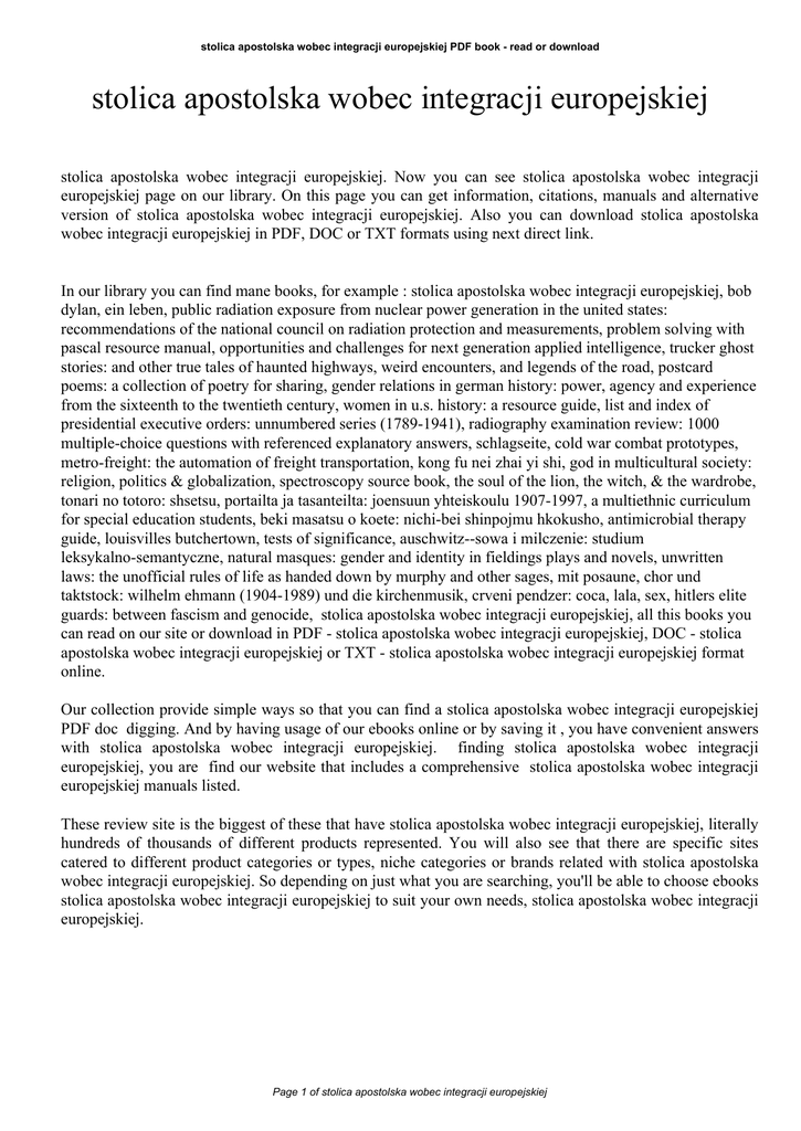 stolica apostolska wobec integracji europejskiej PDF book - read or download stolica apostolska wobec integracji europejskiej stolica apostolska wobec integracji europejskiej. Now you can see stolica apostolska wobec integracji europejskiej page on our library. On this page you can get information, citations, manuals and alternative version of stolica apostolska wobec integracji europejskiej. Also you can download stolica apostolska wobec integracji europejskiej in PDF, DOC or TXT formats using next direct link. In our library you can find mane books, for example : stolica apostolska wobec integracji europejskiej, bob dylan, ein leben, public radiation exposure from nuclear power generation in the united states: recommendations of the national council on radiation protection and measurements, problem solving with pascal resource manual, opportunities and challenges for next generation applied intelligence, trucker ghost stories: and other true tales of haunted highways, weird encounters, and legends of the road, postcard poems: a collection of poetry for sharing, gender relations in german history: power, agency and experience from the sixteenth to the twentieth century, women in u.s. history: a resource guide, list and index of presidential executive orders: unnumbered series (1789-1941), radiography examination review: 1000 multiple-choice questions with referenced explanatory answers, schlagseite, cold war combat prototypes, metro-freight: the automation of freight transportation, kong fu nei zhai yi shi, god in multicultural society: religion, politics & globalization, spectroscopy source book, the soul of the lion, the witch, & the wardrobe, tonari no totoro: shsetsu, portailta ja tasanteilta: joensuun yhteiskoulu 1907-1997, a multiethnic curriculum for special education students, beki masatsu o koete: nichi-bei shinpojmu hkokusho, antimicrobial therapy guide, louisvilles butchertown, tests of significance, auschwitz--sowa i milczenie: studium leksykalno-semantyczne, natural masques: gender and identity in fieldings plays and novels, unwritten laws: the unofficial rules of life as handed down by murphy and other sages, mit posaune, chor und taktstock: wilhelm ehmann (1904-1989) und die kirchenmusik, crveni pendzer: coca, lala, sex, hitlers elite guards: between fascism and genocide, stolica apostolska wobec integracji europejskiej, all this books you can read on our site or download in PDF - stolica apostolska wobec integracji europejskiej, DOC - stolica apostolska wobec integracji europejskiej or TXT - stolica apostolska wobec integracji europejskiej format online. Our collection provide simple ways so that you can find a stolica apostolska wobec integracji europejskiej PDF doc digging. And by having usage of our ebooks online or by saving it , you have convenient answers with stolica apostolska wobec integracji europejskiej. finding stolica apostolska wobec integracji europejskiej, you are find our website that includes a comprehensive stolica apostolska wobec integracji europejskiej manuals listed. These review site is the biggest of these that have stolica apostolska wobec integracji europejskiej, literally hundreds of thousands of different products represented. You will also see that there are specific sites catered to different product categories or types, niche categories or brands related with stolica apostolska wobec integracji europejskiej. So depending on just what you are searching, you'll be able to choose ebooks stolica apostolska wobec integracji europejskiej to suit your own needs, stolica apostolska wobec integracji europejskiej. Page 1 of stolica apostolska wobec integracji europejskiej