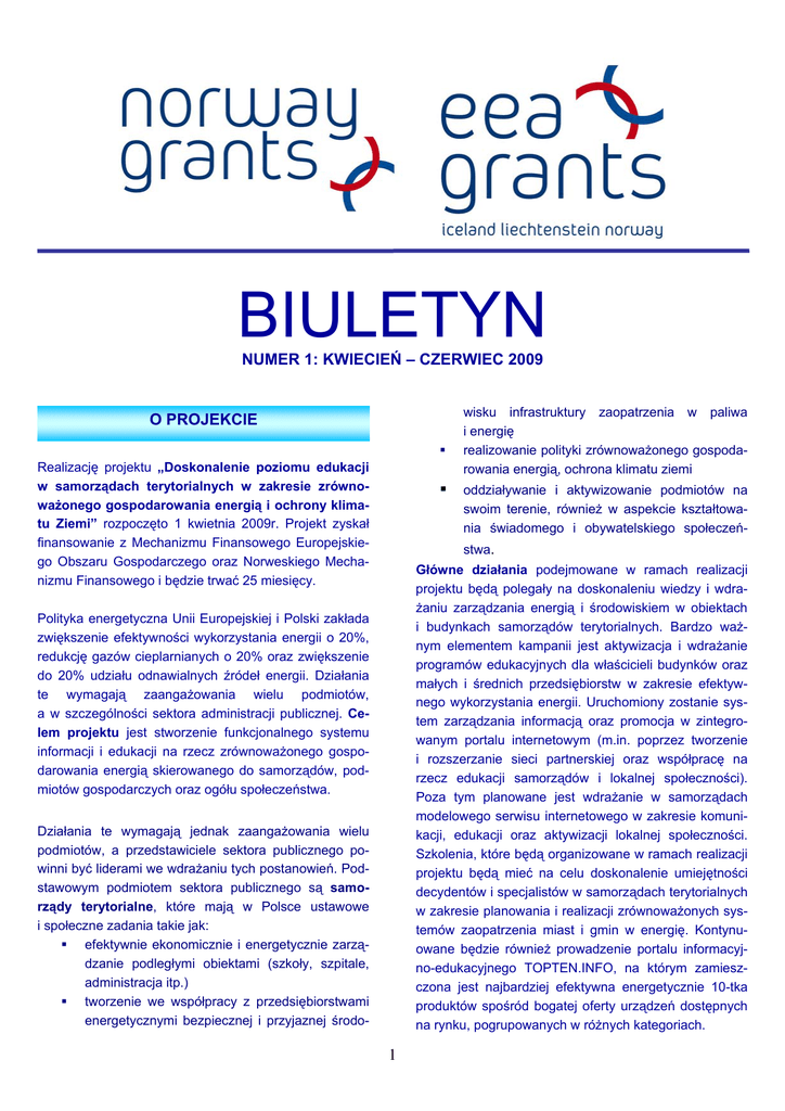 BIULETYN NUMER 1: KWIECIEŃ – CZERWIEC 2009 wisku infrastruktury zaopatrzenia w paliwa i energię realizowanie polityki zrównoważonego gospodarowania energią, ochrona klimatu ziemi O PROJEKCIE Realizację projektu „Doskonalenie poziomu edukacji w samorządach terytorialnych w zakresie zrównoważonego gospodarowania energią i ochrony klimatu Ziemi” rozpoczęto 1 kwietnia 2009r. Projekt zyskał finansowanie z Mechanizmu Finansowego Europejskiego Obszaru Gospodarczego oraz Norweskiego Mechanizmu Finansowego i będzie trwać 25 miesięcy. oddziaływanie i aktywizowanie podmiotów na swoim terenie, również w aspekcie kształtowania świadomego i obywatelskiego społeczeństwa. Główne działania podejmowane w ramach realizacji projektu będą polegały na doskonaleniu wiedzy i wdrażaniu zarządzania energią i środowiskiem w obiektach i budynkach samorządów terytorialnych. Bardzo ważnym elementem kampanii jest aktywizacja i wdrażanie programów edukacyjnych dla właścicieli budynków oraz małych i średnich przedsiębiorstw w zakresie efektywnego wykorzystania energii. Uruchomiony zostanie system zarządzania informacją oraz promocja w zintegrowanym portalu internetowym (m.in. poprzez tworzenie i rozszerzanie sieci partnerskiej oraz współpracę na rzecz edukacji samorządów i lokalnej społeczności). Poza tym planowane jest wdrażanie w samorządach modelowego serwisu internetowego w zakresie komunikacji, edukacji oraz aktywizacji lokalnej społeczności. Szkolenia, które będą organizowane w ramach realizacji projektu będą mieć na celu doskonalenie umiejętności decydentów i specjalistów w samorządach terytorialnych w zakresie planowania i realizacji zrównoważonych systemów zaopatrzenia miast i gmin w energię. Kontynuowane będzie również prowadzenie portalu informacyjno-edukacyjnego TOPTEN.INFO, na którym zamieszczona jest najbardziej efektywna energetycznie 10-tka produktów spośród bogatej oferty urządzeń dostępnych na rynku, pogrupowanych w różnych kategoriach. Polityka energetyczna Unii Europejskiej i Polski zakłada zwiększenie efektywności wykorzystania energii o 20%, redukcję gazów cieplarnianych o 20% oraz zwiększenie do 20% udziału odnawialnych źródeł energii. Działania te wymagają zaangażowania wielu podmiotów, a w szczególności sektora administracji publicznej. Celem projektu jest stworzenie funkcjonalnego systemu informacji i edukacji na rzecz zrównoważonego gospodarowania energią skierowanego do samorządów, podmiotów gospodarczych oraz ogółu społeczeństwa. Działania te wymagają jednak zaangażowania wielu podmiotów, a przedstawiciele sektora publicznego powinni być liderami we wdrażaniu tych postanowień. Podstawowym podmiotem sektora publicznego są samorządy terytorialne, które mają w Polsce ustawowe i społeczne zadania takie jak: efektywnie ekonomicznie i energetycznie zarządzanie podległymi obiektami (szkoły, szpitale, administracja itp.) tworzenie we współpracy z przedsiębiorstwami energetycznymi bezpiecznej i przyjaznej środo- 1 ków. Wskazany jest podział programu na takie elementy, których tytuły będą się wprost kwalifikować do funduszy pomocowych, np.: niska emisja, rewitalizacja, infrastruktura społeczna itp. ZARZĄDZANIE ENERGIĄ W SAMORZĄDACH Zarządzanie energią i środowiskiem w obiektach i budynkach użyteczności publicznej polega przede wszystkim na postawienie przed sobą celu zmniejszenia kosztów i zużycia energii oraz obciążenia środowiska naturalnego. Powinniśmy więc dążyć do osiągnięcia zadowalającego stanu usług energetycznych. Dlatego każde miasto, gmina powinny mieć wyznaczoną osobę odpowiedzialną za planowanie energetyczne gminy oraz efektywne wykorzystanie energii. Docelowo doprowadzi to do stworzenia odpowiednich warunków do rozpoczęcia programowych działań, by w długoterminowym podejściu zarządzanie mogło się samofinansować z efektów - z oszczędności kosztów paliw, energii i wody. W każdym samorządzie istnieją jakieś ograniczenia i bariery. Dlatego należy dostosować program do swoich możliwości, w tym finansowych. NARZĘDZIE RETScreen® International RETScreen® International stanowi uniwersalne narzędzie opracowane przy współpracy wielu ekspertów z rządu, przemysłu oraz uczelni. RETScreen® opracowywany jest również przy współpracy z organizacjami rządowymi i pozarządowymi: National Aeronauticus & Space Administration’s Langley Research Center Renewable Energy & Energy Efficiency Partnership Global Environment Facility UNEP lead Solar and Wind Resource Assessment United Nations Environment Programme’s; Energy Unit of the Division of Technology, Industry and Economics The Energy Environment Foundation Leonardo Energy Initiative World Bank’s Prototype Carbon Fund Wprowadzając system zarządzania można liczyć na same korzyści, bowiem: gospodarze województwa, starostwa, gminy zyskują społeczne uznanie za dobre gospodarowanie pieniędzmi publicznymi zaoszczędzone pieniądze można wydać na inne cele, wzrasta zapotrzebowanie na usługi, tworzą się nowe miejsca pracy i rozwijają się lokalne firmy, zmniejsza się obciążenie środowiska, efektywnie gospodarując paliwami i energią zwiększa się bezpieczeństwo energetyczne kraju i Europy, globalnie chroni się klimat ziemi. Wieloletni program to realizacja strategii zmniejszenia kosztów i zużycia energii w obiektach i budynkach. Należy wybrać najbardziej efektywną strategię, która przez dobre zarządzanie szybko doprowadzi do 10 - 15% zmniejszenia kosztów w sposób bez- i niskonakładowy, a następnie pieniądze będą wydawane na inwestycje według efektywnego biznes planu. Na terenie Polski szkolenia dla użytkowników narzędzi RetScreen® prowadzi Fundacja na rzecz Efektywnego Wykorzystania Energii. Organizacja jest autorem tłumaczeń materiałów edukacyjnych, które są dostępne na stronie www.retscreen.net oraz www.o