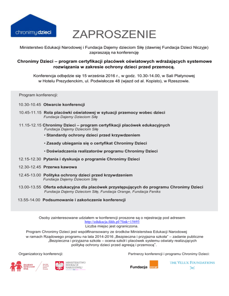 ZAPROSZENIE Ministerstwo Edukacji Narodowej i Fundacja Dajemy dzieciom Siłę (dawniej Fundacja Dzieci Niczyje) zapraszają na konferencję Chronimy Dzieci – program certyfikacji placówek oświatowych wdrażających systemowe rozwiązania w zakresie ochrony dzieci przed przemocą. Konferencja odbędzie się 15 września 2016 r., w godz. 10.30-14.00, w Sali Platynowej w Hotelu Prezydenckim, ul. Podwisłocze 48 (wjazd od al. Kopisto), w Rzeszowie. Program konferencji: 10.30-10.45 Otwarcie konferencji 10.45-11.15 Rola placówki oświatowej w sytuacji przemocy wobec dzieci Fundacja Dajemy Dzieciom Siłę 11.15-12.15 Chronimy Dzieci – program certyfikacji placówek edukacyjnych Fundacja Dajemy Dzieciom Siłę • Standardy ochrony dzieci przed krzywdzeniem • Zasady ubiegania się o certyfikat Chronimy Dzieci • Doświadczenia realizatorów programu Chronimy Dzieci 12.15-12.30 Pytania i dyskusja o programie Chronimy Dzieci 12.30-12.45 Przerwa kawowa 12.45-13.00 Polityka ochrony dzieci przed krzywdzeniem Fundacja Dajemy Dzieciom Siłę 13.00-13.55 Oferta edukacyjna dla placówek przystępujących do programu Chronimy Dzieci Fundacja Dajemy Dzieciom Siłę, Fundacja Orange, Fundacja Feniks 13.55-14.00 Podsumowanie i zakończenie konferencji Osoby zainteresowane udziałem w konferencji proszone są o rejestrację pod adresem http://edukacja.fdds.pl/?link=15693 Liczba miejsc jest ograniczona. Program Chronimy Dzieci jest współfinansowany ze środków Ministerstwa Edukacji Narodowej w ramach Rządowego programu na lata 2014-2016 „Bezpieczna i przyjazna szkoła” – zadanie publiczne „Bezpieczna i przyjazna szkoła – ocena szkół i placówek systemu oświaty realizujących politykę ochrony dzieci przed agresją i przemocą”. Organizatorzy konferencji: Partnerzy konferencji i programu Chronimy Dzieci: