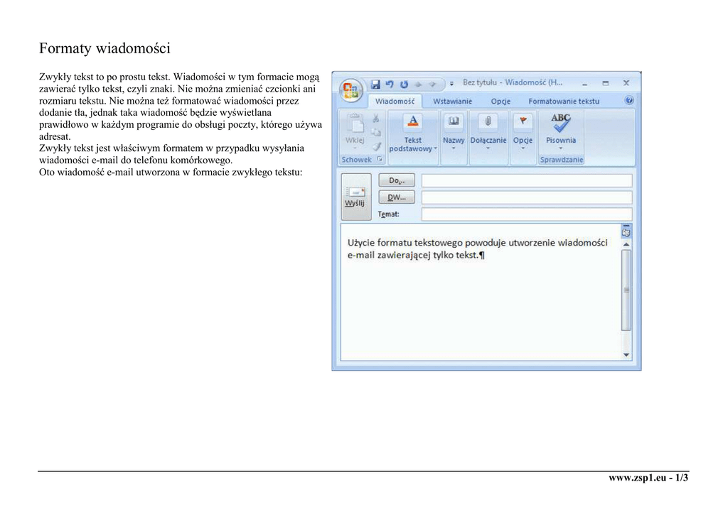 Formaty wiadomości Zwykły tekst to po prostu tekst. Wiadomości w tym formacie mogą zawierać tylko tekst, czyli znaki. Nie można zmieniać czcionki ani rozmiaru tekstu. Nie można też formatować wiadomości przez dodanie tła, jednak taka wiadomość będzie wyświetlana prawidłowo w każdym programie do obsługi poczty, którego używa adresat. Zwykły tekst jest właściwym formatem w przypadku wysyłania wiadomości e-mail do telefonu komórkowego. Oto wiadomość e-mail utworzona w formacie zwykłego tekstu: www.zsp1.eu - 1/3 HTML to język używany do tworzenia stron sieci Web. Używając tego formatu podczas tworzenia wiadomości e-mail, można formatować tekst i dodawać tło. W programie Outlook format HTML jest formatem domyślnym podczas tworzenia wiadomości e-mail. MIME (ang. Multipurpose Internet Mail Extensions) to standard stosowany przy przesyłaniu poczty elektronicznej (ang. e-mail). MIME definiuje budowę komunikatu poczty elektronicznej. Wiadomość w formacie MIME składa się z nagłówków i treści. Nagłówki określają różne parametry związane z przesyłaną wiadomością, takie jak nadawcę, temat, odbiorcę, rodzaj zawartości, kodowanie transportowe (określające sposób zamiany danych 8-bitowych — jak np. pliki binarne, zdjęcia, filmy, dźwięk — do formatu 7-bitowych danych w standardzie ASCII). Tradycyjny e-mail umożliwiał jedynie przesyłanie tekstu, który mógł być wydrukowany na drukarkach obsługujących 7-bitowy kod ASCII. Dlatego też konieczne jest zakodowanie danych 8-bitowych na dane 7-bitowe. Powoduje to zwiększenie długości tych danych. www.zsp1.eu - 2/3 From: [email protected] To: [email protected] Subject: =?iso-8859-2?Q?Czaplo=2C_czy_um=F3wisz_si=EA_ze_mn=B1=3F?= MIME-Version: 1.0 Content-Type: multipart/mixed; boundary="xxxToJestSeparator0000xxx" This is a message with multiple parts in MIME format. --xxxToJestSeparator0000xxx Content-Type: multipart/alternative; boundary="xxxToJestSeparatorZagniezdzony1111xxx" --xxxToJestSeparatorZagniezdzony1111xxx Content-Type: text/plain; charset="iso-8859-2" Content-Transfer-Encoding: quoted-printable To jest tre=B6=E6 wiadomo=B6ci. --xxxToJestSeparatorZagniezdzony1111xxx Content-Type: text/html; charset="iso-8859-2" Content-Transfer-Encoding: quoted-printable <!DOCTYPE HTML PUBLIC "-//W3C//DTD HTML 4.0 Transitional//EN"> <HTML><HEAD> <META http-equiv=3DContent-Type content=3D"text/html; charset=3Diso-8859-2"></HEAD> <BODY><FONT face=3DArial size=3D2>To jest tre=B6=E6 wiadomo=B6ci.</FONT></BODY></HTML> --xxxToJestSeparatorZagniezdzony1111xxx---xxxToJestSeparator0000xxx Content-Type: image/gif; name="obrazek.gif" Content-Transfer-Encoding: base64 Content-Disposition: attachment; filename="obrazek.gif" PGh0bWw+CiAgPGhlYWQ+CiAgPC9oZWFkPgogIDxib2R5PgogICAgPHA+VGhpcyBpcyB0aGUg Ym9keSBvZiB0aGUgbWVzc2FnZS48L3A+CiAgPC9ib2R5Pgo8L2h0bWw+Cg== --xxxToJestSeparator0000xxx-- www.zsp1.eu - 3/3