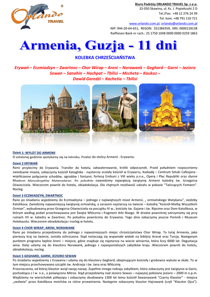 Biuro Podróży ORLANDO TRAVEL Sp. z o.o. 32-050 Skawina, ul. Ks. J. Popiełuszki 2 D Tel./Fax: +48 12 276 24 39 Tel. kom. +48 791 110 721 www.orlando.com.pl, [email protected] NIP: 944-20-64-651, REGON: 351384359, KRS: 0000118138 Raiffeisen Bank nr rach.: 25 1750 1048 0000 0000 0259 1863 KOLEBKA CHRZEŚCIJAŃSTWA Erywań – Eczmiadzyn – Zwartnoc – Chor Wirap – Areni – Norawank – Geghard – Garni – Jezioro Sewan – Sanahin – Hachpat – Tbilisi – Mccheta – Kaukaz – Dawid Garedżi – Kachetia – Tbilisi Dzień 1: WYLOT DO ARMENII O ustalonej godzinie spotykamy się na lotnisku. Przelot do stolicy Armenii - Erywania. Dzień 2 ERYWAŃ Rano przylecimy do Erywania. Transfer do hotelu, zakwaterowanie, krótki odpoczynek. Przed południem rozpoczniemy zwiedzanie miasta, zobaczymy kościół Katoghike - najstarszy ocalały kościół w Erywaniu, Kaskadę – Centrum Sztuki Cafesjana współczesne połączenie schodów, ogrodów i fontann; fortecę Erebuni z VIII wieku p.n.e., Operę i Plac Republiki oraz słynne Muzeum Manuskryptów Matenadaran. Po południu nawiedzimy największą świątynię Armenii katedrę św. Grzegorza Oświeciciela. Wieczorem powrót do hotelu, obiadokolacja. Dla chętnych możliwość udziału w pokazie ”Tańczących Fontann”. Nocleg. Dzień 3 ECZMIADZYN, ZWARTNOC Rano po śniadaniu wyjedziemy do Eczmiadzyna – jednego z najświętszych miast Armenii, „ ormiańskiego Watykanu”, siedziby Katolikosa. Zwiedzimy najważniejszą świątynię ormiańską, a zarazem najstarszą na świecie – katedrę ”Kościół-Matkę Wszystkich Ormian”, wybudowaną przez Grzegorza Oświeciciela na początku IV w., kościoły św. Gajane i św. Ripsime oraz Dom Katolikosa, w którym według podań przechowywana jest Święta Włócznia i fragment Arki Noego. W drodze powrotnej zatrzymamy się przy ruinach VII w. katedry w Zwartnoc. Po południu powrócimy do Erywania. Tego dnia zobaczymy jeszcze Pomnik i Muzeum Holokaustu. Wieczorem obiadokolacja i nocleg w hotelu. Dzień 4 CHOR WIRAP, ARENI, NORAWANK Rano po śniadaniu przejedziemy do jednego z najważniejszych miejsc chrześcijaństwa Chor Wirap. To tutaj Armenia, jako pierwszy kraj na świecie, została ochrzczona. Stąd roztaczają się wspaniałe widoki na biblijny Ararat oraz Turcję. Następnym punktem programu będzie Areni – miejsce, gdzie znajduje się najstarsza na wiecie winiarnia, która liczy 6000 lat. Degustacja wina. Dalej udamy się do klasztoru Norawank, jednego z najwspanialszych zabytków kraju. Wieczorem powrót do hotelu, obiadokolacja, nocleg. Dzień 5 GEGHARD, GARNI, JEZIORO SEWAN Po śniadaniu wyjedziemy z Erywania i udamy się do klasztoru Geghard, obejmującym kościoły i grobowce wykute w skale. To w tym miejscu przechowywano szczątki św. Andrzeja i św. Jana oraz Włócznię Przeznaczenia, od której klasztor wziął swoją nazwę. Zupełnie innego rodzaju zabytkiem, który zobaczymy jest świątynia w Garni, pochodząca z I w. n.e., a poświęcona Mitrze. Stąd przejedziemy nad Jezioro Sewan – najwyżej położone jezioro – 2000 m n.p.m. Wejdziemy na wierzchołek półwyspu i zobaczymy zbudowany 1300 lat temu kościół Sewanawank ”Czarny Klasztor” - miejsce „zesłania” przez Katolikosa mnichów za różne przewinienia. Następnie zobaczymy klasztor Hajrawank (czyli "Klasztor Ojca"). Biuro Podróży ORLANDO TRAVEL Sp. z o.o. 32-050 Skawina, ul. Ks. J. Popiełuszki 2 D Tel./Fax: +48 12 276 24 39 Tel. kom. +48 791 110 721 www.orlando.com.pl, [email protected] NIP: 944-20-64-651, REGON: 351384359, KRS: 0000118138 Raiffeisen Bank nr rach.: 25 1750 1048 0000 0000 0259 1863 W drodze do hotelu zatrzymamy się przy kompleksie klasztornym, ukrytym w lesie, Hagarcin w Diliżan. Wieczorem zakwaterowanie w hotelu, obiadokolacja, nocleg. Dzień 6 SANAHIN, HACHPAT Rano po śniadaniu przejedziemy do klasztorów Sanahin z X w oraz Hachpat będących przykładem najznamienitszej ormiańskiej, średniowiecznej architektury. Te dwa kompleksy klasztorne (wpisane na Listę UNESCO) były ośrodkami naukowymi. Klasztory te znajdują się na północy Armenii, na granicy z Gruzją w granicach Aławerdy – miasta ”darowanego przez Boga” - położonego malowniczo na stromych zboczach kanionu. Następnie przejedziemy do Gruzji. Obiadokolacja i nocleg w hotelu w Tbilisi. Dzień 7 TBILISI Po śniadaniu zwiedzanie miasta rozpoczniemy od nawiedzenia kościoła świętych Piotra i Pawła oraz największej budowli sakralnej Gruzji - soboru katedralnego Trójcy Świętej, będącego siedzibą Katolikosa. Następnie zobaczymy cerkiew i most Metechi, przejdziemy do dzielnicy łaźni tureckich, aby zobaczyć górującą nad miastem twierdzę Narikala (IV w), później cerkiew Mama Dżwari, cerkiew Sioni (VI w.) z oryginałem krzyża św. Nino i relikwiami apostoła Tomasza. Dzień zakończymy na Alei Rustaweliego – reprezentacyjnym bulwarze stolicy. Kolacja. Dla chętnych spacer po ”Nocnym Tbilisi”. Nocleg. Dzień 8 MCCHETA Rano śniadanie. Następnie wyjedziemy do Mcchety, dawnej stolicy Gruzji i kolebki jej chrześcijaństwa. Nawiedzimy cerkiew Dżwari na pionowej skale, Monaster Samtawro – wybudowany w IV wieku przez króla Miriana, na miejscu pierwszej siedziby św. Nino oraz katedrę Sweticchoweli – byłą rezydencję Katolikosów. Obecna budowla, jest miejscem przechowywania wielkiej świętości – Chitonu Zbawiciela. Dzięki temu Mcchetę nazywają ”Drugą Jerozolimą”. Oprócz tego znajduje się tu płaszcz proroka Eliasza i stopa apostoła Andrzeja. Na zakończenie nawiedzimy Monaster Szio-Mgwime, gdzie najważniejszą budowlą jest cerkiew św. Jana Chrzciciela z VI w. Z tego samego okresu pochodzą też cele, wykute przez mnichów w pionowej skale. Powrót do Tbilisi. Kolacja. Nocleg. Dzień 9 KAUKAZ Śniadanie. Po nim wyjazd ”Gruzińską Drogą Wojenną” w kierunku Kazbegi, łączącą Tbilisi z Rosją. Po drodze zobaczymy Ananuri jeden z najważniejszych z