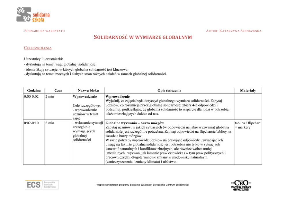 SCENARIUSZ WARSZTATU AUTOR: KATARZYNA SZENIAWSKA SOLIDARNOŚĆ W WYMIARZE GLOBALNYM CELE SZKOLENIA Uczestnicy i uczestniczki: - dyskutują na temat wagi globalnej solidarności - identyfikują sytuacje, w których globalna solidarność jest kluczowa - dyskutują na temat mocnych i słabych stron różnych działań w ramach globalnej solidarności. Godzina 0:00-0:02 0:02-0:10 Czas Nazwa bloku 2 min Wprowadzenie 8 min Cele szczegółowe: - wprowadzenie uczniów w temat zajęć - wskazanie sytuacji szczególnie wymagających globalnej solidarności Opis ćwiczenia Materiały Wprowadzenie Wyjaśnij, że zajęcia będą dotyczyć globalnego wymiaru solidarności. Zapytaj uczniów, co rozumieją przez globalną solidarność; zbierz 4-5 odpowiedzi i podsumuj, podkreślając, że globalna solidarność to wsparcie dla ludzi w potrzebie, także mieszkających daleko od nas. Globalne wyzwania – burza mózgów Zapytaj uczniów, w jakich sytuacjach (w odpowiedzi na jakie wyzwania) globalna solidarność jest szczególnie potrzebna. Zapisuj odpowiedzi na flipcharcie/tablicy na zasadzie burzy mózgów. W razie potrzeby naprowadź uczniów na brakujące odpowiedzi, zwracając ich uwagę na fakt, że globalna solidarność jest potrzebna nie tylko w sytuacjach katastrof naturalnych i konfliktów zbrojnych, ale również wobec mniej „medialnych” wyzwań, jak łamanie praw człowieka (w tym praw politycznych i pracowniczych), długoterminowe zmiany w środowisku naturalnym (zanieczyszczenia i zmiany klimatu) i ubóstwo. Współorganizatorem programu Solidarna Szkoła jest Europejskie Centrum Solidarności. tablica / flipchart + markery 0:10-0:30 2 min – wprowadzenie 10 min – praca w grupach 8 min – omówienie Globalna solidarność w działaniu Cele szczegółowe: - zachęcenie uczniów do refleksji nad tym, jak ważna jest globalna solidarność i jakiego typu działania są jej wyrazem; - zachęcenie uczniów do 10-15 kartek A4 Dlaczego globalnie, a nie tylko lokalnie? Podziel uczniów na 3-4 osobowe grupy i każdej grupie rozdaj po kartce A4. Poproś, markery aby każda grupa wypisała 3-4 przyczyny, dla których globalna solidarność jest tak ważna (dlaczego czasem wsparcie na poziomie lokalnym lub narodowym nie wystarcza). Daj grupom 10 min na wykonanie zadania. Po zakończeniu pracy w grupach poproś uczniów, aby ułożyli kartki na podłodze w środku sali tak, aby były widoczne dla wszystkich. Poproś o kilka komentarzy. Czy uczniowie zgadzają się z pomysłami kolegów? Może ktoś wpadł na nową myśl? Podsumuj, podkreślając, że niektóre wyzwania wymagają globalnego wsparcia ze względu na skalę (np. niektóre katastrofy naturalne), brak wsparcia w kraju (np. represje wobec pewnej grupy etnicznej albo walka z opresyjnym reżimem) oraz globalny wymiar przyczyn problemu (wiele wyzwań ekologicznych, ale też np. walka o prawa pracownicze). Zaznacz, że globalna solidarność może wiązać się z poczuciem odpowiedzialności wobec szerokich skutków naszych działań. Współorganizatorem programu Solidarna Szkoła jest Europejskie Centrum Solidarności. 0:30-0:50 2 min – wprowadzenie 5 min – praca indywidualna 3 min – porządkowanie karteczek 10 min – podsumowanie analizy mocnych i słabych stron różnych rozwiązań. karteczki Globalna solidarność w działaniu Rozdaj uczniom samoprzylepne karteczki i długopisy. Poproś, żeby każdy przyjrzał samoprzylepne się raz jeszcze wyzwaniom zebranym podczas pierwszego ćwiczenia i wypisał długopisy maksimum 3 przykłady działań podejmowanych w odpowiedzi na nie (np. zbiórki darów, podpisywanie petycji etc.) – po jednym przykładzie na każdej karteczce. Daj uczniom 5 min na to zadanie. Poproś, aby każdy, kto skończy, w ciszy podszedł do tablicy i przykleił tam swoje karteczki. Porządkuj karteczki na bieżąco w grupy o podobnym temacie. Podsumuj odpowiedzi, wymieniając różne rodzaje działań. W razie potrzeby uzupełnij je i zwróć uwagę na różnorodność rozwiązań i ich zależność od rodzaju problemu. Przykłady odpowiedzi: indywidualne wsparcie finansowe i rzeczowe (np. zbiórki pieniędzy i darów dla osób poszkodowanych w trzęsieniu ziemi, adopcja na odległość) podpisywanie petycji i listów (np. w sprawie więźniów politycznych) świadoma konsumpcja (np. bojkot produktów firmy łamiącej prawa pracownicze) świadome obywatelstwo (np. podpisywanie petycji do rządu w sprawie przeciwdziałania zmianom klimatu, głosowanie na partie, które wspierają takie działania) pomoc rozwojowa (np. wsparcie budżetowe dla krajów o niższych dochodach, wsparcie działań organizacji międzynarodowych, projekty organizacji pozarządowych np. budujących szkoły, studnie, prowadzących szkolenia etc.) interwencja militarna (np. interwencja w Iraku, interwencja w Libii). Współorganizatorem programu Solidarna Szkoła jest Europejskie Centrum Solidarności. 0:50 - 1:25 2 min – wprowadzenie 20 min – praca w grupach 13 min – prezentacje i omówienie 1:25-1:30 Mocne i słabe strony Podziel uczniów na 4 grupy. Każdej grupie wręcz jeden artykuł. Poproś, aby przeczytali artykuł i na jego podstawie (korzystając też z własnej wiedzy i przemyśleń) zapisali na flipcharcie mocne i słabe strony działania, o którym opowiada artykuł. Co sprawia, że działanie jest skuteczne? Co ogranicza jego skuteczność? Poproś, aby przedstawiciele wszystkich grup krótko zaprezentowali wyniki pracy. Podsumuj ćwiczenie, zwracając uwagę, że nawet przy najlepszych chęciach wszystkie działania mają swoje mocne i słabe strony, a w niektórych przypadkach mogą nawet czynić więcej szkody niż pożytku. Warto więc angażować się z głową. Zakończenie 4 wydrukowane artykuły (lub zestawy artykułów) 4 flipcharty markery Podsumuj zajęcia. Jeśli wystarczy czasu, poproś uczniów o kilka wypowiedzi – spytaj, czego nowego dowiedzieli się lub co ich zaskoczyło w trakcie zajęć. Łącz
