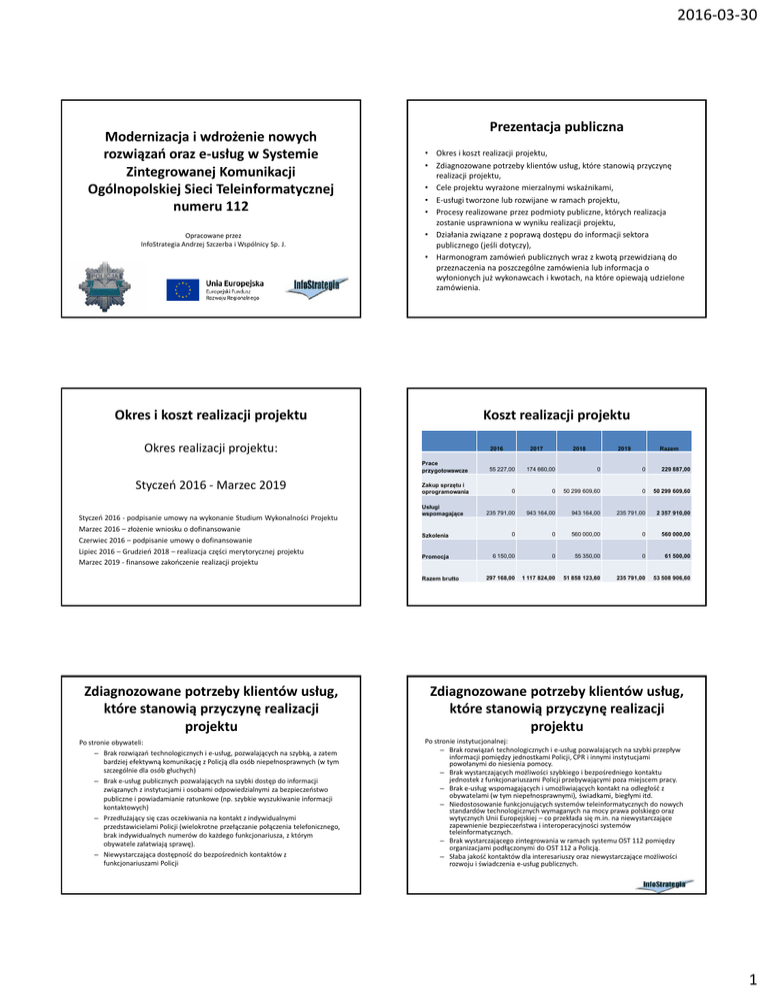 2016-03-30 Modernizacja i wdrożenie nowych rozwiązań oraz e-usług w Systemie Zintegrowanej Komunikacji Ogólnopolskiej Sieci Teleinformatycznej numeru 112 Opracowane przez InfoStrategia Andrzej Szczerba i Wspólnicy Sp. J. Prezentacja publiczna • Okres i koszt realizacji projektu, • Zdiagnozowane potrzeby klientów usług, które stanowią przyczynę realizacji projektu, • Cele projektu wyrażone mierzalnymi wskaźnikami, • E-usługi tworzone lub rozwijane w ramach projektu, • Procesy realizowane przez podmioty publiczne, których realizacja zostanie usprawniona w wyniku realizacji projektu, • Działania związane z poprawą dostępu do informacji sektora publicznego (jeśli dotyczy), • Harmonogram zamówień publicznych wraz z kwotą przewidzianą do przeznaczenia na poszczególne zamówienia lub informacja o wyłonionych już wykonawcach i kwotach, na które opiewają udzielone zamówienia. Okres i koszt realizacji projektu Koszt realizacji projektu Okres realizacji projektu: Styczeń 2016 - Marzec 2019 Styczeń 2016 - podpisanie umowy na wykonanie Studium Wykonalności Projektu Marzec 2016 – złożenie wniosku o dofinansowanie Czerwiec 2016 – podpisanie umowy o dofinansowanie Lipiec 2016 – Grudzień 2018 – realizacja części merytorycznej projektu Marzec 2019 - finansowe zakończenie realizacji projektu 2016 2017 2018 2019 Razem Prace przygotowawcze 55 227,00 174 660,00 0 0 229 887,00 Zakup sprzętu i oprogramowania 0 0 50 299 609,60 0 50 299 609,60 235 791,00 943 164,00 943 164,00 235 791,00 2 357 910,00 Szkolenia 0 0 560 000,00 0 560 000,00 Promocja 6 150,00 0 55 350,00 0 61 500,00 297 168,00 1 117 824,00 51 858 123,60 235 791,00 53 508 906,60 Usługi wspomagające Razem brutto Zdiagnozowane potrzeby klientów usług, które stanowią przyczynę realizacji projektu Zdiagnozowane potrzeby klientów usług, które stanowią przyczynę realizacji projektu Po stronie obywateli: – Brak rozwiązań technologicznych i e-usług, pozwalających na szybką, a zatem bardziej efektywną komunikację z Policją dla osób niepełnosprawnych (w tym szczególnie dla osób głuchych) – Brak e-usług publicznych pozwalających na szybki dostęp do informacji związanych z instytucjami i osobami odpowiedzialnymi za bezpieczeństwo publiczne i powiadamianie ratunkowe (np. szybkie wyszukiwanie informacji kontaktowych) – Przedłużający się czas oczekiwania na kontakt z indywidualnymi przedstawicielami Policji (wielokrotne przełączanie połączenia telefonicznego, brak indywidualnych numerów do każdego funkcjonariusza, z którym obywatele załatwiają sprawę). – Niewystarczająca dostępność do bezpośrednich kontaktów z funkcjonariuszami Policji Po stronie instytucjonalnej: – Brak rozwiązań technologicznych i e-usług pozwalających na szybki przepływ informacji pomiędzy jednostkami Policji, CPR i innymi instytucjami powołanymi do niesienia pomocy. – Brak wystarczających możliwości szybkiego i bezpośredniego kontaktu jednostek z funkcjonariuszami Policji przebywającymi poza miejscem pracy. – Brak e-usług wspomagających i umożliwiających kontakt na odległość z obywatelami (w tym niepełnosprawnymi), świadkami, biegłymi itd. – Niedostosowanie funkcjonujących systemów teleinformatycznych do nowych standardów technologicznych wymaganych na mocy prawa polskiego oraz wytycznych Unii Europejskiej – co przekłada się m.in. na niewystarczające zapewnienie bezpieczeństwa i interoperacyjności systemów teleinformatycznych. – Brak wystarczającego zintegrowania w ramach systemu OST 112 pomiędzy organizacjami podłączonymi do OST 112 a Policją. – Słaba jakość kontaktów dla interesariuszy oraz niewystarczające możliwości rozwoju i świadczenia e-usług publicznych. 1 2016-03-30 Cel główny (CG) zostanie zrealizowany poprzez cele szczegółowe (CS): Cel główny projektu brzmi: Poprawa bezpieczeństwa publicznego poprzez usprawnienie komunikacji i udostępnienie nowych e-usług dla obywateli i administracji publicznej w ramach SZK OST 112 • Poprawa dostępu do e-usług publicznych dla obywateli w ramach SZK OST 112 ze szczególnym uwzględnieniem potrzeb osób niepełnosprawnych (poprzez wdrożenie usług A2C) • Poprawa komunikacji między pracownikami Policji, poszczególnymi jednostkami i komórkami instytucji powołanych do niesienia pomocy (poprzez wdrożenie usług A2A) • Zwiększenie możliwości świadczenia nowych e-usług publicznych prze jednostki publiczne dzięki wdrożenie nowych e-usług A2A. • Dostosowanie infrastruktury systemów teleinformatycznych w celu umożliwienia uruchomienia nowych e-usług w SZK OST 112. Wskaźniki realizacji projektu Wskaźnik oddziaływania Nazwa wskaźnika Jednostk Wartość a miary bazowa Odsetek osób korzystających % z internetu w kontaktach z administracją publiczną Wartość docelowa Jednostk Wartość a miary bazowa Liczba załatwionych spraw szt. poprzez udostępnioną on-line usługę publiczną Jednostk Wartość a miary bazowa 0 Wartość docelowa 46,2 0 Wskaźniki rezultatu bezpośredniego - Wskaźniki specyficzne dla projektu Liczba podmiotów sektora Szt. publicznego korzystających z wdrożonych e-usług A2A Wskaźniki rezultatu bezpośredniego - Wskaźniki specyficzne dla programu Nazwa wskaźnika Wskaźniki realizacji projektu Nazwa wskaźnika Wskaźniki realizacji projektu Wartość docelowa 4 0 6 017 000 Wskaźniki realizacji projektu Wskaźniki kluczowe - produktu Nazwa wskaźnika Jednostka miary Liczba usług publicznych udostępnionych on-line o stopniu szt. dojrzałości 3 dwustronna interakcja Liczba usług publicznych udostępnionych on-line o stopniu szt. dojrzałości co najmniej 4 - transakcja Liczba udostępnionych usług wewnątrzadministracyjnych szt. (A2A) Wartość docelowa 1 Przestrzeń dyskowa serwerowni 120 TB 5 7 Liczba uruchomionych systemów teleinformatycznych w szt. podmiotach wykonujących zadania publiczne 1 Liczba pracowników