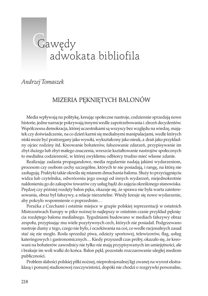 GGawędy adwokata bibliofila Andrzej Tomaszek Mizeria pękniętych balonów Media wpływają na politykę, kreując społeczne nastroje, codziennie sprzedają nowe historie, jedne narracje pokrywają innymi wedle zapotrzebowania i zleceń decydentów. Współczesna demokracja, której uczestnikami są wszyscy bez względu na wiedzę, majątek czy doświadczenie, na co dzień karmi się medialnymi manipulacjami, wedle których niski może być postrzegany jako wysoki, wykształcony jako nieuk, a drań jako przykładny ojciec rodziny itd. Kreowanie bohaterów, fałszowanie zdarzeń, przypisywanie im zbyt dużego lub zbyt małego znaczenia, wreszcie kształtowanie nastrojów społecznych to medialna codzienność, w której zwykłemu odbiorcy trudno mieć własne zdanie. Realizując zadania propagandowe, media regularnie nadają jakimś wydarzeniom, procesom czy osobom cechy szczególne, których te nie posiadają, i rangę, na którą nie zasługują. Praktyki takie określa się mianem dmuchania balonu. Służy to przyciągnięciu widza lub czytelnika, odwróceniu jego uwagi od innych wydarzeń, niejednokrotnie nakłonieniu go do zakupów towarów czy usług bądź do zajęcia określonego stanowiska. Prędzej czy później rozdęty balon pęka, okazuje się, że sprawa nie była warta zainteresowania, obraz był fałszywy, a relacje nierzetelne. Wtedy kreuje się nowe wydarzenie, aby pokryło wspomnienie o poprzednim… Porażka z Czechami i ostatnie miejsce w grupie polskiej reprezentacji w ostatnich Mistrzostwach Europy w piłce nożnej to najlepszy w ostatnim czasie przykład pęknięcia rozdętego balonu medialnego. Tygodniami budowano w mediach fałszywy obraz zespołu, przypisując mu wiele pozytywnych cech, których nie posiadał. Podgrzewano nastroje dumy z tego, czego nie było, i oczekiwania na coś, co wedle racjonalnych zasad stać się nie mogło. Rosła sprzedaż piwa, odzieży sportowej, telewizorów, flag, usług kateringowych i gastronomicznych… Kiedy przyszedł czas próby, okazało się, że kreowani na bohaterów zawodnicy nie tylko nie mają przypisywanych im umiejętności, ale i brakuje im woli walki do końca. Balon pękł, pozostało rozczarowanie uległej mediom publiczności. Problem słabości polskiej piłki nożnej, nieprofesjonalnej ligi zwanej na wyrost ekstraklasą i ponurej stadionowej rzeczywistości, dopóki nie chodzi o rozgrywki personalne, 218 7–8/2012 Mizeria pękniętych balonów dopóki prokurator nie stawia zarzutów bądź dopóki nie poleje się krew, nie jest dla mediów wystarczająco atrakcyjnym tematem. Inny rozdęty balon to kwestia rzekomej potrzeby zmian językowych jako konsekwencja zmian kulturowych. Werbalnym harcom polityków i celebrytów wokół rzeczowników próbuje się nadawać głębsze uzasadnienie społeczne i ideologiczne. Urocza pani doktor nauk ekonomicznych, członek Rady Ministrów zajmujący się sportem, z powagą sugeruje, żeby zwracać się do niej „pani ministro”. Na poważnej konferencji dysktutanci tak właśnie zwracają się do pani zajmującej stanowisko pełnomocnika rządu ds. równouprawnienia. Zwrotowi „pani ministro” przypisuje się właściwości światopoglądowe, o czym szeroko informują media. Ten, kto tak mówi, jest co najmniej poprawny politycznie, wolny od fobii i uprzedzeń. Ten, kto używa zgodnego z gramatyką zwrotu „pani minister”, musi się tłumaczyć ze swoich intencji. I oto sprawa staje się warta szerokiej dyskusji. Gwałt na gramatyce traci na znaczeniu wobec potrzeby spełnienia artykułowanych krzykiem żądań. Jeśli gramatyka nie nadąża, tym gorzej dla gramatyki! Czy będziemy zatem już niedługo mówić: adwokatka, mecenaska, kuratorka, komornika (komorniczka?), referendarka, rejentka czy inżynierka? W jednej z rozgłośni radiowych przekonują nas do używania nazw: psycholożka, filozofka, socjolożka. W rozgłośni tej nie ma redaktora naczelnego, ale jest redaktor naczelna, co per analogiam uprawniałoby do mówienia, że mężczyzna to ssak naczelny, a kobieta to ssak naczelna. Całkiem sensowne postulaty zmierzające do osłabienia występujących niekiedy patriarchalnych praktyk przekształcają się we własną karykaturę. Może warto przekłuć ten balon? Inny balon – najbliższy naszemu życiu zawodowemu – to deregulacja. Wspaniałe, sztandarowe hasło aktualnie rządzących polityków, którego realizacja sprowadzi się w jednych obszarach do pozorów liberalizacji, a w innych do wywołania niebezpiecznego w skutkach społecznych bałaganu. Dla mediów to niemal samograj z wyraźnie określonymi stronami – dobrym ministrem i korporacjami zła, których macki sięgają do gabinetów władzy, lobbując za zachowaniem nieuzasadnionych przywilejów. Deregulacja to lek na to zło. „To prawdziwe trzęsienie ziemi w korporacjach i stowarzyszeniach zawodowych, od kilku dziesięcioleci zabarykadowanych na swoich pozycjach i czerpiących z tego niezłe profity” – czytamy w artykule Krystyny Doliniak pt. Polska w deregulacji, zamieszonym w czerwcowym numerze czasopisma „Forbes” w dziale „Wydarzenia”. Na uzasadnienie tezy, jak niecnie postępują adwokaci i jaki panuje u nich nepotyzm, autorka pisze: „Sposoby obrony przed niepożądanymi konkurentami w przypadku lukratywnych profesji są dość wyrafinowane. Na egzaminie na aplikację adwokacką w Warszawie kandydaci z prowincji nie mieli szans – jedno pytanie brzmiało: «Gdzie mieściła się pierwsza siedziba klubu Hybrydy?». Traf chciał, że było to na ulicy Mokotowskiej, tuż obok siedziby Okręgowej Rady Adwokackiej, więc dla kandydatów rodzinnie związanych z adwokaturą odpowiedź na to pytanie była dziecinnie prosta”. Uff, co zdanie, to przekłamanie. Po pierwsze, Okręgowa Rada Adwokacka w Warszawie przeprowadziła ostatni ustny egzamin na aplikację w 2003 roku, czyli dziewięć lat temu, potem organizację egzaminów przejęło Ministerstwo Sprawiedliwości i czyn