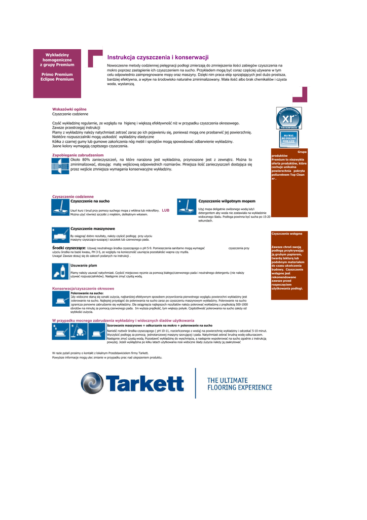 Wykładziny homogeniczne z grupy Premium Primo Premium Eclipse Premium Instrukcja czyszczenia i konserwacji Nowoczesne metody codziennej pielęgnacji podłogi zmierzają do zmniejszenia ilości zabiegów czyszczenia na mokro poprzez zastąpienie ich czyszczeniem na sucho. Przykładem mogą być coraz częściej używane w tym celu odpowiednio zaimpregnowane mopy oraz maszyny. Dzięki nim praca ekip sprzątających jest dużo prostsza, bardziej efektywna, a wpływ na środowisko naturalne zminimalizowany. Mała ilość albo brak chemikaliów i czysta woda, wystarczą. Wskazówki ogólne Czyszczenie codzienne Czyść wykładzinę regularnie, ze względu na higienę i większą efektywność niż w przypadku czyszczenia okresowego. Zawsze przestrzegaj instrukcji Plamy z wykładziny należy natychmiast zetrzeć zaraz po ich pojawieniu się, ponieważ mogą one przebarwić jej powierzchnię. Niektóre rozpuszczalniki mogą uszkodzić wykładziny elastyczne Kółka z czarnej gumy lub gumowe zakończenia nóg mebli i sprzętów mogą spowodować odbarwienie wykładziny. Jasne kolory wymagają częstszego czyszczenia. Zapobieganie zabrudzeniom Około 80% zanieczyszczeń, na które narażona jest wykładzina, przynoszone jest z zewnątrz. Można to zminimalizować, stosując matę wejściową odpowiednich rozmiarów. Mniejsza ilość zanieczyszczeń dostająca się przez wejście zmniejsza wymagania konserwacyjne wykładziny. Czyszczenie codzienne Czyszczenie na sucho Grupa produktów Premium to niezwykła oferta produktów, które cechuje unikalna powierzchnia pokryta poliuretnem Top Clean xr . Czyszczenie wilgotnym mopem Usuń kurz i brud przy pomocy suchego mopa z włókna lub mikrofibry. Można użyć również szczotki z miękkim, delikatnym włosiem. LUB Użyj mopa deligatnie zwilżonego wodą lub/i detergentem aby woda nie zostawiała na wykładzinie widocznego śladu. Podłoga powinna być sucha po 15-20 sekundach. Czyszczenie maszynowe Czyszczenie wstępne By osiągnąć dobre rezultaty, należy czyścić podłogę przy użyciu maszyny czyszcząco-suszącej i szczotek lub czerwonego pada. Środki czyszczące: Używaj neutralnego środka czyszczącego o pH 5-9. Pomieszczenia sanitarne mogą wymagać czyszczenia przy użyciu środka na bazie kwasu, PH 3-5, ze względu na konieczność usunięcia pozostałości wapna czy mydła. Uwaga! Zawsze stosuj się do zaleceń podanych na instrukcji . Usuwanie plam Plamy należy usuwać natychmiast. Czyścić miejscowo ręcznie za pomocą białego/czerwonego pada i neutralnego detergentu (nie należy używać rozpuszczalników). Następnie zmyć czystą wodą. Konserwacja/czyszczenie okresowe NIE MA KONIECZNOŚCI AKRYLOWANIA PODŁOGI ! Polerowanie na sucho: Gdy widoczne staną się oznaki zużycia, najbardziej efektywnym sposobem przywrócenia pierwotnego wyglądu powierzchni wykładziny jest polerowanie na sucho. Najlepiej przystąpić do polerowania na sucho zaraz po czyszczeniu maszynowym wykładziny. Polerowanie na sucho ogranicza ponowne zabrudzenie się wykładziny. Dla osiągnięcia najlepszych rezultatów należy polerować wykładzinę z prędkością 500-1000 obrotów na minutę za pomocą czerwonego pada. Im wyższa prędkość, tym większy połysk. Częstotliwość polerowania na sucho zależy od szybkości zużycia. W przypadku mocnego zabrudzenia wykładziny i widocznych śladów użytkowania Szorowanie maszynowe + odkurzanie na mokro + polerowanie na sucho Nanieść roztwór środka czyszczącego ( pH 10-11, rozcieńczonego z wodą) na powierzchnię wykładziny i odczekać 5-10 minut. Wyczyścić podłogę za pomocą jednotarczowej maszyny szorującej i pada. Natychmiast zebrać brudną wodę odkurzaczem. Następnie zmyć czystą wodą. Pozostawić wykładzinę do wyschnięcia, a następnie wypolerować na sucho zgodnie z instrukcją powyżej. Jeżeli wykłądzina po kilku latach użytkowania nosi widoczne ślady zużycia należy ją zaakrylować W razie pytań prosimy o kontakt z lokalnym Przedstawicielem firmy Tarkett. Powyższe informacje mogą ulec zmianie w przypadku prac nad ulepszeniem produktu. Zawsze chroń swoją podłogę przykrywając ją grubym papierem, twardą tekturą lub podobnym materiałem do czasu ukończenia budowy. Czyszczenie wstępne jest rekomendowane zawsze przed rozpoczęciem użytkowania podłogi.