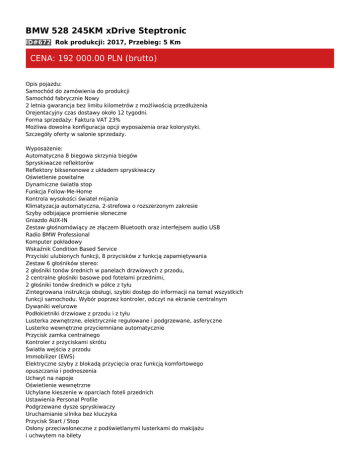 BMW 528 245KM xDrive Steptronic ID#672 Rok produkcji: 2017, Przebieg: 5 Km CENA: 192 000.00 PLN (brutto) Opis pojazdu: Samochód do zamówienia do produkcji Samochód fabrycznie Nowy 2 letnia gwarancja bez limitu kilometrów z możliwością przedłużenia Orejentacyjny czas dostawy około 12 tygodni. Forma sprzedaży: Faktura VAT 23% Możliwa dowolna konfiguracja opcji wyposażenia oraz kolorystyki. Szczegóły oferty w salonie sprzedaży. Wyposażenie: Automatyczna 8 biegowa skrzynia biegów Spryskiwacze reflektorów Reflektory biksenonowe z układem spryskiwaczy Oświetlenie powitalne Dynamiczne światła stop Funkcja Follow-Me-Home Kontrola wysokości świateł mijania Klimatyzacja automatyczna, 2-strefowa o rozszerzonym zakresie Szyby odbijające promienie słoneczne Gniazdo AUX-IN Zestaw głośnomówiący ze złączem Bluetooth oraz interfejsem audio USB Radio BMW Professional Komputer pokładowy Wskaźnik Condition Based Service Przyciski ulubionych funkcji, 8 przycisków z funkcją zapamiętywania Zestaw 6 głośników stereo: 2 głośniki tonów średnich w panelach drzwiowych z przodu, 2 centralne głośniki basowe pod fotelami przednimi, 2 głośniki tonów średnich w półce z tyłu Zintegrowana instrukcja obsługi, szybki dostęp do informacji na temat wszystkich funkcji samochodu. Wybór poprzez kontroler, odczyt na ekranie centralnym Dywaniki welurowe Podłokietniki drzwiowe z przodu i z tyłu Lusterka zewnętrzne, elektrycznie regulowane i podgrzewane, asferyczne Lusterko wewnętrzne przyciemniane automatycznie Przycisk zamka centralnego Kontroler z przyciskami skrótu Światła wejścia z przodu Immobilizer (EWS) Elektryczne szyby z blokadą przycięcia oraz funkcją komfortowego opuszczania i podnoszenia Uchwyt na napoje Oświetlenie wewnętrzne Uchylane kieszenie w oparciach foteli przednich Ustawienia Personal Profile Podgrzewane dysze spryskiwaczy Uruchamianie silnika bez kluczyka Przycisk Start / Stop Osłony przeciwsłoneczne z podświetlanymi lusterkami do makijażu i uchwytem na bilety Uchwyty w bagażniku z czterema mocowaniami Dodatkowe gniazda 12 V - w podłokietniku z przodu - po stronie pasażera - w bagażniku Czujnik deszczu z automatyczną kontrolą świateł mijania Poduszki powietrzne dla kierowcy i pasażera System zapobiegający blokowaniu się kół podczas hamowania (ABS) Asystent hamowania Czujnik kolizji Dwutonowy klakson Układ dynamicznej kontroli stabilności (DSC) z asystentem ruszania Poduszki powietrzne chroniące głowę z przodu i z tyłu Boczne poduszki powietrzne dla kierowcy i pasażera z przodu Niniejsze ogłoszenie jest wyłącznie informacją handlową i nie stanowi oferty w myśl art. 66, § 1. Kodeksu Cywilnego.Sprzedający nie odpowiada za ewentualne błedy lub nieaktualność ogłoszenia. Informacje umieszczone w ogłoszeniu, służą jedynie celom informacyjnym. GRUPA PRO-CAR Sp. z o.o. Niezależny Dealer Audi i Volvo 03-128 Warszawa, ul. Świderska 109F lok. 7 NIP: 524-26-19-332, REGON: 1410664403, KRS: 0000286534 Sąd Rejonowy dla M. St. Warszawy w Warszawie, XIII Wydział Gospodarczy KRS Salon: 05-090 Warszawa - Janki, ul. Sezamkowa 2, tel. (22) 711 64 64
