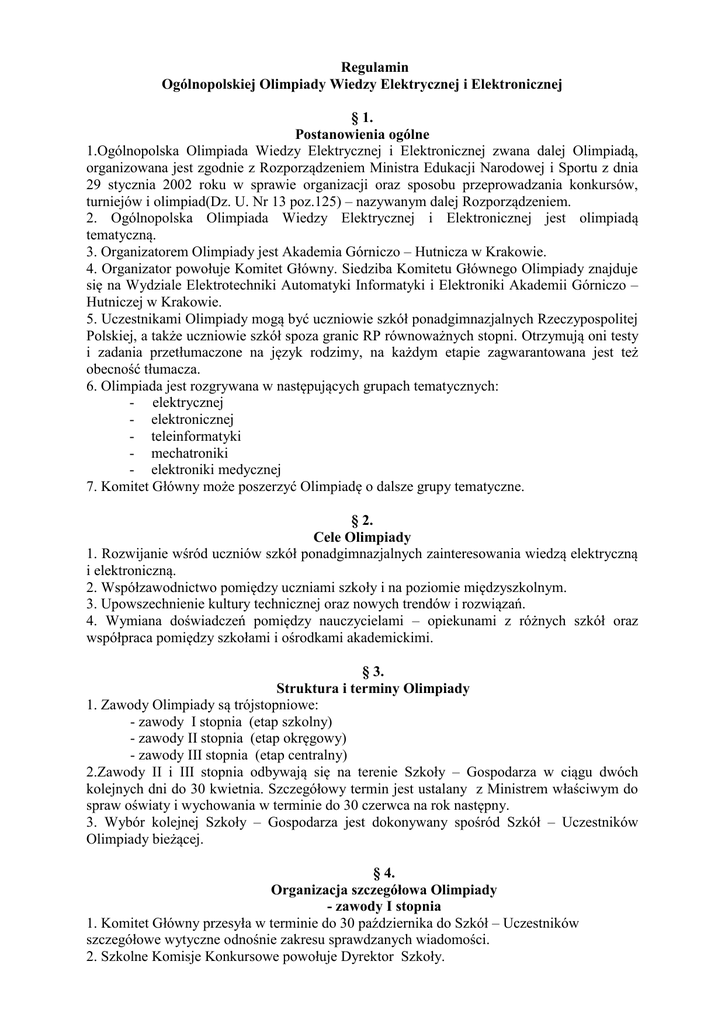 Regulamin Ogólnopolskiej Olimpiady Wiedzy Elektrycznej i Elektronicznej § 1. Postanowienia ogólne 1.Ogólnopolska Olimpiada Wiedzy Elektrycznej i Elektronicznej zwana dalej Olimpiadą, organizowana jest zgodnie z Rozporządzeniem Ministra Edukacji Narodowej i Sportu z dnia 29 stycznia 2002 roku w sprawie organizacji oraz sposobu przeprowadzania konkursów, turniejów i olimpiad(Dz. U. Nr 13 poz.125) – nazywanym dalej Rozporządzeniem. 2. Ogólnopolska Olimpiada Wiedzy Elektrycznej i Elektronicznej jest olimpiadą tematyczną. 3. Organizatorem Olimpiady jest Akademia Górniczo – Hutnicza w Krakowie. 4. Organizator powołuje Komitet Główny. Siedziba Komitetu Głównego Olimpiady znajduje się na Wydziale Elektrotechniki Automatyki Informatyki i Elektroniki Akademii Górniczo – Hutniczej w Krakowie. 5. Uczestnikami Olimpiady mogą być uczniowie szkół ponadgimnazjalnych Rzeczypospolitej Polskiej, a także uczniowie szkół spoza granic RP równoważnych stopni. Otrzymują oni testy i zadania przetłumaczone na język rodzimy, na każdym etapie zagwarantowana jest też obecność tłumacza. 6. Olimpiada jest rozgrywana w następujących grupach tematycznych: - elektrycznej - elektronicznej - teleinformatyki - mechatroniki - elektroniki medycznej 7. Komitet Główny może poszerzyć Olimpiadę o dalsze grupy tematyczne. § 2. Cele Olimpiady 1. Rozwijanie wśród uczniów szkół ponadgimnazjalnych zainteresowania wiedzą elektryczną i elektroniczną. 2. Współzawodnictwo pomiędzy uczniami szkoły i na poziomie międzyszkolnym. 3. Upowszechnienie kultury technicznej oraz nowych trendów i rozwiązań. 4. Wymiana doświadczeń pomiędzy nauczycielami – opiekunami z różnych szkół oraz współpraca pomiędzy szkołami i ośrodkami akademickimi. § 3. Struktura i terminy Olimpiady 1. Zawody Olimpiady są trójstopniowe: - zawody I stopnia (etap szkolny) - zawody II stopnia (etap okręgowy) - zawody III stopnia (etap centralny) 2.Zawody II i III stopnia odbywają się na terenie Szkoły – Gospodarza w ciągu dwóch kolejnych dni do 30 kwietnia. Szczegółowy termin jest ustalany z Ministrem właściwym do spraw oświaty i wychowania w terminie do 30 czerwca na rok następny. 3. Wybór kolejnej Szkoły – Gospodarza jest dokonywany spośród Szkół – Uczestników Olimpiady bieżącej. § 4. Organizacja szczegółowa Olimpiady - zawody I stopnia 1. Komitet Główny przesyła w terminie do 30 października do Szkół – Uczestników szczegółowe wytyczne odnośnie zakresu sprawdzanych wiadomości. 2. Szkolne Komisje Konkursowe powołuje Dyrektor Szkoły. 3. Każda Szkoła – Uczestnik może desygnować do udziału w OOWEE maksymalnie dwóch uczniów do danej grupy tematycznej. Listę uczestników należy zgłosić do Szkoły – Gospodarza do dnia 31 stycznia. §5. Komisje Konkursowe 1.Dla każdej grupy tematycznej Komitet Główny powołuje Komisję Konkursową, która przeprowadza zawody II i III stopnia. 2.W skład Komisji Konkursowej wchodzą: 2.1.przedstawiciele Komisji Głównej 2.2.nauczyciele akademiccy Uczelni z rejonu Szkoły – Gospodarza z kierunków związanych tematycznie z Olimpiadą. Osoby te, w porozumieniu z właściwym Dziekanem, powołuje Komitet Główny. 2.3.wskazani przez Dyrektorów nauczyciele Szkół Gospodarzy poprzedniej, bieżącej i następnej Olimpiady 2.4.obligatoryjnie osoby opracowujące test, test dodatkowy, zadania i pytania konkursowe. 3. Osoby z ust. 2.4. , oddzielnie dla każdej grupy tematycznej, dobierane są spośród członków Komitetu Głównego. Obowiązują zasady poufności, także na etapie redakcji i powielania. § 6. Organizacja szczegółowa Olimpiady - zawody II stopnia 1. Zawody II stopnia są dwuetapowe (etapy: A i B). 2. Szczegółowy tryb etapu A (dzień pierwszy) : 2.1. Etap A to test 50 pytań jednokrotnego wyboru (z czterech) z zakresu całości materiału (150 minut) opracowany tak, aby zbędne były kalkulatory. Telefony komórkowe muszą zostać zdeponowane. 2.2. Za każdy prawidłowo wstawiony znak X w tabeli odpowiedzi, uczeń otrzymuje 1 punkt (maksymalnie 50). W każdym innym przypadku 0 punktów. 2.3. W czasie trwania testu, opiekunowie otrzymują jego egzemplarze wraz z odpowiedziami. 2.4. Test jest kodowany. W czasie jego trwania na sali (salach) mogą przebywać tylko uczestnicy i członkowie Komisji Konkursowych. Uczestnicy zawodów oddają tabelę odpowiedzi, test zatrzymują. Ewentualnych kalkulacji można dokonać na odwrocie jednostronnie drukowanych kart pytań testowych. 2.5. Komisje Konkursowe sprawdzają testy, kierując po 16 najlepszych uczniów, w każdej grupie tematycznej, do etapu B (część praktyczna) zawodów II stopnia. 2.6. W przypadku zakwalifikowania się uczniów ze szkół spoza granic RP ilość osób ulega automatycznemu powiększeniu. 2.7. Sprawdzanie prac przez Komisje Konkursowe dokonywane jest bezpośrednio po zakończeniu testu. W ciągu czterech godzin po jego zakończeniu opiekunowie, którzy wcześniej poznali test, mogą wraz z uczniami zgłaszać zastrzeżenia i reklamacje. 2.8. Jeśli na ostatnim miejscu kwalifikującym do etapu B (do części praktycznej) zawodów II stopnia znajduje się dwóch lub więcej uczestników z tą samą liczbą punktów, to liczba uczestników zakwalifikowanych do etapu B ulega automatycznie powiększeniu. W wyjątkowych przypadkach, gdy liczba tych osób przekroczy możliwości techniczne przeprowadzania etapu B, Komisja Konkursowa może zorganizować dogrywkę. 2.9. Listy uczestników zakwalifikowanych do etapu B zawodów II stopnia ogłaszają wszystkie Komisje Konkursowe bezpośrednio po zakończeniu pracy. 3. Szczegółowy tryb etapu B (dzień pierwszy lub drugi w zależności od uwarunkowań logistycznych danej edycji ) : 3.1. W ramach etapu B uczestnicy, w każdej grupie tematycznej, wykonują taki sam zestaw dwóch zadań laboratoryjno – projektowych, korzystając z identycznej aparatury i osprzętu. 3.2. Na każde zadanie 