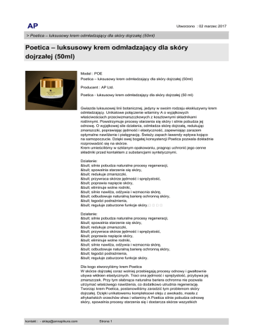 AP Utworzono : 02 marzec 2017 > Poetica – luksusowy krem odmładzający dla skóry dojrzałej (50ml) Poetica – luksusowy krem odmładzający dla skóry dojrzałej (50ml) Model : POE Poetica – luksusowy krem odmładzający dla skóry dojrzałej (50ml) Producent : AP Ltd. Poetica - luksusowy krem odmładzający dla skóry dojrzałej (50 ml) Gwiazda luksusowej linii botanicznej, jedyny w swoim rodzaju ekskluzywny krem odmładzający. Unikatowe połączenie witaminy A o wyjątkowych właściwościach przeciwzmarszczkowych z kosztownymi składnikami roślinnymi. Powstrzymuje procesy starzenia się skóry i silnie pobudza jej odnowę. O wyjątkowej sile działania, odmładza skórę dojrzałą, redukując zmarszczki, poprawiając jędrność i elastyczność, zapewniając zarazem optymalne nawilżenie i pielęgnację. Świeży zapach lawendy wpływa kojąco na samopoczucie. Dzięki swej bogatej konsystencji Poetica pozwala dokładnie rozprowadzić się na skórze. Krem umieściliśmy w szklanym opakowaniu, pragnąc uchronić jego cenne składniki przed kontaktem z substancjami syntetycznymi. Działanie: • silnie pobudza naturalne procesy regeneracji, • spowalnia starzenie się skóry, • redukuje zmarszczki, • przywraca skórze jędrność i sprężystość, • poprawia napięcie skóry, • eliminuje wolne rodniki, • silnie nawilża, odżywia i wzmacnia skórę, • odbudowuje naturalną barierę ochronną skóry, • łagodzi podrażnienia, • reguluje zaburzone funkcje skóry.���� Działanie: • silnie pobudza naturalne procesy regeneracji, • spowalnia starzenie się skóry, • redukuje zmarszczki, • przywraca skórze jędrność i sprężystość, • poprawia napięcie skóry, • eliminuje wolne rodniki, • silnie nawilża, odżywia i wzmacnia skórę, • odbudowuje naturalną barierę ochronną skóry, • łagodzi podrażnienia, • reguluje zaburzone funkcje skóry. Dla kogo stworzyliśmy krem Poetica W skórze dojrzałej coraz wolniej przebiegają procesy odnowy i gwałtownie ubywa włókien elastycznych. Traci ona jędrność i sprężystość, przybywa jej zmarszczek. Przy tym słabnąca naturalna bariera ochronna nie pozwala utrzymać właściwego nawilżenia, co dodatkowo utrudnia regenerację. Tworząc krem Poetica, postanowiliśmy zaradzić tym problemom skóry dojrzałej. Dzięki unikatowemu kompleksowi oleju z awokado, masła z afrykańskich orzechów shea i witaminy A Poetica silnie pobudza odnowę skóry, spowalnia procesy starzenia się i dostarcza skórze wszystkich kontakt : - [email protected] Strona 1 AP Utworzono : 02 marzec 2017 > Poetica – luksusowy krem odmładzający dla skóry dojrzałej (50ml) Poetica – luksusowy krem odmładzający dla skóry dojrzałej (50ml) potrzebnych składników odżywczych. Stosowana na noc, kiedy skóra regeneruje się intensywniej niż w dzień, jest prawdziwą kuracją młodości. Dlaczego Poetica jest tak skuteczna Każdy ze składników roślinnych tworzących recepturę kremu Poetica stanowi sam w sobie naturalną skarbnicę substancji aktywnych. Ich innowacyjne, synergiczne połączenie zaopatruje skórę w nadzwyczajnie bogaty i wszechstronny zestaw cennych składników. Na takim botanicznym tle witamina A, zwana witaminą młodości, ukazuje pełnię swoich walorów. Dzięki doskonale skomponowanym, naturalnym proporcjom składników czynnych krem działa „inteligentnie”, pobudzając naturalne procesy odnowy i optymalnie regulując wszystkie funkcje skóry. Pomimo swej wysokiej aktywności nie drażni skóry, lecz koi ją. Dlaczego Poetica jest przyjazna dla skóry W pracach nad recepturą kremu Poetica przyświecał nam zamysł oparcia się na składnikach pochodzących wprost z przyrody. Właśnie łagodne dla skóry substancje roślinne składają się na kompleks związków aktywnych. Bazę kremu tworzą odżywcze i kojące oleje botaniczne, przypominające swą budową naturalne lipidy skóry. Zastosowana postać witaminy A jest łagodna dla skóry i nie powoduje podrażnień. Krem jest perfumowany według zasad aromaterapii. Zastosowany w nim naturalny olejek eteryczny z lawendy wąskolistnej słynie z korzystnego wpływu zarówo na nastrój jak i na skórę. W kremie Poetica zastosowaliśmy innowacyjne naturalne emulgatory i stabilizatory. Najważniejsze składniki aktywne Olej z owocu awokado Persea gratissima Jeden z najcenniejszych składników w kosmetologii, zwany olejem 7 witamin (zawiera witaminy A, B, D, E, H, K, PP). Wykazuje dużą zgodność z naturalnymi lipidami skóry i uzupełnia barierę lipidową, przy tym dobrze się wchłania, wnikając w głębsze warstwy skóry. Wyjątkowo bogaty w witaminy, nienasycone kwasy tłuszczowe, aminokwasy i proteiny, silnie nawilża skórę, wzmacnia ją, wygładza i regeneruje, łagodzi podrażnienia. Ceniony zwłaszcza w pielęgnacji skóry wrażliwej, problematycznej, dojrzałej, na której uwidoczniły się oznaki upływającego czasu. Masło karité z orzechów shea Butyrospermum parkii Otrzymywane z orzeszków afrykańskiego drzewa masłowego Butyrospermum parkii, o delikatnie orzechowej woni, zawiera substancje niezbędne dla zdrowia skóry, takie jak prowitamina A, witaminy młodości F i E, nasycone i nienasycone kwasy tłuszczowe, a także naturalna allantoina. Masło karité jest od wieków używane w Afryce do pielęgnowania skóry niemowląt i dzieci. Kosmetologia doceniła jego właściwości nawilżające i odżywcze oraz spowalniające procesy starzenia się, dzięki czemu wspaniale nadaje się ono do pielęgnacji każdego typu skóry. Ceni się też jego zalety zwalczania rozmaitych problemów i podrażnień skóry. Witamina A Jedna z najwyżej cenionych i najsilniej działających substancji w medycynie estetycznej i kosmetologii, o walorach wybitnie odmładzających. Przyśpiesza podział komórkowy, usprawniając regenerację skóry. Eliminuje wolne rodniki. kontakt : - [email protected] Strona 2 AP Utworzono : 02