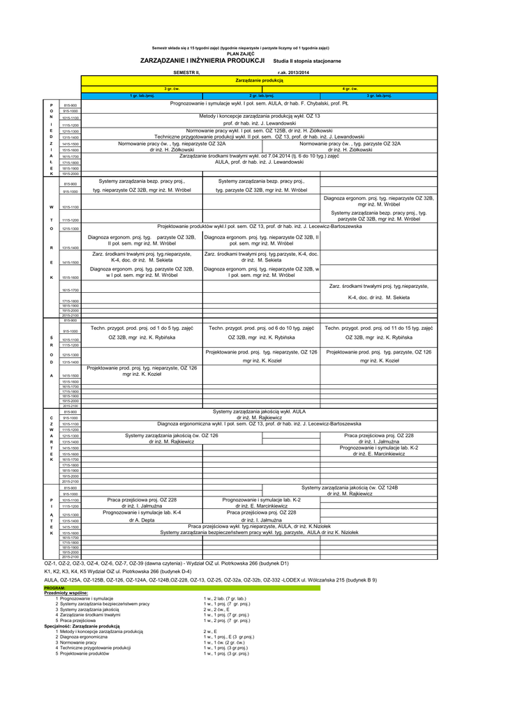 Semestr składa się z 15 tygodni zajęć (tygodnie nieparzyste i parzyste liczymy od 1 tygodnia zajęć) PLAN ZAJĘĆ ZARZĄDZANIE I INŻYNIERIA PRODUKCJI Studia II stopnia stacjonarne SEMESTR II, r.ak. 2013/2014 Zarządzanie produkcją 3 gr. ćw. 4 gr. ćw. 1 gr. lab./proj. P O 915-1000 N 1015-1100 I 1115-1200 E 1215-1300 1315-1400 Z 1415-1500 I 1515-1600 A 1615-1700 Ł 1715-1800 E K 3 gr. lab./proj. Prognozowanie i symulacje wykł. I poł. sem. AULA, dr hab. F. Chybalski, prof. PŁ 815-900 D 2 gr. lab./proj. Metody i koncepcje zarządzania produkcją wykł. OZ 13 prof. dr hab. inż. J. Lewandowski Normowanie pracy wykł. I poł. sem. OZ 125B, dr inż. H. Ziółkowski Techniczne przygotowanie produkcji wykł. II poł. sem. OZ 13, prof. dr hab. inż. J. Lewandowski Normowanie pracy ćw. , tyg. nieparzyste OZ 32A Normowanie pracy ćw. , tyg. parzyste OZ 32A dr inż. H. Ziółkowski dr inż. H. Ziółkowski Zarządzanie środkami trwałymi wykł. od 7.04.2014 (tj. 6 do 10 tyg.) zajęć AULA, prof. dr hab. inż. J. Lewandowski 1815-1900 1915-2000 815-900 915-1000 W 1015-1100 T 1115-1200 O 1215-1300 Systemy zarządzania bezp. pracy proj., Systemy zarządzania bezp. pracy proj., tyg. nieparzyste OZ 32B, mgr inż. M. Wróbel tyg. parzyste OZ 32B, mgr inż. M. Wróbel Diagnoza ergonom. proj. tyg. nieparzyste OZ 32B, mgr inż. M. Wróbel Systemy zarządzania bezp. pracy proj., tyg. parzyste OZ 32B, mgr inż. M. Wróbel Projektowanie produktów wykł.I poł. sem. OZ 13, prof. dr hab. inż. J. Lecewicz-Bartoszewska Diagnoza ergonom. proj. tyg. parzyste OZ 32B, II poł. sem. mgr inż. M. Wróbel Diagnoza ergonom. proj. tyg. nieparzyste OZ 32B, II poł. sem. mgr inż. M. Wróbel R 1315-1400 E 1415-1500 Zarz. środkami trwałymi proj. tyg.nieparzyste, K-4, doc. dr inż. M. Sekieta Zarz. środkami trwałymi proj. tyg.parzyste, K-4, doc. dr inż. M. Sekieta K 1515-1600 Diagnoza ergonom. proj. tyg. parzyste OZ 32B, w I poł. sem. mgr inż. M. Wróbel Diagnoza ergonom. proj. tyg. nieparzyste OZ 32B, w I poł. sem. mgr inż. M. Wróbel Zarz. środkami trwałymi proj. tyg.nieparzyste, 1615-1700 K-4, doc. dr inż. M. Sekieta 1715-1800 1815-1900 1915-2000 2015-2100 815-900 915-1000 Ś R 1015-1100 1115-1200 O 1215-1300 D 1315-1400 A 1415-1500 Techn. przygot. prod. proj. od 1 do 5 tyg. zajęć Techn. przygot. prod. proj. od 6 do 10 tyg. zajęć Techn. przygot. prod. proj. od 11 do 15 tyg. zajęć OZ 32B, mgr inż. K. Rybińska OZ 32B, mgr inż. K. Rybińska OZ 32B, mgr inż. K. Rybińska Projektowanie prod. proj. tyg. nieparzyste, OZ 126 Projektowanie prod. proj. tyg. parzyste, OZ 126 mgr inż. K. Kozieł mgr inż. K. Kozieł Projektowanie prod. proj. tyg. nieparzyste, OZ 126 mgr inż. K. Kozieł 1515-1600 1615-1700 1715-1800 1815-1900 1915-2000 2015-2100 Systemy zarządzania jakością wykł. AULA dr inż. M. Rajkiewicz Diagnoza ergonomiczna wykł. I poł. sem. OZ 13, prof. dr hab. inż. J. Lecewicz-Bartoszewska 815-900 C 915-1000 Z W 1015-1100 A 1215-1300 R 1315-1400 T 1415-1500 E K 1515-1600 1115-1200 Systemy zarządzania jakością ćw. OZ 126 dr inż. M. Rajkiewicz Praca przejściowa proj. OZ 228 dr inż. I. Jałmużna Prognozowanie i symulacje lab. K-2 dr inż. E. Marcinkiewicz 1615-1700 1715-1800 1815-1900 1915-2000 2015-2100 Systemy zarządzania jakością ćw. OZ 124B dr inż. M. Rajkiewicz 815-900 915-1000 1215-1300 Praca przejściowa proj. OZ 228 dr inż. I. Jałmużna Prognozowanie i symulacje lab. K-4 T 1315-1400 dr A. Depta E 1415-1500 K 1515-1600 1615-1700 1715-1800 1815-1900 1915-2000 2015-2100 P 1015-1100 I 1115-1200 Ą Prognozowanie i symulacje lab. K-2 dr inż. E. Marcinkiewicz Praca przejściowa proj. OZ 228 dr inż. I. Jałmużna Praca przejściowa wykł. tyg.nieparzyste, AULA, dr inż. K.Niziołek Systemy zarządzania bezpieczeństwem pracy wykł. tyg. parzyste, AULA dr inz K. Niziołek OZ-1, OZ-2, OZ-3, OZ-4, OZ-6, OZ-7, OZ-39 (dawna czytenia) - Wydział OiZ ul. Piotrkowska 266 (budynek D1) K1, K2, K3, K4, K5 Wydział OiZ ul. Piotrkowska 266 (budynek D-4) AULA, OZ-125A, OZ-125B, OZ-126, OZ-124A, OZ-124B,OZ-228, OZ-13, OZ-25, OZ-32a, OZ-32b, OZ-332 -LODEX ul. Wólczańska 215 (budynek B 9) PROGRAM: Przedmioty wspólne: 1 Prognozowanie i symulacje 2 Systemy zarządzania bezpieczeństwem pracy 3 Systemy zarządzania jakością 4 Zarządzanie środkami trwałymi 5 Praca przejściowa Specjalność: Zarządzanie produkcją 1 Metody i koncepcje zarządzania produkcją 2 Diagnoza ergonomiczna 3 Normowanie pracy 4 Techniczne przygotowanie produkcji 5 Projektowanie produktów 1 w., 2 lab. (7 gr. lab.) 1 w., 1 proj. (7 gr. proj.) 2 w., 2 ćw., E 1 w., 1 proj. (7 gr. proj.) 1 w., 2 proj. (7 gr. proj.) 2 w., E 1 w., 1 proj., E (3 gr.proj.) 1 w., 1 ćw. (2 gr. ćw.) 1 w., 1 proj. (3 gr.proj.) 1 w., 1 proj. (3 gr. proj.)
