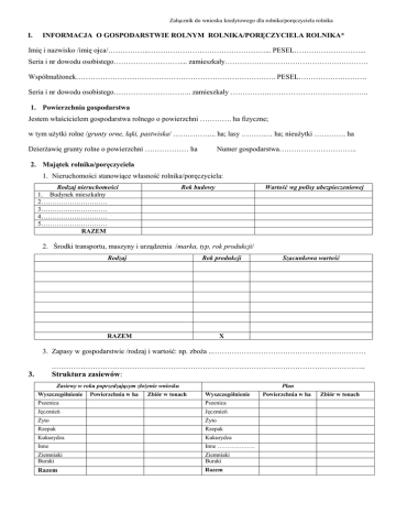 Załącznik do wniosku kredytowego dla rolnika/poręczyciela rolnika I. INFORMACJA O GOSPODARSTWIE ROLNYM ROLNIKA/PORĘCZYCIELA ROLNIKA* Imię i nazwisko /imię ojca/……………..…………………………………………... PESEL………………………... Seria i nr dowodu osobistego……………………….... zamieszkały……………….…………………………………. WspółmałŜonek………………………………………………………………………. PESEL………………………. Seria i nr dowodu osobistego………………………….. zamieszkały …………….………………………………….. 1. Powierzchnia gospodarstwa Jestem właścicielem gospodarstwa rolnego o powierzchni …………. ha fizyczne; w tym uŜytki rolne /grunty orne, łąki, pastwiska/ ……………... ha; lasy ……….… ha; nieuŜytki …………. ha DzierŜawię grunty rolne o powierzchni ……………… ha Numer gospodarstwa………………………….. 2. Majątek rolnika/poręczyciela 1. Nieruchomości stanowiące własność rolnika/poręczyciela: Rodzaj nieruchomości 1. Budynek mieszkalny 2………………………… 3………………………… 4………………………… 5………………………… RAZEM Rok budowy Wartość wg polisy ubezpieczeniowej 2. Środki transportu, maszyny i urządzenia /marka, typ, rok produkcji/ Rodzaj Rok produkcji RAZEM Szacunkowa wartość X 3. Zapasy w gospodarstwie /rodzaj i wartość: np. zboŜa ..……………………………………………………… .……………………………………………………………………………………………………………….. 3. Struktura zasiewów: Zasiewy w roku poprzedzającym złoŜenie wniosku Wyszczególnienie Powierzchnia w ha Zbiór w tonach Plan Wyszczególnienie Pszenica Pszenica Jęczmień Jęczmień śyto śyto Rzepak Rzepak Kukurydza Kukurydza Inne ………………. Ziemniaki Inne ………………. Buraki Ziemniaki Buraki Razem Razem Powierzchnia w ha Zbiór w tonach 4. Stan inwentarza Koniec roku poprzedzającego złoŜenie wniosku Stado podstawowe Rodzaj Sztuki Wartość Plan-stan na koniec roku Stado obrotowe Rodzaj Sztuki Stado podstawowe Wartość Rodzaj Sztuki Stado obrotowe Wartość Rodzaj Sztuki Krowy Tuczniki Krowy Tuczniki Lochy Warchlaki Lochy Warchlaki ……… Prosięta ……… Prosięta ……… ……… Opasy ……… ……… Opasy ……… Cielęta ………. Cielęta ……… Drób ………. Drób ……… ………… Inne…… ……… ………… Inne… ………… ………. ………… II. Wartość PRZYCHODY Ustalenie przychodów i kosztów za okres roku poprzedzającego wniosek oraz na okres planowany przyjmując, Ŝe planowana sprzedaŜ i koszty w następnych latach prognozy kształtować się będą na zbliŜonym poziomie. ilość Rok ubiegły cena Plan wartość ilość A. Przychody z działalności rolniczej i inne I. Produkcja zwierzęca 1. Mleko 2. Bydło rzeźne i jałówki 3. Trzoda 4. Drób ……………. 5. Inna produkcja zwierzęca II. Produkcja roślinna 1. Pszenica 2. Jęczmień 3. śyto 4. Rzepak 5. Kukurydza 6. Inne ……………………… 7. Ziemniaki 8. Buraki III. Wynagrodzenia, renty, emerytury IV. Inne przychody /dopłaty” unijne”/ RAZEM X X cena wartość III. KOSZTY Rok ubiegły Plan Koszty produkcji zwierzęcej 1. Zakup zwierząt 2. Zakup pasz 3. Pozostałe koszty produkcji zwierzęcej Koszty produkcji roślinnej 1. Materiał siewny 2. Nawozy i środki ochrony roślin 3. ……………………. Inne koszty bezpośrednie Koszty pozostałe I. Materiały pędne i smary II. Energia i opał III. Opłata pracy najemnej IV. Czynsze dzierŜawne V. KRUS VI. Ubezpieczenia VII. Naprawy i konserwacja VIII. Inne opłaty i wydatki IX. Podatki Koszty utrzymania rodziny /…….…..osób x …..…. zł x 12 miesięcy/ RAZEM B. Dochód z gospodarstwa /przychody – koszty/ Spłata kredytów w innych Bankach ( dotyczy Poręczyciela ) 1.Spłata rat 2.Spłata odsetek WYPEŁNIA BANK C. Koszty obsługi kredytów I. Odsetki od Kredytów długoterminowych /kredyty powyŜej 3 lat/ II. Odsetki od kredytów krótkoterminowych / kredyty do 3 lat/ D. Spłata rat kredytów długoterminowych E. Spłata rat kredytów krótkoterminowych F. DOCHÓD ROLNIKA/PORĘCZYCIELA /B-C-D-E/ II. INFORMACJE DODATKOWE Czy w ostatnim roku obrotowym dokonano sprzedaŜy majątku trwałego ? /grunty, budynki, maszyny, podać wartość / ………………………………………………………………………………………………………………………………………………….zł Czy wystąpiły inwestycje w ostatnim roku obrotowym /budowa, rozbudowa, remont/ Jestem udziałowcem TAK ……………………… zł NIE Czy występują zobowiązania wobec dostawców? /nazwa i kwota/: ………………………………………………………………………………………………………………………. Czy występują naleŜności od odbiorców płodów rolnych? /nazwa i kwota/: ………………………………………………………………………………………………………………………. Wypełnia Bank /właściwe zaznaczyć/ Okres prowadzenia działalności Wykształcenie Wielkość gospodarstwa rolnego Długość okresu współpracy z Bankiem Występowanie tytułów egzekucyjnych Poziom zadłuŜenia u dostawców Struktura odbiorców Działalność prowadzona dłuŜej niŜ 8 lat Działalność prowadzona dłuŜej niŜ 3 lata ale krócej niŜ 8 lat Działalność prowadzona dłuŜej niŜ rok ale krócej niŜ 3 lata Działalność prowadzona krócej niŜ 1 rok obrotowy Kryterium wyłączone z oceny WyŜsze rolnicze WyŜsze nie rolnicze lub średnie Zawodowe Podstawowe Kryterium wyłączone z oceny Gospodarstwo powyŜej 50 ha Gospodarstwo powyŜej 20 ha ale poniŜej 50 ha Gospodarstwo powyŜej 3 ha ale poniŜej 20