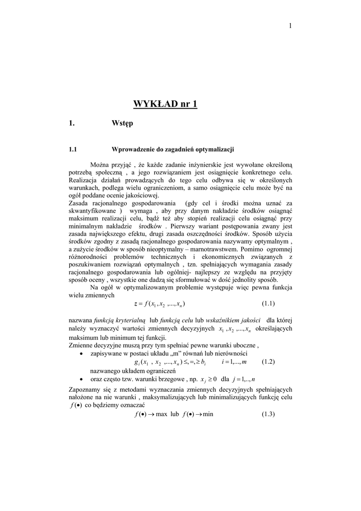 1 WYKŁAD nr 1 1. Wstęp 1.1 Wprowadzenie do zagadnień optymalizacji Można przyjąć , że każde zadanie inżynierskie jest wywołane określoną potrzebą społeczną , a jego rozwiązaniem jest osiągnięcie konkretnego celu. Realizacja działań prowadzących do tego celu odbywa się w określonych warunkach, podlega wielu ograniczeniom, a samo osiągnięcie celu może być na ogół poddane ocenie jakościowej. Zasada racjonalnego gospodarowania (gdy cel i środki można uznać za skwantyfikowane ) wymaga , aby przy danym nakładzie środków osiągnąć maksimum realizacji celu, bądź też aby stopień realizacji celu osiągnąć przy minimalnym nakładzie środków . Pierwszy wariant postępowania zwany jest zasada największego efektu, drugi zasada oszczędności środków. Sposób użycia środków zgodny z zasadą racjonalnego gospodarowania nazywamy optymalnym , a zużycie środków w sposób nieoptymalny – marnotrawstwem. Pomimo ogromnej różnorodności problemów technicznych i ekonomicznych związanych z poszukiwaniem rozwiązań optymalnych , tzn. spełniających wymagania zasady racjonalnego gospodarowania lub ogólniej- najlepszy ze względu na przyjęty sposób oceny , wszystkie one dadzą się sformułować w dość jednolity sposób. Na ogół w optymalizowanym problemie występuje więc pewna funkcja wielu zmiennych z = f ( x1 , x2 ,..., xn ) (1.1) nazwana funkcją kryterialną lub funkcją celu lub wskaźnikiem jakości dla której należy wyznaczyć wartości zmiennych decyzyjnych x1 , x2 ,..., xn określających maksimum lub minimum tej funkcji. Zmienne decyzyjne muszą przy tym spełniać pewne warunki uboczne , • zapisywane w postaci układu „m” równań lub nierówności g i ( x1 , x 2 ,..., x n ) ≤, =, ≥ bi i = 1,..., m (1.2) nazwanego układem ograniczeń • oraz często tzw. warunki brzegowe , np. x j ≥ 0 dla j = 1,.., n Zapoznamy się z metodami wyznaczania zmiennych decyzyjnych spełniających nałożone na nie warunki , maksymalizujących lub minimalizujących funkcję celu f (•) co będziemy oznaczać f (•) → max lub f (•) → min (1.3) 2 1.2. Podział zadań optymalizacji Zadania optymalizacji , można sklasyfikować wg kilku różnych kryteriów, a mianowicie : 1. ze względu na postać funkcji celu i postaci ograniczeń: a) zadania programowania liniowego (funkcja celu i układ ograniczeń – są liniowe), b) zadania programowania nieliniowego, w tym • zadania programowania kwadratowego (funkcja celu w postaci sumy formy liniowej i kwadratowej , ograniczenia liniowe ), • zadania programowania wypukłego (minimalizacja wypukłej funkcji celu ograniczenia tworzą zbiór wypukły), • zadania programowania geometrycznego (minimalizacja sumy iloczynów potęg zmiennych decyzyjnych ). 2. ze względu na typ zmiennych decyzyjnych : a) zadania całkowitoliczbowe , b) zadania zerojedynkowe ( zmienne decyzyjne przybierać mogą tylko wartości 0 lub 1 ), c) zadania mieszane. 3. ze względu na charakter współczynników przy zmiennych decyzyjnych : a) zadania deterministyczne (wszystkie współczynniki i prawe strony układu ograniczeń są znane), b) zadania losowe (niektóre współczynniki lub prawe strony ograniczeń są zmiennymi losowymi ). 4. ze względu na liczbę funkcji celu : a) zadania jednokryterialne (skalarna funkcja celu) b) zadania wielokryterialne (więcej niż jedno kryterium , funkcja celu wektorowa) 5. zadania optymalizacji statycznej ( funkcja celu , ograniczenia nie są funkcjami innych zmiennych), 6. zadania optymalizacji dynamicznej (funkcja celu tzw. funkcjonał ( funkcja funkcji) i ograniczenia są równaniami różniczkowymi innych zmiennych ( najczęściej czasu t ). 7. ze względu na metodę rozwiązania: a) metody analityczne, b) metody numeryczne. Na ogół , każde zadanie optymalizacji można zaliczyć jednocześnie do kilku z wyżej wymienionych rodzajów, na przykład tzw. 3 Zadania optymalizacji Zadania programowania liniowego metody analityczne Zadania programowania nieliniowego optymalizacja statyczna metody numeryczne graficzne m.Simplex rozwiązania bazowe m. reverse Simplex inne metody wykorzystujące warunki konieczne i istnienie funkcji kryterialnej Metoda Mnożników Lagrange'a Metoda wykorzystująca warunki Kuhna-Tuckera zadania bez ograniczeń metody analityczne metody analityczne zadania z ograniczeniami równościowymi metody numeryczne Zasada optymalności Bellmana Zasada max Pontiagina M.funkcjonałów Lagrange'a metody numeryczne zadania z ograniczeniami nierównościowymi Programowanie dynamiczne M.gradientu w przestrzeni funkcyjnej sterowań metody bezgradientowe M.Hooka-Jeevesa M.rosenbrocka M.Gausa-Seidela M. gradientu prostego Zmodyfikowana m.Newtona metody gradientowe M. z zastosowaniem funkcji kary M. z zastosowaniem modyfikacji kierunków Rys.1.1 optymalizacja dynamiczna zadania bez ograniczeń zadania z ograniczeniami Przykładowy podział zadań optymalizacji zadanie transportowe można określić jako całkowitoliczbowe deterministyczne zadanie programowania liniowego z jednym kryterium, zadanie optymalizacji pracy zbiornika zasilającego w wodę kilku użytkowników przy znanej funkcji dopływu do zbiornika, jako dynamiczne zdeterminowane zadanie programowania nieliniowego z jedną funkcja celu. 4 Analizując podaną wyżej ogólną postać zapisu zadania optymalizacyjnego zauważmy , że różni się ona od sformułowania znanych nam dotychczas elementarnych zadań wyznaczania ekstremum funkcji wielu zmiennych, istnieniem ograniczeń zawężających obszar , w którym poszukiwane maksimum lub minimum ma występować. Bardzo często się zdarza ,że poszukiwane rozwiązanie znajduje się właśnie na granicy tego obszaru , co znacznie komplikuje całe zagadnienie. Ponadto , zwłaszcza w problemach technicznych , często funkcja celu nie jest różniczkowalna bądź wskutek występujących w niej nieciągłości, bądź w skutek postaci , dla której możliwe jest je