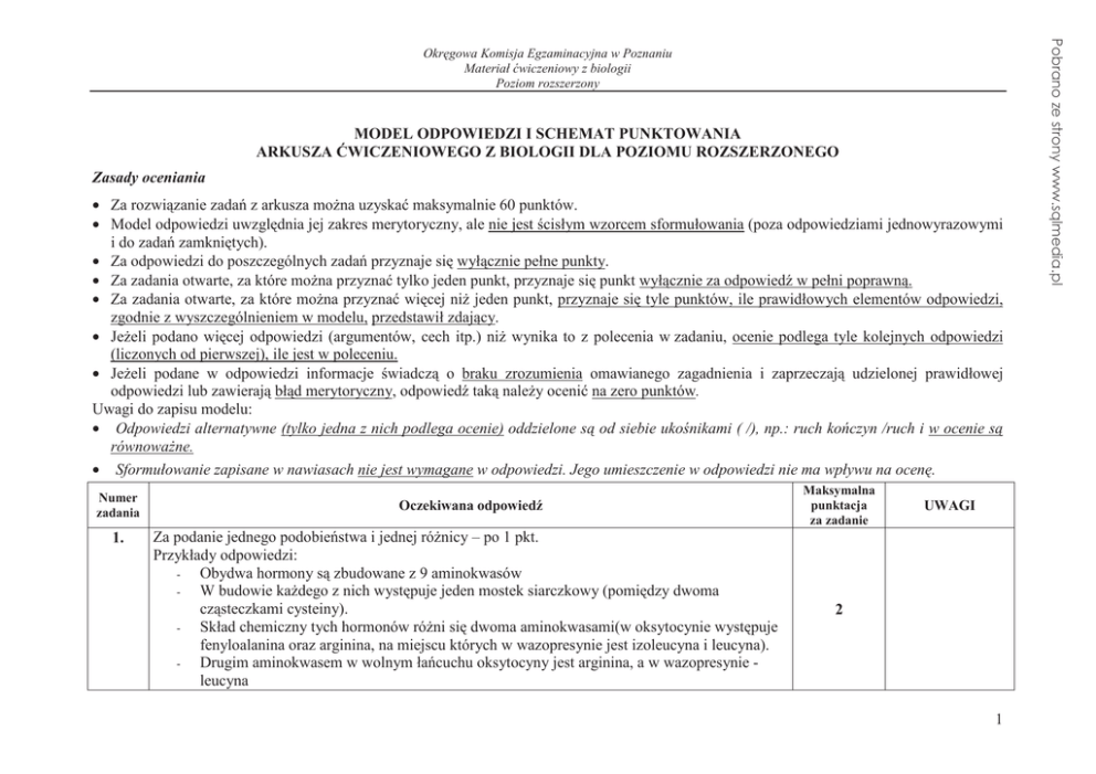 MODEL ODPOWIEDZI I SCHEMAT PUNKTOWANIA ARKUSZA WICZENIOWEGO Z BIOLOGII DLA POZIOMU ROZSZERZONEGO Zasady oceniania • Za rozwi zanie zada z arkusza mo na uzyska maksymalnie 60 punktów. • Model odpowiedzi uwzgl dnia jej zakres merytoryczny, ale nie jest cisłym wzorcem sformułowania (poza odpowiedziami jednowyrazowymi i do zada zamkni tych). • Za odpowiedzi do poszczególnych zada przyznaje si wył cznie pełne punkty. • Za zadania otwarte, za które mo na przyzna tylko jeden punkt, przyznaje si punkt wył cznie za odpowied w pełni poprawn . • Za zadania otwarte, za które mo na przyzna wi cej ni jeden punkt, przyznaje si tyle punktów, ile prawidłowych elementów odpowiedzi, zgodnie z wyszczególnieniem w modelu, przedstawił zdaj cy. • Je eli podano wi cej odpowiedzi (argumentów, cech itp.) ni wynika to z polecenia w zadaniu, ocenie podlega tyle kolejnych odpowiedzi (liczonych od pierwszej), ile jest w poleceniu. • Je eli podane w odpowiedzi informacje wiadcz o braku zrozumienia omawianego zagadnienia i zaprzeczaj udzielonej prawidłowej odpowiedzi lub zawieraj bł d merytoryczny, odpowied tak nale y oceni na zero punktów. Uwagi do zapisu modelu: • Odpowiedzi alternatywne (tylko jedna z nich podlega ocenie) oddzielone s od siebie uko nikami ( /), np.: ruch ko czyn /ruch i w ocenie s równowa ne. • Sformułowanie zapisane w nawiasach nie jest wymagane w odpowiedzi. Jego umieszczenie w odpowiedzi nie ma wpływu na ocen . Numer zadania 1. Oczekiwana odpowied Maksymalna punktacja za zadanie Za podanie jednego podobie stwa i jednej ró nicy – po 1 pkt. Przykłady odpowiedzi: Obydwa hormony s zbudowane z 9 aminokwasów W budowie ka dego z nich wyst puje jeden mostek siarczkowy (pomi dzy dwoma cz steczkami cysteiny). Skład chemiczny tych hormonów ró ni si dwoma aminokwasami(w oksytocynie wyst puje fenyloalanina oraz arginina, na miejscu których w wazopresynie jest izoleucyna i leucyna). Drugim aminokwasem w wolnym ła cuchu oksytocyny jest arginina, a w wazopresynie leucyna 2 UWAGI 1 Pobrano ze strony www.sqlmedia.pl Okr gowa Komisja Egzaminacyjna w Poznaniu Materiał wiczeniowy z biologii Poziom rozszerzony Pobrano ze strony www.sqlmedia.pl Okr gowa Komisja Egzaminacyjna w Poznaniu Materiał wiczeniowy z biologii Poziom rozszerzony 2.a 2.b 3. 4. 5. 6. 7. 8. Za podanie nazwy struktury – 1 pkt. Mitochondrium Za wyja nienie uwzgl dniaj ce produkcj białek (enzymatycznych) transportowanych poza komórk – 1 pkt. Przykład odpowiedzi: Funkcj tej komórki jest produkcja enzymów, które s białkami, a siateczka ródplazmatyczna odpowiada za syntez białek produkowanych na „eksport”, wi c jest rozbudowana. Za poprawne uszeregowanie mechanizmów kontroluj cych wydzielanie soku oł dkowego - 1 pkt Kontrola hormonalna, kontrola mechaniczna, kontrola nerwowa Za wymienienie ka dego z dwóch przykładów procesów chroni cych przed hipoksj – po 1 pkt. Przykłady odpowiedzi 1. Zwi kszona wentylacja płuc / hiperwentylacja, polegaj ca na pogł bianiu i przyspieszaniu oddechów. 2. Zwi kszenie cz sto ci skurczów serca, dzi ki czemu krew szybciej transportuje tlen. 3. Przyspieszony proces erytropoezy (wzrasta produkcja erytrocytów). Za poprawne uporz dkowanie wszystkich elementów – 1pkt. 3, 4, 5, 1, 2. Za wskazanie ka dej z dwóch poprawnych cech – po 1 pkt. B, D Za podanie wła ciwego argumentu – 1pkt. Białka te nie s pełnowarto ciowe, poniewa adne z nich nie dostarcza wszystkich aminokwasów egzogennych. / poniewa w składzie adnego z nich nie ma wszystkich aminokwasów egzogennych. a) Za poprawne sformułowanie problemu badawczego – 1 pkt. Przykłady odpowiedzi: Wpływ pH na barw antocyjanów. Czy zmiana pH wpływa na zmian barwy antocyjanów? Czy barwa antocyjanów zale y od pH rodowiska? b) za poprawne okre lenie próby kontrolnej i uzasadnienie – 1 pkt. Przykład odpowiedzi: Probówka nr 3 – poniewa nie dodawano do niej substancji zmieniaj cych pH roztworu / poniewa u yto w niej wod destylowan . 1 1 1 2 1 2 1 2 2 Pobrano ze strony www.sqlmedia.pl Okr gowa Komisja Egzaminacyjna w Poznaniu Materiał wiczeniowy z biologii Poziom rozszerzony 9. 10. 11. 12. 13. 14. 15. Za wła ciwe okre lenie poprawno ci ka dych dwóch z czterech sformułowa – po 1 pkt. 1.-P, 2.-P, 3.-P, 4.-F. Za podanie jednej cechy wspólnej i jednej ró nicy – po 1 pkt. Przykład odpowiedzi: a) Podobie stwo – regularne uło enie włókien aktyny i miozyny, daj ce efekt poprzecznego pr kowania. b) Ró nica: komórki mi ni szkieletowych s walcowate i proste a tkanki mi nia sercowego rozgał zione. / W komórkach mi ni mi nia szkieletowego wyst puje wiele j der poło onych obwodowo, a w komórkach mi nia sercowego 1(1-2) poło one centralnie./ W komórkach mi nia sercowego wyst puj wstawki a w komórkach mi ni szkieletowych nie wyst puj . Za poprawne umieszczenie znaków „+” we wszystkich wła ciwych rubrykach tabeli – 1 pkt. Rodzaj transportu Cechy transportu bierny ułatwiony aktywny Kierunek transportu zgodny + + z gradientem st e . + + Udział swoistych transporterów. Zapotrzebowanie na energi . + a) za podanie nazwy etapu oznaczonego X – 1pkt. Ła cuch oddechowy. b)za okre lenie roli tlenu – 1 pkt. Tlen jest akceptorem wodoru. Za wymienienie nazwy ka dej z organelli wytwarzaj cych ATP – po 1 pkt. Mitochondria, chloroplasty. Za poprawne wyja nienie zwi zku przyczynowo-skutkowego – 1pkt. Dwutlenek w gla b d cy produktem oddychania komórkowego komórek korzenia przedostaje si do roztworu i rozpuszczaj c si w wodzie powoduje jej zakwaszenie (tworz si jony wodoroweglanowe obni aj ce pH roztworu). Za poprawne przyporz dkowanie wszystkich rodzajów kwasów do ich funkcji – 1 pkt. 1 – mRNA, 2. – tRNA, 3.-rRNA 2 2 1 2 2 1 1 3 Pobrano ze strony www.sqlmedia.pl Okr gowa Komisja Egzaminacyjna w Poznaniu Materiał wiczeniowy z biologii Poziom rozszerzony 16. 17. 18. 19. 20. 21. 22. Za poprawne wyja nienie trójkowo ci kodu genetycznego – 1 pkt. Przykład odpowiedzi: 