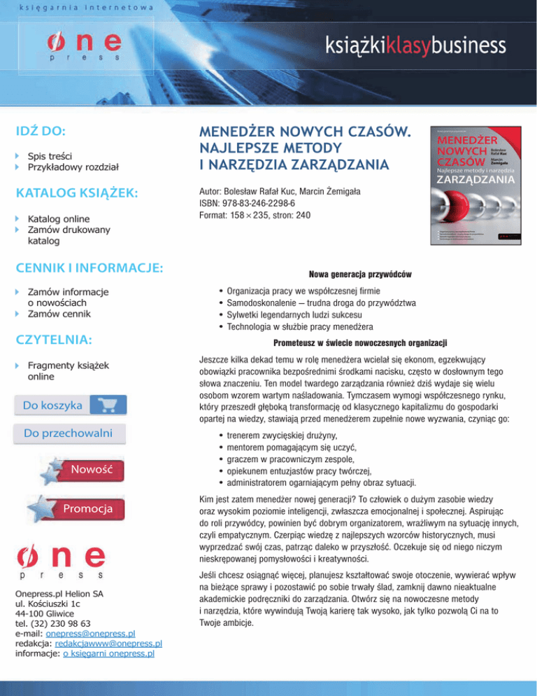 IDŹ DO: Spis treści Przykładowy rozdział KATALOG KSIĄŻEK: Katalog online Zamów drukowany katalog CENNIK I INFORMACJE: Zamów informacje o nowościach Zamów cennik CZYTELNIA: Fragmenty książek online Do koszyka Do przechowalni Nowość Promocja Onepress.pl Helion SA ul. Kościuszki 1c 44-100 Gliwice tel. (32) 230 98 63 e-mail: [email protected] redakcja: [email protected] informacje: o księgarni onepress.pl MENEDŻER NOWYCH CZASÓW. NAJLEPSZE METODY I NARZĘDZIA ZARZĄDZANIA Autor: Bolesław Rafał Kuc, Marcin Żemigała ISBN: 978-83-246-2298-6 Format: 158 × 235, stron: 240 Nowa generacja przywódców • Organizacja pracy we współczesnej firmie • Samodoskonalenie — trudna droga do przywództwa • Sylwetki legendarnych ludzi sukcesu • Technologia w służbie pracy menedżera Prometeusz w œwiecie nowoczesnych organizacji Jeszcze kilka dekad temu w rolę menedżera wcielał się ekonom, egzekwujący obowiązki pracownika bezpoœrednimi œrodkami nacisku, często w dosłownym tego słowa znaczeniu. Ten model twardego zarządzania również dziœ wydaje się wielu osobom wzorem wartym naœladowania. Tymczasem wymogi współczesnego rynku, który przeszedł głęboką transformację od klasycznego kapitalizmu do gospodarki opartej na wiedzy, stawiają przed menedżerem zupełnie nowe wyzwania, czyniąc go: • trenerem zwycięskiej drużyny, • mentorem pomagającym się uczyć, • graczem w pracowniczym zespole, • opiekunem entuzjastów pracy twórczej, • administratorem ogarniającym pełny obraz sytuacji. Kim jest zatem menedżer nowej generacji? To człowiek o dużym zasobie wiedzy oraz wysokim poziomie inteligencji, zwłaszcza emocjonalnej i społecznej. Aspirując do roli przywódcy, powinien być dobrym organizatorem, wrażliwym na sytuację innych, czyli empatycznym. Czerpiąc wiedzę z najlepszych wzorców historycznych, musi wyprzedzać swój czas, patrząc daleko w przyszłoœć. Oczekuje się od niego niczym nieskrępowanej pomysłowoœci i kreatywnoœci. Jeœli chcesz osiągnąć więcej, planujesz kształtować swoje otoczenie, wywierać wpływ na bieżące sprawy i pozostawić po sobie trwały œlad, zamknij dawno nieaktualne akademickie podręczniki do zarządzania. Otwórz się na nowoczesne metody i narzędzia, które wywindują Twoją karierę tak wysoko, jak tylko pozwolą Ci na to Twoje ambicje. Spis treści Wstęp 5 Rozdział 1. Kierownik-decydent: wczoraj i dziś 9 1.1. Codzienność kierowania — problemy i decyzje 1.2. Cechy sytuacji problemowych i decyzyjnych 1.3. Decydowanie to sztuka wychodzenia z niepewności 1.4. Więcej informacji — nie oznacza lepiej 1.5. Trudno być doskonałym decydentem 1.6. Dylematy i paradoksy procesów decyzyjnych 1.7. Decydent (menedżer) jutra Rozdział 2. Menedżer — to przede wszystkim styl sprawowania władzy 9 13 18 24 26 28 33 35 2.1. Retrospekcja lat sześćdziesiątych 2.2. Poszukiwanie skutecznego stylu kierowania 2.3. Założenia dotyczące natury ludzkiej 2.4. Kontrowersje wokół autokratyzmu 2.5. Wśród menedżerów są też rozbójnicy 36 38 40 43 46 Rozdział 3. Menedżer we współczesnej organizacji 63 3.1. Rodowód menedżera 3.2. Rodzaje menedżerów 3.3. Funkcje i role menedżerów 3.4. Cechy i umiejętności menedżerów 3.5. Poszukiwanie ideału menedżera — trwa 3.6. Wizerunki menedżera przyszłości 63 66 67 70 74 77 Rozdział 4. Menedżer w organizacji holistycznej 85 4.1. Organizacja jako system 4.2. Myślenie systemowe i holizm 4.3. Euromenedżer — menedżer na miarę jednoczącej się Europy 4.4. Europejski styl zarządzania Rozdział 5. Menedżer w organizacji uczącej się 5.1. Istota i znaczenie procesu uczenia się 5.2. Koncepcja uczenia się według Ch. Argyrisa 5.3. Model ciągłego doskonalenia W.E. Deminga 5.4. Eksperymentalny model K. Lewina 5.5. Uczenie się przez doświadczenie według D. Kolba 5.6. Koncepcja uczenia się według Honeya i Mumforda 5.7. Koncepcja pięciu dyscyplin P. Senge 85 89 92 99 113 113 121 123 124 125 130 133 4 Menedżer nowych czasów. Najlepsze metody i narzędzia zarządzania Rozdział 6. Sylwetki legendarnych menedżerów sukcesu 6.1. Henry Ford I — największy przedsiębiorca XX wieku 6.2. Lee Iacocca — niemożliwe uczynił możliwym 6.3. Bill Gates — już za życia jest legendą 6.4. Jack Welch — prymus wśród najinteligentniejszych 6.5. Akio Morita — samuraj z walkmanem 139 139 143 147 153 157 Rozdział 7. Organizacja pracy menedżera jutra 163 7.1. Umiejętność zarządzania samym sobą 7.2. Czas pracy menedżera 7.3. Czas na pracę koncepcyjną 7.4. Doskonalenie samego siebie 7.5. Jak powinien działać menedżer doskonały? 7.6. System wartości menedżera doskonałego 7.7. Zagospodarowanie różnic kulturowych 7.8. Menedżer przyszłości 163 166 168 170 173 177 177 178 Rozdział 8. Samodoskonalenie menedżerów — trudna droga do przywództwa 181 8.1. Zmierzch pracy nie dotyczy menedżerów 8.2. Samodoskonalenie — odpowiedzialność za własny rozwój 8.3. Cele doskonalenia — kreowanie indywidualności czy osobowości? 8.4. Cechy pozytywne i negatywne jednostki 8.5. Warto poznać siebie — zanim zacznie się kierować innymi 8.6. Samodoskonalenie — wzbogacenie własnej różnorodności 8.7. Analiza wyników własnej działalności i osobowości 8.8. Samodoskonalenie poprzez pobudzanie twórczego myślenia 8.9. Sylwetka menedżera globalnego 8.10. Sylwetka przywódcy wizjonera 8.11. Typy przywódców 8.12. Najważniejsza jest wizja Rozdział 9. Menedżer w niewoli komputera i komórki 9.1. Zmiana modelu organizacji 9.2. Hierarchia ustępuje miejsca heterarchii 9.3. Technologia pracy współczesnego menedżera 9.4. Zmiany wartości i priorytetów 181 183 185 187 188 189 190 193 194 196 200 203 211 211 217 222 224 Bibliografia 231 Spis tabel 237 Spis rysunków 239 Rozdział Organizacja pracy menedżera jutra Streszczenie Osiąganie efektywności przez organizację w dużej mierze uzależnione jest od sprawnośc