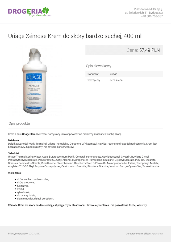 Piastowska Miller sp. j. ul. Śniadeckich 51, Bydgoszcz +48 501-768-087 Uriage Xémose Krem do skóry bardzo suchej, 400 ml Cena: 57,49 PLN Opis słownikowy Producent uriage Rodzaj cery cera sucha Opis produktu Krem z serii Uriage Xémose został pomyślany jako odpowiedź na problemy związane z suchą skórą. Działanie: Dzięki zawartości Wody Termalnej Uriage i kompleksu Cerasterol-2f? kosmetyk nawilża, regeneruje i łagodzi podrażnienia. Krem jest bezzapachowy, hipoalergiczny, nie zawiera konserwantów. Składniki: Uriage Thermal Spring Water, Aqua, Butyrospermum Parkii, Cetearyl Isononanoate, Octyldodecanol, Glycerin, Butylene Glycol, Pentaerythrityl Distearate, Polysorbate 60, Cetyl Alcohol, Hydrogenated Polydecene, Squalane, Glyceryl Stearate, PEG-100 Stearate, Brassica Campestris Sterols, Dimethicone, Chlorphenesin, Raspberry Seed Oil/Palm Oil Aminopropanediol Esters, Tocopheryl Acetate, Acrylates/C10-30 Alkyl Acrylate Crosspolymer, Cetrimonium Bromide, Piroctone Olamine, Xanthan Gum, o-Cymen-5-ol, Tromethamine Wskazania: skóra sucha i bardzo sucha, skóra atopowa, łuszczyca, świąd, rybia łuska, do twarzy i ciała, dla niemowląt, dzieci, dorosłych. Xémose Krem do skóry bardzo suchej jest przyjazny w stosowaniu - łatwo się wchłania i nie pozostawia tłustej warstwy. Plik wygenerowano: 02-03-2017 Powered by TCPDF (www.tcpdf.org) Oprogramowanie sklepu: AptusShop