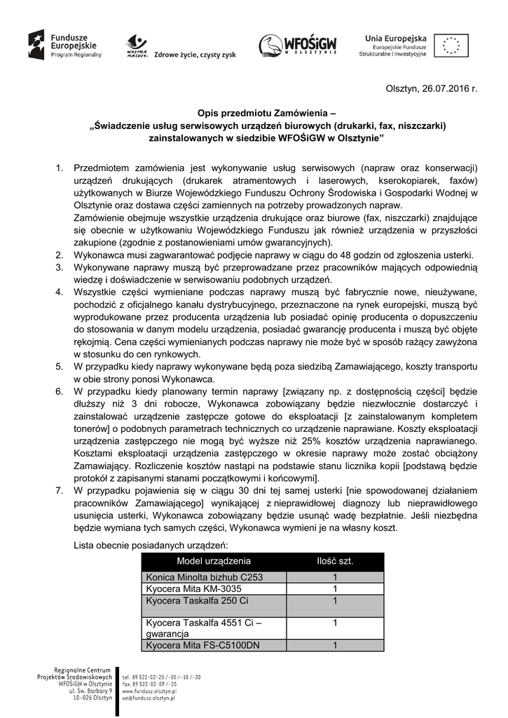 Olsztyn, 26.07.2016 r. Opis przedmiotu Zamówienia – „Świadczenie usług serwisowych urządzeń biurowych (drukarki, fax, niszczarki) zainstalowanych w siedzibie WFOŚiGW w Olsztynie” 1. 2. 3. 4. 5. 6. 7. Przedmiotem zamówienia jest wykonywanie usług serwisowych (napraw oraz konserwacji) urządzeń drukujących (drukarek atramentowych i laserowych, kserokopiarek, faxów) użytkowanych w Biurze Wojewódzkiego Funduszu Ochrony Środowiska i Gospodarki Wodnej w Olsztynie oraz dostawa części zamiennych na potrzeby prowadzonych napraw. Zamówienie obejmuje wszystkie urządzenia drukujące oraz biurowe (fax, niszczarki) znajdujące się obecnie w użytkowaniu Wojewódzkiego Funduszu jak również urządzenia w przyszłości zakupione (zgodnie z postanowieniami umów gwarancyjnych). Wykonawca musi zagwarantować podjęcie naprawy w ciągu do 48 godzin od zgłoszenia usterki. Wykonywane naprawy muszą być przeprowadzane przez pracowników mających odpowiednią wiedzę i doświadczenie w serwisowaniu podobnych urządzeń. Wszystkie części wymieniane podczas naprawy muszą być fabrycznie nowe, nieużywane, pochodzić z oficjalnego kanału dystrybucyjnego, przeznaczone na rynek europejski, muszą być wyprodukowane przez producenta urządzenia lub posiadać opinię producenta o dopuszczeniu do stosowania w danym modelu urządzenia, posiadać gwarancję producenta i muszą być objęte rękojmią. Cena części wymienianych podczas naprawy nie może być w sposób rażący zawyżona w stosunku do cen rynkowych. W przypadku kiedy naprawy wykonywane będą poza siedzibą Zamawiającego, koszty transportu w obie strony ponosi Wykonawca. W przypadku kiedy planowany termin naprawy [związany np. z dostępnością części] będzie dłuższy niż 3 dni robocze, Wykonawca zobowiązany będzie niezwłocznie dostarczyć i zainstalować urządzenie zastępcze gotowe do eksploatacji [z zainstalowanym kompletem tonerów] o podobnych parametrach technicznych co urządzenie naprawiane. Koszty eksploatacji urządzenia zastępczego nie mogą być wyższe niż 25% kosztów urządzenia naprawianego. Kosztami eksploatacji urządzenia zastępczego w okresie naprawy może zostać obciążony Zamawiający. Rozliczenie kosztów nastąpi na podstawie stanu licznika kopii [podstawą będzie protokół z zapisanymi stanami początkowymi i końcowymi]. W przypadku pojawienia się w ciągu 30 dni tej samej usterki [nie spowodowanej działaniem pracowników Zamawiającego] wynikającej z nieprawidłowej diagnozy lub nieprawidłowego usunięcia usterki, Wykonawca zobowiązany będzie usunąć wadę bezpłatnie. Jeśli niezbędna będzie wymiana tych samych części, Wykonawca wymieni je na własny koszt. Lista obecnie posiadanych urządzeń: Model urządzenia Ilość szt. Konica Minolta bizhub C253 Kyocera Mita KM-3035 Kyocera Taskalfa 250 Ci 1 1 1 Kyocera Taskalfa 4551 Ci – gwarancja Kyocera Mita FS-C5100DN 1 1 HP LaserJet 2300 Canon IP4600 Fellowes C-220 Fellowes SB-99Ci Rexel 250x BrotherHL2340DW 8. 2 1 1 1 1 1 Miejsce świadczenia usługi: Wojewódzki Fundusz Ochrony Środowiska i Gospodarki Wodnej w Olsztynie ul. Św. Barbary 9; 10-026 Olsztyn. Kryterium: 85% - cena 15% - czas działań serwisowych od zgłoszenia usterki, tj. a) b) c) Do 24 godzin od zgłoszenia usterki – 15 pkt. Do 48 godzin od zgłoszenia usterki – 5 pkt. Powyżej 48 godzin od zgłoszenia usterki – 0 pkt. Zamawiający przewiduje 20 roboczogodzin w okresie trwania umowy. Rozliczenie z Wykonawcą będzie potwierdzone rzeczywistym czasem pracy. Termin świadczenia usług: sierpień 2016 r. – 31.12.2016 r.