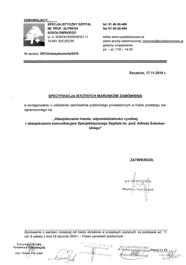ZAMAWIAJACY: SPECJALISTYCZNY SZPITAL IM. PROF. ALFREDA SOKOŁOWSKIEGO ul. A. SOKOŁOWSKIEGO 11 70-891 SZCZECIN tel. 91 46-20-466 fax 91 46-20-494 adres www.szpitalzdunowo.pl adres poczty elektronicznej; zdunowoszpitalzdunowo.pl godziny urz ędowania: pn. — pt. 7:00 — 14:35 Nr sprawy: 207/U/ubezpieczenia/2016 Szczecin, 17.11.2016 r. SPECYFIKACJA ISTOTNYCH WARUNKÓW ZAMÓWIENIA w postępowaniu o udzielenie zamówienia publicznego prowadzonym w trybie przetargu nie- ograniczonego na: „Ubezpieczenie mienia, odpowiedzialno ści cywilnej i ubezpieczenia komunikacyjne Specjalistycznego Szpitala im. prof. Alfreda Soko łowskiego" ZATWIERDZIŁ p.o. D 'REKT/ 1VbEdaign Sojha-:-,/,tak Zamówienie o warto ści mniejszej ni ż kwoty okre ś lone w przepisach wydanych na podstawie art. 11 ust. 8 ustawy z dnia 29 stycznia 2004 r. - Prawo zamówie ń publicznych Kiere.Y: Zamówio mgr A ;■A ,:,''kfliStrOnaI -.) I Mrczak ./ Z 13 Spis treści I. NAZWA I ADRES ZAMAWIAJ ĄCEGO Il. TRYB UDZIELENIA ZAMÓWIENIA III. OPIS PRZEDMIOTU ZAMÓWIENIA IV. OPIS CZ ĘśCI ZAMÓWIENIA V. ZAMóWIENIA, 0 KTóRYCH MOWA W ART. 67 UST. 1 PKT 6 VI. OFERTY WARIANTOWE VII. TERMIN WYKONANIA ZAMóWIENIA VIII. WARUNKI UDZIAŁ U W POSTĘ POWANIU ORAZ PODSTAWY WYKLUCZENIA WYKONAWCY IX. WYKAZ OŚWIADCZEŃ I DOKUMENTÓW POTWIERDZAJ ĄCYCH SPEŁNIANIE WARUNKóW UDZIAŁU W POST Ę POWANIU ORAZ BRAKU PODSTAW WYKLUCZENIA X. SPOSÓB POROZUMIEWANIA SI Ę ZAMAWIAJĄCEGO Z WYKONAWCAMI ORAZ PRZEKAZYWANIA O ŚWIADCZE Ń I DOKUMENTÓW Xl. TERMIN ZWIĄZANIA OFERTĄ XII. WADIUM XIII. OPIS SPOSOBU PRZYGOTOWANIA OFERTY XIV. MIEJSCE I TERMIN SKŁADANIA ORAZ OTWARCIA OFERT XV. OPIS SPOSOBU OBLICZENIA CENY. INFORMACJE W SPRAWIE WALUT OBCYCH XVI. KRYTERIA OCENY OFERT XVII. INFORMACJA 0 FORMALNO ŚCIACH, JAKIE WINNY ZOSTAć DOPEŁ NIONE PO WYBORZE OFERTY, W CELU ZAWARCIA UMOWY 0 ZAMÓWIENIE PUBLICZNE XVIII. ZABEZPIECZENIE NALEŻYTEGO WYKONANIA UMOWY XIX. INFORMACJA W SPRAWIE POSTANOWIE Ń UMOWY XX. ŚRODKI OCHRONY PRAWNEJ PRZYS ŁUGUJĄCE WYKONAWCY W TOKU POST Ę POWANIA XXI. POSTANOWIENIA KO Ń COWE XXII. WYKAZ ZAŁĄCZNIKÓW DO SIWZ 3 3 3 3 4 4 4 4 6 7 7 7 7 9 9 10 11 12 12 12 12 13 Strona 2 z 13 NAZWA I ADRES ZAMAWIAJĄCEGO Rozdz. I jest Specialistyczny Szpital im. prof. Alfreda Soko łowskiego Zamawiaj ącym ul. A. Sokołowskiego 11, 70-891 Szczecin fax 91 46-20-494 strona internetowa: www.szpitalzdunowo.pl godziny urz ędowania: pn. — pt. 7:00 — 14:35 NIP: 955-16-94-463 REGON: 810978670 NIP-jako podatnika VAT UE: PL 955-16-94-463 Osoba uprawniona do kontaktów z Wykonawcami: - ze strony Zamawiaj ącego: Anna Jurczak od poniedzia łku do pi ątku w godz. 7.00 do 14.30. - ze strony brokera Pan Tomasz B ąk tel. +48 91 482 17 44 od poniedziałku do pi ątku w godz. 9.00 do 15.00. Faks do korespondencji: fax +48 91 44 27 208 E-mail do korespondencji: [email protected] TRYB UDZIELENIA ZAMÓWIENIA Rozdz. II Niniejsze post ę powanie prowadzone jest w trybie przetargu nieograniczonego na podstawie art. 1. 39 i nast. ustawy z dnia 29 stycznia 2004 r. Prawo Zamówie ń Publicznych (t.j. Dz,U. 2015r. poz. 2164 ze zm.) zwanej dalej „ustaw ą PZP". 2. W zakresie nieuregulowanym niniejsz ą Specyfikacj ą Istotnych Warunków Zamówienia, zwan ą dalej „SIWZ", zastosowanie maj ą przepisy ustawy PZP. 3. Wartość zamówienia nie przekracza równowarto ści kwoty okre ślonej w przepisach wykonawczych wydanych na podstawie art. 11 ust. 8 ustawy PZP. OPIS PRZEDMIOTU ZAMÓWIENIA Rozdz. III 1. Przedmiotem zamówienia jest ubezpieczenie mienia, odpowiedzialno ści cywilnej i ubezpieczenia komunikacyjne Specjalistycznego Szpitala im. prof. Alfreda Soko łowskiego, z podzia łem na dwie części. 2. Szczegół owy opis przedmiotu zamówienia oraz wymagania i zasady realizacji zamówienia okreś lone są w załączniku nr 1 do SIWZ oraz we wzorze umowy, za łącznik nr 7 do SIWZ 3. Nazwa i kody opisuj ące przedmiot zamówienia (CPV): Główny przedmiot: 66510000-8; Usługi ubezpieczeniowe Dodatkowe przedmioty: 66510000-3; Usługi ubezpieczeniowe od uszkodzenia lub utraty 66516400-4; Usługi ubezpieczenia od ogólnej odpowiedzialno ści cywilnej 66516100-1; Usługi ubezpieczenia pojazdów mechanicznych od odpowiedzialno ści cywilnej 66515410-0; Usługi ubezpieczenia od strat finansowych 4. Zamawiaj ący żąda wskazania w ofercie cz ęści zamówienia, których wykonanie Wykonawca zamierza powierzyć podwykonawcy i podania przez wykonawcę nazw (firm) podwykonawców. 5. Zamawiaj ący nie przewiduje okre ś lenia wymaga ń o których mowa w art. 29 ust. 4 i ust. 5 ustawy. OPIS CZĘŚCI ZAMÓWIENIA Rozdz. IV 1. Zamawiaj ący dopuszcza składanie ofert cz ęściowych. Zamówienie dzieli si ę na poniższe części: Część I — Ubezpieczenie mienia i ubezpieczenia komunikacyjne Część II — Ubezpieczenie odpowiedzialności cywilnej 2. Opis Części I zamówienia zawiera za łącznik nr 1 do SIWZ. 3. Opis Części ll zamówienia zawiera załącznik nr 1 do SIWZ. 4. Oferty moż na składać w odniesieniu do wszystkich cz ęści. Strona 3 z 13 ZAMÓWIENIA, 0 KTÓRYCH MOWA W ART. 67 UST. 1 PKT 6 1. Zamawiaj ący przewiduje udzielenie zamówie ń , o których mowa w art. 67 ust. 1 pkt 6 ustawy. 2. Nazwa i kody opisujące przedmiot zamówienia polegaj ącego na powtórzeniu podobnych us ług (CPV): Rozdz. V Główny przedmiot: 66510000 - 8; Usługi ubezpieczeniowe Dodatkowe przedmioty: 66510000-3; Usługi ubezpieczeniowe od uszkodzenia lub utraty 66516400-4; Usługi ubezpieczenia od ogólnej odpowiedzialności cywilnej 66516100-1; Usługi ubezpieczenia pojazdów mechanicznych od odpowiedzialno ści cywilnej 66515410-0; Usługi ubezpieczenia od strat finansowych 3. Zamówienie, o którym mowa w ust. 1, jest przewidziane w og łoszeniu o zamówieniu dla zamówienia podstawowego i jest zgodne z jego przedmiotem oraz ca łkowita warto ść tego zamówienia została uwzględniona przy obliczaniu jego warto ści. 4. Zakres usług, o których mowa w ust. 1 obejmuje: 1