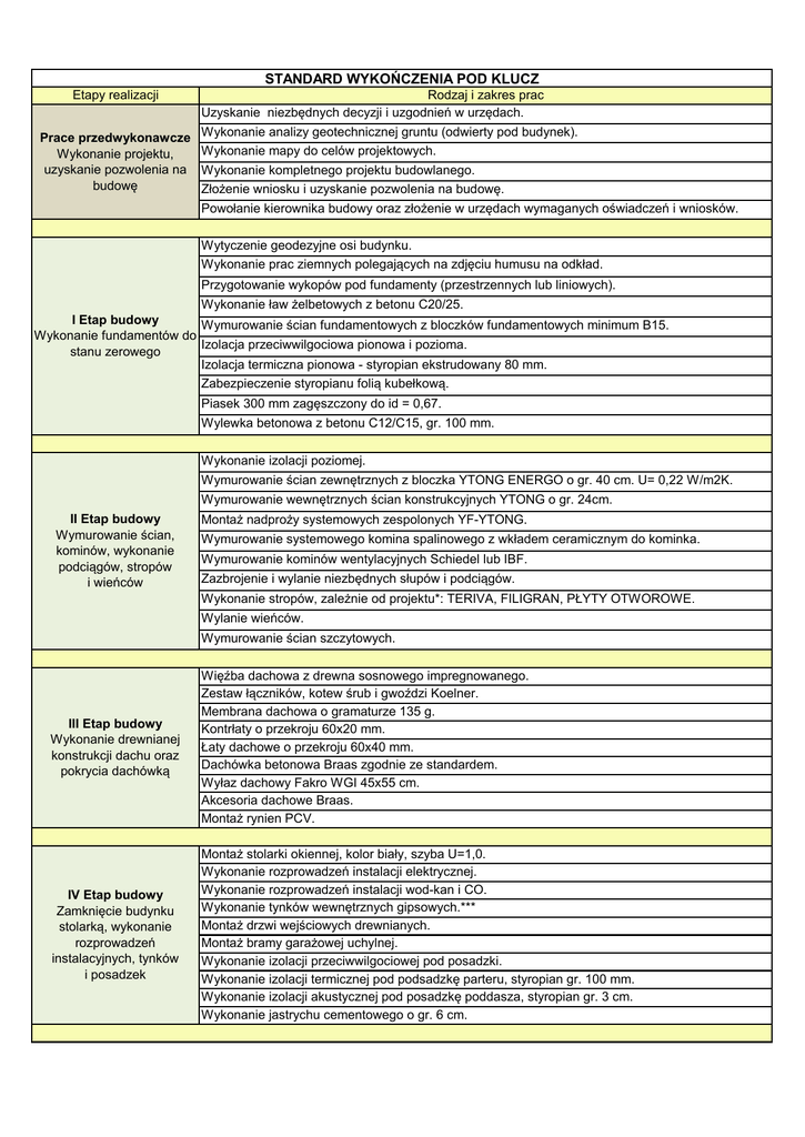 STANDARD WYKOŃCZENIA POD KLUCZ Etapy realizacji Rodzaj i zakres prac Uzyskanie niezbędnych decyzji i uzgodnień w urzędach. Prace przedwykonawcze Wykonanie analizy geotechnicznej gruntu (odwierty pod budynek). Wykonanie mapy do celów projektowych. Wykonanie projektu, uzyskanie pozwolenia na Wykonanie kompletnego projektu budowlanego. budowę Złożenie wniosku i uzyskanie pozwolenia na budowę. Powołanie kierownika budowy oraz złożenie w urzędach wymaganych oświadczeń i wniosków. Wytyczenie geodezyjne osi budynku. Wykonanie prac ziemnych polegających na zdjęciu humusu na odkład. Przygotowanie wykopów pod fundamenty (przestrzennych lub liniowych). Wykonanie ław żelbetowych z betonu C20/25. I Etap budowy Wymurowanie ścian fundamentowych z bloczków fundamentowych minimum B15. Wykonanie fundamentów do Izolacja przeciwwilgociowa pionowa i pozioma. stanu zerowego Izolacja termiczna pionowa - styropian ekstrudowany 80 mm. Zabezpieczenie styropianu folią kubełkową. Piasek 300 mm zagęszczony do id = 0,67. Wylewka betonowa z betonu C12/C15, gr. 100 mm. Wykonanie izolacji poziomej. Wymurowanie ścian zewnętrznych z bloczka YTONG ENERGO o gr. 40 cm. U= 0,22 W/m2K. Wymurowanie wewnętrznych ścian konstrukcyjnych YTONG o gr. 24cm. II Etap budowy Wymurowanie ścian, kominów, wykonanie podciągów, stropów i wieńców Montaż nadproży systemowych zespolonych YF-YTONG. Wymurowanie systemowego komina spalinowego z wkładem ceramicznym do kominka. Wymurowanie kominów wentylacyjnych Schiedel lub IBF. Zazbrojenie i wylanie niezbędnych słupów i podciągów. Wykonanie stropów, zależnie od projektu*: TERIVA, FILIGRAN, PŁYTY OTWOROWE. Wylanie wieńców. Wymurowanie ścian szczytowych. III Etap budowy Wykonanie drewnianej konstrukcji dachu oraz pokrycia dachówką Więźba dachowa z drewna sosnowego impregnowanego. Zestaw łączników, kotew śrub i gwoździ Koelner. Membrana dachowa o gramaturze 135 g. Kontrłaty o przekroju 60x20 mm. Łaty dachowe o przekroju 60x40 mm. Dachówka betonowa Braas zgodnie ze standardem. Wyłaz dachowy Fakro WGI 45x55 cm. Akcesoria dachowe Braas. Montaż rynien PCV. IV Etap budowy Zamknięcie budynku stolarką, wykonanie rozprowadzeń instalacyjnych, tynków i posadzek Montaż stolarki okiennej, kolor biały, szyba U=1,0. Wykonanie rozprowadzeń instalacji elektrycznej. Wykonanie rozprowadzeń instalacji wod-kan i CO. Wykonanie tynków wewnętrznych gipsowych.*** Montaż drzwi wejściowych drewnianych. Montaż bramy garażowej uchylnej. Wykonanie izolacji przeciwwilgociowej pod posadzki. Wykonanie izolacji termicznej pod podsadzkę parteru, styropian gr. 100 mm. Wykonanie izolacji akustycznej pod posadzkę poddasza, styropian gr. 3 cm. Wykonanie jastrychu cementowego o gr. 6 cm. Wykończenie zewnętrzne Dwukrotne zatopienie siatki z włokna szklanego na ścianach i cokole fundamentowym. Zagruntowanie podłoża. Wykończenie elementów okapu podbitką pomalowaną drewnochronem. Montaż parapetów zewnętrznych. Położenie na ścianach struktury barwionej. Położenie na cokole fundamentowym tynku mozaikowego. Wykończenie schodów wejściowych oraz tarasu płytkami według wzornika. Wykończenie wewnętrzne Izolacja termiczna poddasza wełną UNI-MATA λ = 0,039 o łącznej gr. 20 cm. Dotyczy przestrzeni mieszkalnej pomiędzy ogrzewanym poddaszem a nieogrzewanym strychem. Wykonanie paroizolacji z folii PE 200. Wykonanie stelaża z profili stalowych oraz zabudowa poddasza i ścianek kolankowych płytą GK o V Etap budowy Wykończenie wewnętrzne gr. 12,5 mm. W pomieszczeniach łazienkowych płyta wodoodporna. Wykonanie ścianek działowych w systemie suchej zabudowy - gr. 10 cm . Stelaż z profili stalowych i zewnętrzne 75 mm, obustronnie płytaGKF 12,5 mm, wypenienie wełną akustyczną w płycie.** Montaż schodow drabinkowych z poddasza na strych. Montaz osprzętu elektrycznego. Montaż pieca gazowego wraz z grzejnikami. Montaż paparapetów wewnętrznych PCV, kolor biały. Poożenie kafli na podłodze w kuchni oraz pomieszczeniu goospodarczym i wiatrołapie. Gruntowanie oraz dwukrotne malowanie ścian i sufitów farbą akrylową. Montaż drewnianych schodów wewnętrznych ażurowych wraz z drewnianą balustradą. Pomalowanie sufitów na biało w lazience, montaż stelaży WC wraz z ich zabudową płytą GK. Ułożenie paneli laminowanych w pomieszczeniach według projektu (kolor i wzór do wyboru). Montaż listew przyściennych PCV oraz aluminiowych listew progowych między pomieszczeniami. Montaż drzwi wewnętrznych PORTA z ościeżnicami opaskowymi i klamkami. Prace powykonawcze Przeprowadzenie branżowych odbiorów technicznych. Wykonanie mapy powykonawczej z wrysowanym budynkiem i przyłączami. Przygotowanie wniosku i dokumentów niezbędnych do zakończenia procesu budowy. WYKAZ ZASTOSOWANYCH MATERIAŁÓW Branża zewnętrzna Dachówka cementowa Braas, typ Celtycka Lumino. Możliwe kolory: ceglany, ciemnoczerwony, brązowy, grafitowy, czarny. Rynny PCV WAVIN Kanion 125, rury spustowe ᴓ 110. Możliwe kolory: ciemny brąz, czarny, grafit. Okna PCV TERMO PROFIL, kolor biały. Profil 6-cio komorowy Gealan. Szyba U=1,0. Za dopłatą możliwe inne kolory. Drzwi wejściowe drewniane BRB. Wzór skrzydła i kolor do wyboru. Brama garażowa firmy Hoermann lub Wiśniowski, kolor brązowy. Za dopłatą możliwe inne kolory. Parapety zewnętrzne - plytka ceramiczna szkliwiona Cerrad. Do wyboru kolory: brąz, wiśnia, grafit, zielona, miodowa. Elementy wyposażenia Elementy drewniane (podbitka, zewnętrzne krokwie, elementy konstrukcyjne dachu) wykończone DREWNOCHRONEM Nobiles (kolor do wyboru według wzornika). Komin spalinowy do kominka: Schiedel Rondo PLUS 20+W lub IBF CLASSIC. Wykonanie elewacji w systemie FAST. Ściany: tynk silikatowy - baranek 1,5 mm (kolor do wyboru według wzornika). Na opasce fundamentowej tynk mozaikowy (kolor do wyboru według wzornika). Branża wewnętrzna Schody drabinkowe rozkładane z poddasza na strych (biala klapa