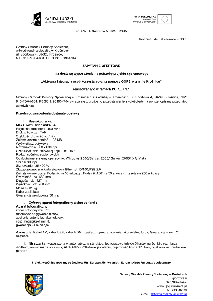 CZŁOWIEK NAJLEPSZA INWESTYCJA Krośnice, dn. 26 czerwca 2013 r. Gminny Ośrodek Pomocy Społecznej w Krośnicach z siedzibą w Krośnicach, ul. Sportowa 4, 56-320 Krośnice, NIP: 916-13-04-684, REGON: 931934704 ZAPYTANIE OFERTOWE na dostawę wyposażenia na potrzeby projektu systemowego „Aktywna integracja osób korzystających z pomocy GOPS w gminie Krośnice” realizowanego w ramach PO KL 7.1.1 Gminny Ośrodek Pomocy Społecznej w Krośnicach z siedzibą w Krośnicach, ul. Sportowa 4, 56-320 Krośnice, NIP: 916-13-04-684, REGON: 931934704 zwraca się z prośbą o przedstawienie swojej oferty na poniżej opisany przedmiot zamówienia: Przedmiot zamówienia obejmuje dostawę: I. Kserokopiarka: Maks. rozmiar nośnika A3 Prędkość procesora 400 MHz Druk w kolorze TAK Szybkość druku 20 str./min. Zainstalowana pamięć 128 MB Wyświetlacz dotykowy Rozdzielczość 600 x 600 dpi Czas uzyskania pierwszej kopii – ok. 16 s. Rodzaj nośnika: papier zwykły Obsługiwane systemy operacyjne: Windows 2000/Server 2003/ Server 2008/ XP/ Vista Skaner 300dpi Skalowanie 25-400 % Złącze zewnętrzne karta sieciowa Ethernet 10/100,USB 2.0 Zainstalowane opcje: Podajnik na 50 arkuszy , Podajnik ADF na 50 arkuszy , Kaseta na 250 arkuszy Szerokość ok. 680 mm Długość ok 1327 mm Wysokość ok. 950 mm Masa ok 31 kg Kabel zasilający Gwarancja producenta 36 msc II. Cyfrowy aparat fotograficzny z akcesoriami : Aparat fotograficzny zoom optyczny min. 3x, możliwość nagrywania filmów, zasilanie baterie lub akumulatory, ilość megapikseli min 8, gwarancja 24 miesiące Akcesoria: Kabel AV, kabel USB, kabel HDMI, zasilacz, oprogramowanie, akumulator, torba, Gwarancja – min. 24 miesiące III. Niszczarka: wyposażona w automatyczny start/stop, jednorazowo tnie do 5 kartek na ścinki o rozmiarze 4x36mm, nowoczesna obudowa, AUTOREVERSE-funkcja cofania, pojemność kosza 17 litrów, opakowanie : tekturowe pudełko. Projekt współfinansowany ze środków Unii Europejskiej w ramach Europejskiego Funduszu Społecznego Gminny Ośrodek Pomocy Społecznej w Krośnicach ul. Sportowa 4 56-320 Krośnice www. gops.krosnice.pl tel. 713846030 e-mail: [email protected] CZŁOWIEK NAJLEPSZA INWESTYCJA IV. Tablica flipchart: metalowa półka na akcesoria na całej szerokości flipchartu, regulowany rozstaw haków umożliwia używanie różnych formatów papieru, regulowana wysokość od 1050 do 1840mm, powierzchnia niemagnetyczna, stabilny dzięki trzem szeroko rozstawianym nogom. V. Termin realizacji zamówienia: 31 lipca 2013 r. VI. Kryteria oceny ofert - Cena– waga 100% Oferta powinna zawierać łączną cenę netto, stawkę podatku VAT i cenę brutto za wykonanie przedmiotu zamówienia oraz szczegółowe ceny (brutto i netto) dla każdego z elementów zamówienia osobno.. Inne istotne warunki zamówienia: Oferta powinna zawierać co najmniej: - Nazwę, dane teleadresowe oferenta oraz NIP i REGON - Nazwę zadania: „Zapytanie ofertowe na dostawę wyposażenia na potrzeby projektu systemowego „Aktywna integracja osób korzystających z pomocy GOPS w gminie Krośnice” realizowanego w ramach PO KL 7.1.1” - Wartość oferty - Oferta powinna zawierać cenę netto, stawkę podatku VAT i cenę brutto za wykonanie przedmiotu zamówienia oraz szczegółowe ceny (brutto i netto) dla każdego z elementów zamówienia osobno. - Datę sporządzenia oferty - Podpis osoby upoważnionej Szacunkowa wartość zamówienia 3000,00 zł brutto. Oferty należy składać w terminie do dnia: 3 lipca 2013 r. (decyduje data wpływu do siedziby Zamawiającego) Oferta może być przesłana za pośrednictwem: - poczty na adres: Gminny Ośrodek Pomocy Społecznej w Krośnicach, ul. Sportowa 4, 56-320 Krośnice - poczty elektronicznej na adres e-mail: [email protected] lub dostarczona osobiście do siedziby Zamawiającego, Gminny Ośrodek Pomocy Społecznej ul. Sportowa 4, 56-320 Krośnice, pok. Nr 4. Codziennie od poniedziałku do piątku od 8.00 do 15.00 (dni robocze) W przypadku składania oferty pocztą tradycyjną lub osobiście na kopercie należy zaznaczyć „Zapytanie ofertowe na dostawę wyposażenia dla projektu systemowego „Aktywna integracja osób korzystających z pomocy GOPS w gminie Krośnice”” Osoba do kontaktu: Eliza Piotrowska, [email protected], tel 601 610 671 Projekt współfinansowany ze środków Unii Europejskiej w ramach Europejskiego Funduszu Społecznego Gminny Ośrodek Pomocy Społecznej w Krośnicach ul. Sportowa 4 56-320 Krośnice www. gops.krosnice.pl tel. 713846030 e-mail: [email protected]