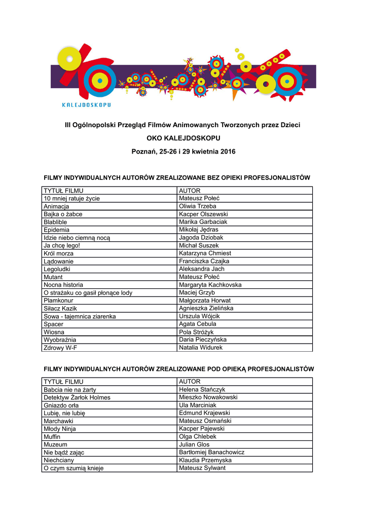 III Ogólnopolski Przegląd Filmów Animowanych Tworzonych przez Dzieci OKO KALEJDOSKOPU Poznań, 25-26 i 29 kwietnia 2016 FILMY INDYWIDUALNYCH AUTORÓW ZREALIZOWANE BEZ OPIEKI PROFESJONALISTÓW TYTUŁ FILMU 10 mniej ratuje życie Animacja Bajka o żabce Blablible Epidemia Idzie niebo ciemną nocą Ja chcę lego! Król morza Lądowanie Legoludki Mutant Nocna historia O strażaku co gasił płonące lody Plamkonur Siłacz Kazik Sowa - tajemnica ziarenka Spacer Wiosna Wyobraźnia Zdrowy W-F AUTOR Mateusz Połeć Oliwia Trzeba Kacper Olszewski Marika Garbaciak Mikołaj Jędras Jagoda Dziobak Michał Suszek Katarzyna Chmiest Franciszka Czajka Aleksandra Jach Mateusz Połeć Margaryta Kachkovska Maciej Grzyb Małgorzata Horwat Agnieszka Zielińska Urszula Wójcik Agata Cebula Pola Stróżyk Daria Pieczyńska Natalia Widurek FILMY INDYWIDUALNYCH AUTORÓW ZREALIZOWANE POD OPIEKĄ PROFESJONALISTÓW TYTUŁ FILMU Babcia nie na żarty Detektyw Żarłok Holmes Gniazdo orła Lubię, nie lubię Marchawki Młody Ninja Muffin Muzeum Nie bądź zając Niechciany O czym szumią knieje AUTOR Helena Stańczyk Mieszko Nowakowski Ula Marciniak Edmund Krajewski Mateusz Osmański Kacper Pajewski Olga Chlebek Julian Glos Bartłomiej Banachowicz Klaudia Przemyska Mateusz Sylwant Ornitolog Pchły Pęd Piórka Poszukiwanie głowy Pozytywka Pożar na moście Przepiękny Dzień Przeszłość Race Rosiczka Smok Spryciarz Teatszyk Tv, Telewizja publiczna Wyspa Zemsta profesora Zima Żarty Karina Gomółka Julia Maciaszek Szymon Ruczyński Maria Kulisz Edmund Krajewski Jagoda Krajewska Franciszek Warchoł Jakub Widlarz Adelajda Kawałkowska Adam Styrna Maksymilian Sawiński Bazyli Jędrzejewski Ewa Genew Zuzanna Zawłocka Bazyli Jędrzejewski Klaudia Przemyska Konrad Urbański Bartłomiej Banachowicz Jonasz Oleś FILMY KILKU AUTORÓW ZREALIZOWANE BEZ OPIEKI PROFESJONALISTÓW TYTUŁ FILMU Doktor Dolittle Iluzja Instrumenty muzyczne Ka-bum Kim ja jestem Kino tęcza Kosmiczna bitwa Król i morze. Wybór 21 krótkich opowiastek Legenda o jeziorze Niesłysz Leon Kameleon Ludowe balety Metamorfozy Mniejszy nie znaczy słabszy Nasz pierwszy film Nasza szkoła Pająk książkożerca Panda w tarapatach Pokój Przygoda w szkole strachu Przygody Kapelusznika Romantyczny koniec zimy Rośliny mówią stop bateriom Rycerz w kwiatki Sen kuleczki Siła miłości Szczecineckie czarownice Śmigol odtłuszcza Hulka INSTYTUCJA Wejherowskie Centrum Kultury Młodzieżowy Dom Kultury w Białymstoku Klub Filmowy "Avatar" - Zespół Szkół z Oddziałami Integracyjnymi w Łomnicy Zespół Szkół im. Gen. J. Bema w Dębowej Łące Galeria i Ośrodek Plastycznej Twórczości Dziecka w Toruniu Pracownia Komuny Paryskiej 45, Wrocław Galeria i Ośrodek Plastycznej Twórczości Dziecka w Toruniu Młodzieżowy Dom Kultury w Rzeszowie ZSO nr 3 Szkoła Podstawowa nr 17 w Gorzowie Wielkopolskim Zespół Szkół im. Gen. J. Bema w Dębowej Łące Zespół Szkół w Myśliwcu Zespół Szkół Społecznych STO w Szczecinku Szkoła Podstawowa nr 2 w Kamieniu Pomorskim Przedszkole nr 89 w Poznaniu Publiczna Szkoła Podstawowa nr 1 w Głuchołazach Szkoła Podstawowa nr 59 w Szczecinie Szkoła Podstawowa w Pogórzu Galeria i Ośrodek Plastycznej Twórczości Dziecka w Toruniu Zespół Szkół w Myśliwcu Wejherowskie Centrum Kultury Szkoła Podstawowa nr 2 w Kamieniu Pomorskim Szkoła Podstawowa nr 59 w Szczecinie Legnickie Centrum Kultury Klub Filmowy "Avatar" - Zespół Szkół z Oddziałami Integracyjnymi w Łomnicy Publiczna Szkoła Podstawowa w Nowym Świętowie Zespół Szkół Społecznych STO w Szczecinku Zespół Szkół w Myśliwcu Zaćmienie Zagubiona torebka Mamy Muminka Legnickie Centrum Kultury Szkoła Podstawowa nr 59 w Szczecinie FILMY KILKU AUTORÓW ZREALIZOWANE POD OPIEKĄ PROFESJONALISTÓW TYTUŁ FILMU Balony Basen Chłopiec i pingwin Czarna owca Dzielni z Dzielni - Epizod I Nowa Nadzieja Dzielni z Dzielni - Epizod III Na tropie marzeń Jak róg dostał nóg Janek Groszek Kolorki Kosmos Król gór Podwodny świat Poszukiwacze Zaginionej Legontydy Senne nutki W cztery dni dookoła świata Wakacje Smoka Bonawentury Wielkie bum INSTYTUCJA Pracownia Animacji w CK ZAMEK w Poznaniu Centrum Sztuki Dziecka w Poznaniu Miomidor, Józefosław I Społeczne Liceum Ogólnokształcące i Społeczne Gimnazjum nr 2 w Częstochowie Dzielnicowy Dom Kultury "Węglin", Lublin Dzielnicowy Dom Kultury "Węglin", Lublin Centrum Sztuki Dziecka w Poznaniu Centrum Sztuki Dziecka w Poznaniu Gminny Ośrodek Kultury i Sportu, Legnickie Pole Muzeum Kinematografii w Łodzi Fundacja IKS, Kraków Muzeum Kinematografii w Łodzi Centrum Sztuki Dziecka w Poznaniu Gminny Ośrodek Kultury i Sportu, Legnickie Pole Centrum Sztuki Dziecka w Poznaniu Dom Kultury "Podgórze" - Dwór Czeczów, Kraków Centrum Młodzieży im. dr. H. Jordana w Krakowie