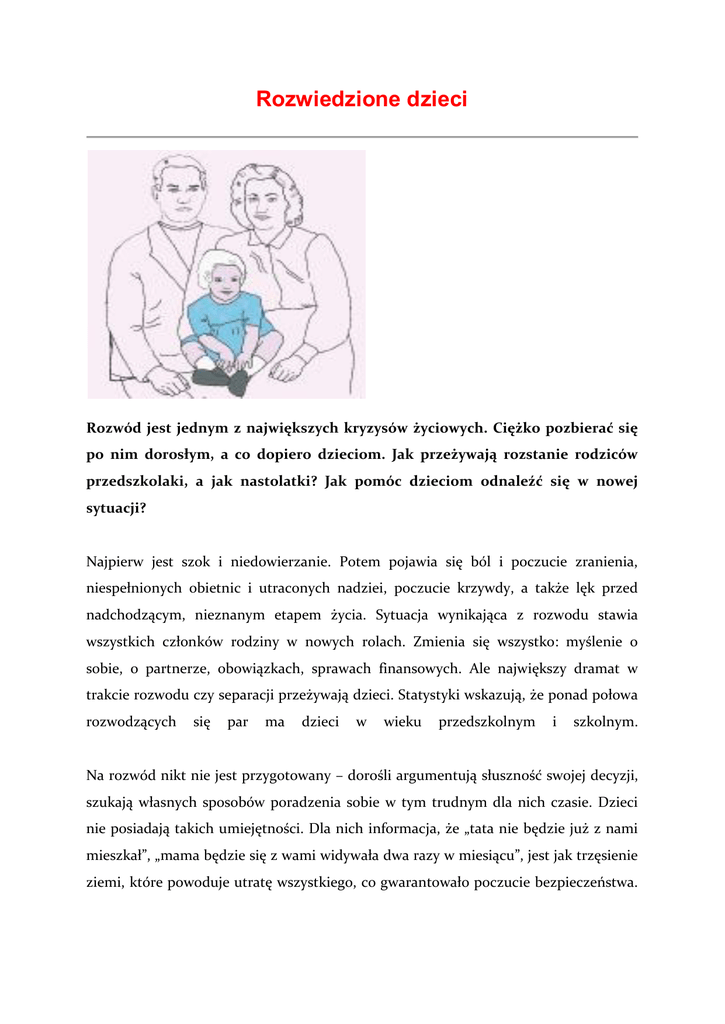 Rozwiedzione dzieci Rozwód jest jednym z największych kryzysów życiowych. Ciężko pozbierać się po nim dorosłym, a co dopiero dzieciom. Jak przeżywają rozstanie rodziców przedszkolaki, a jak nastolatki? Jak pomóc dzieciom odnaleźć się w nowej sytuacji? Najpierw jest szok i niedowierzanie. Potem pojawia się ból i poczucie zranienia, niespełnionych obietnic i utraconych nadziei, poczucie krzywdy, a także lęk przed nadchodzącym, nieznanym etapem życia. Sytuacja wynikająca z rozwodu stawia wszystkich członków rodziny w nowych rolach. Zmienia się wszystko: myślenie o sobie, o partnerze, obowiązkach, sprawach finansowych. Ale największy dramat w trakcie rozwodu czy separacji przeżywają dzieci. Statystyki wskazują, że ponad połowa rozwodzących się par ma dzieci w wieku przedszkolnym i szkolnym. Na rozwód nikt nie jest przygotowany – dorośli argumentują słuszność swojej decyzji, szukają własnych sposobów poradzenia sobie w tym trudnym dla nich czasie. Dzieci nie posiadają takich umiejętności. Dla nich informacja, że „tata nie będzie już z nami mieszkał”, „mama będzie się z wami widywała dwa razy w miesiącu”, jest jak trzęsienie ziemi, które powoduje utratę wszystkiego, co gwarantowało poczucie bezpieczeństwa. W trakcie podejmowania decyzji o separacji czy rozwodzie rodzice zapominają o dziecku, choć obowiązkiem rodzica jest ochrona dziecka przed negatywnymi skutkami konfliktu, w jakim uczestniczy, a przecież rozpad małżeństwa nie jest równoznaczny z zaprzestania bycia rodzicem. Dziecko w emocjach Rodzicom wydaje się często, że rozstanie to tylko ich problem. Dzieci zwykle na długo przed rozwodem odbierają sygnały zachodzących zmian. Napięta atmosfera w domu, krzyki, kłótnie, „ciche dni” wywołują u nich uczucie zagubienia, bezradności i osamotnienia. Rodzice zaabsorbowani są sobą, próbują poradzić sobie ze stresem, jaki towarzyszy rozwodowi, i nawet nie uświadamiają sobie, że mniej czasu poświęcają dzieciom, zostawiając je same z ich problemami. Dorośli są wiecznie podenerwowani, niecierpliwią się, nie rozmawiają z dziećmi o tym, co dzieje się między mamą a tatą, aż pewnego dnia jedno z rodziców znika. Znikają też rzeczy osobiste, które na co dzień stanowiły o obecności rodzica w domu. Dziecko czuje się zdezorientowane i odpowiedzialne za to, co się stało. Nie ma świadomości, że ten pełen zmian i destabilizacji okres rozwodu rodziców to sytuacja przejściowa. Narasta w nim poczucie lęku, że któregoś dnia może zniknąć i drugi rodzic, a ono zostanie samo. Zastanawia się, co teraz z nim będzie, czy oboje rodzice jeszcze je kochają, z kim będzie mieszkać. Dzieci do lat 5 mogą być bardziej płaczliwe niż zwykle, niespokojne, miewają trudności ze snem, jedzeniem, są rozdrażnione. Niekiedy zapominają umiejętności nabytych w poprzednich okresach rozwoju. Dzieje się tak dlatego, że dzieci nie rozumieją zmian zachodzących w ich życiu. Nie mają jeszcze ukształtowanych pojęć czasu czy odległości, dlatego wszystkie zachodzące dookoła zmiany (jak np. wyprowadzka rodzica) mają dla nich charakter trwały i nieodwracalny. Dziecko w tym wieku nie posiada jeszcze odpowiednich umiejętności, by poradzić sobie z tą sytuacją, nie znajduje żadnego sposobu na pocieszenie, dlatego najczęściej szuka winowajcy, obarczając winą za zmiany siebie lub któregoś z rodziców. Ważne jest, by w tym okresie, trudnym dla samych dorosłych, znaleźć więcej czasu na rozmowę z dzieckiem, wspólną zabawę, punktualne odbieranie z przedszkola, zapewnianie dziecka, że się go nie opuści, okazywanie mu ciepła i zrozumienia dla jego zachowań. Dzieci w wieku wczesnoszkolnym dostrzegają związki przyczynowo-skutkowe, stają się bardziej samodzielne. Napięcie i stres wywołane nową nieoswojoną sytuacją mogą objawiać się pogorszeniem wyników w nauce, problemami w zachowaniu, niską samooceną, wycofaniem się z życia społecznego; mogą też pojawić się kłopoty ze zdrowiem (często nasilające się przed lub po spotkaniu z rodzicem dochodzącym). Na plan pierwszy wysuwa się myśl: „Jaki teraz będzie mój dom?” . Dzieci w tym wieku mogą uciekać w świat fantazji, często myląc ją z rzeczywistością. Często obwiniają siebie za rozwód rodziców. Ku zdziwieniu rodziców wypierają z pamięci awantury, krzyki, zaprzeczają faktom, bo za wszelką cenę chcą utrzymać oboje rodziców przy sobie. Zmiany w zachowaniu najczęściej widoczne są w szkole i w kontaktach z rówieśnikami. Dzieci w wieku 9–10 lat gniew kierują przede wszystkim na rodziców (mniej na kolegów ze szkoły). W tym wieku wzrasta świadomość dziecka na temat powodów rozwodu i jego konsekwencji. Bywa że tworzą przymierze z jednym z rodziców (niekoniecznie z tym, z którym są najbliżej), drugiego osądzają, przejawiają względem niego wrogie emocje. Niekiedy buntują młodsze rodzeństwo przeciwko rodzicom, demonstrują postawę osoby decydującej. Zachowania te są wynikiem utraty obecności dwojga rodziców, która gwarantowała im bezpieczeństwo. Dzieci w wieku 13–18 lat na wiadomość o rozwodzie mogą zareagować paniką, obojętnością lub nawet radością. Nastolatki mają skłonność do zachowań nieprzewidywalnych i skrajnych. W okresie dojrzewania dzieci potrzebują spokoju i ochrony ze strony rodziców, zwłaszcza że przed nimi burza hormonalna, która może dodatkowo utrudnić im kontakt z otoczeniem. Nastoletnie dzieci przyjmują na siebie rolę opiekuna młodszego rodzeństwa i nierzadko pocieszyciela skrzywdzonego rodzica, co skutkuje odrzuceniem drugiego rodzica. Często wycofują się z kontaktu z rodzicami, a poszukują zainteresowania i wartości w gronie rówieśników. Mogą pojawiać się problemy wychowawcze (od wagarów do drobnych przestępstw). Nastolatek manipuluje sprawnie rodzicami, by osiągnąć własne korzyści, zwła