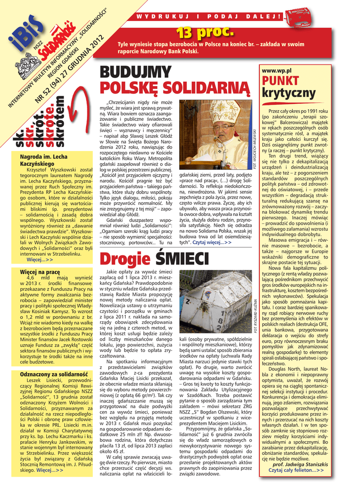 „S OL ID AR 20 NO 12 ŚC I” Więcej na pracę 4,6 mld mają wynieść w 2013 r. środki finansowe przekazane z Funduszu Pracy na aktywne formy zwalczania bezrobocia – zapowiedział minister pracy i polityki społecznej Władysław Kosiniak Kamysz. To wzrost o 1,2 mld w porównaniu z br. Wciąż nie wiadomo kiedy na walkę z bezrobociem będą przeznaczane wszystkie środki z Funduszu Pracy Minister finansów Jacek Rostowski uznaje Fundusz za „zwykłą” część sektora finansów publicznych i wykorzystuje te środki także na inne cele budżetowe. Odznaczony za solidarność Leszek Lisiecki, przewodniczący Regionalnej Komisji Rewizyjnej Regionu Gdańskiego NSZZ „Solidarność”, 13 grudnia został odznaczony Krzyżem Wolności i Solidarności, przyznawanym za działalność na rzecz niepodległości Polski i obronę praw człowieka w okresie PRL. Lisiecki m.in. działał w Komisji Charytatywnej przy ks. bp. Lechu Kaczmarku i ks. prałacie Henryku Jankowskim, w stanie wojennym był internowany w Strzebielinku. Przez większość życia był związany z Gdańską Stocznią Remontową im. J. Piłsudskiego. Więcej...>> P O D A J 13 proc. D A L E J ! Tyle wyniesie stopa bezrobocia w Polsce na koniec br. – zakłada w swoim raporcie Narodowy Bank Polski. BUDUJMY POLSKĘ SOLIDARNĄ „Chrześcijanin nigdy nie może myśleć, że wiara jest sprawą prywatną. Wiara bowiem oznacza zaangażowanie i publiczne świadectwo. Takie świadectwo wiary ofiarowali święci – wyznawcy i męczennicy” – napisał abp Sławoj Leszek Głódź w Słowie na Święta Bożego Narodzenia 2012 roku, nawiązując do rozpoczętego niedawno w Kościele katolickim Roku Wiary. Metropolita gdański zaapelował również o dialog w polskiej przestrzeni publicznej. „Kościół jest przyjacielem ojczyzny i narodu. Kościół pragnie też być przyjacielem państwa – takiego państwa, które służy dobru wspólnoty. Tylko język dialogu, miłości, pokoju może przywrócić normalność. My nie zrezygnujemy z tej misji” – zapowiedział abp Głódź. Gdański duszpasterz wspomniał również ludzi „Solidarności”: „Ogarniam szeroki krąg ludzi pracy – nie sposób wymienić specjalności: stoczniowcy, portowców... Tu na www.wp.pl PUNKT krytyczny FOT. WOJCIECH MILEWSKI Krzysztof Wyszkowski został tegorocznym laureatem Nagrody im. Lecha Kaczyńskiego, przyznawanej przez Ruch Społeczny im. Prezydenta RP Lecha Kaczyńskiego osobom, które w działalności publicznej kierują się wartościami bliskimi śp. prezydentowi – solidarnością i zasadą dobra wspólnego. Wyszkowski został wyróżniony również za „dawanie świadectwa prawdzie”. Wyszkowski i Lech Kaczyński wspólnie działali w Wolnych Związkach Zawodowych i „Solidarności” oraz byli internowani w Strzebielinku. Więcej...>> I gdańskiej ziemi, przed laty, podjęto »prace nad pracą«, (…) drogę Solidarności. To refleksja niedokończona, niewdrożona. W jakimś sensie zepchnięta z pola życia, przez nowe, często wilcze prawa. Życzę, aby ich ubywało, aby wasza praca przynosiła owoce dobra, wpływała na kształt życia, służyła dobru rodzin, przynosiła satysfakcję. Niech się odradza na nowo Solidarna Polska, wszak jej budowa trwa od lat osiemdziesiątych”. Czytaj więcej...>> Drogie ŚMIECI Jakie opłaty za wywóz śmieci zapłacą od 1 lipca 2013 r. mieszkańcy Gdańska? Prawdopodobnie w styczniu władze Gdańska przedstawią Radzie Miasta propozycję nowej metody naliczania opłat. Nowelizacja ustawy o utrzymaniu czystości i porządku w gminach z lipca 2011 r. nakłada na samorządy obowiązek zdecydowania się na jedną z czterech metod, w której koszt usługi będzie zależy od liczby mieszkańców danego lokalu, jego powierzchni, zużycia wody lub będzie to opłata zryczałtowana. Na spotkaniu informacyjnym z przedstawicielami związków zawodowych z-ca prezydenta Gdańska Maciej Lisicki przekazał, że obecnie władze miasta skłaniają się do wyboru metody powierzchniowej (z opłatą 66 gr/m2). Tak czy inaczej gdańszczanie muszą się przygotować na duże podwyżki cen za wywóz śmieci, ponieważ bez względu na przyjętą metodę w 2013 r. Gdańsk musi pozyskać na gospodarowanie odpadami dodatkowe 25 mln zł! Np. dwuosobowa rodzina, która dotychczas płaciła 13 zł, od lipca 2013 zapłaci około 45 zł. W całej sprawie zwracają uwagę dwie rzeczy. Po pierwsze, miasto chce przerzucić część decyzji ws. naliczania opłat na właścicieli lo- FOT. RYSZARD KUŹMA DN IA BI NS UL ZZ ET YN RE GI INF ON O R GD MA A C RU ŃSK YJNY I iB iS sk. skr. N skrót. R 52 skróte. (94) skrótem 27 G IN TE RN ET OW Y Nagroda im. Lecha Kaczyńskiego W Y D R U K U J kali (osoby prywatne, spółdzielnie i wspólnoty mieszkaniowe), którzy będą sami ustalać sposób zbierania środków na opłaty (uchwała Rady Miasta narzuci jedynie stawki tych opłat). Po drugie, warto zwrócić uwagę na wysokie koszty gospodarowania odpadami w Gdańsku. – Gros tej kwoty to koszty funkcjonowania Zakładu Utylizacyjnego w Szadółkach. Trzeba postawić pytanie o sposób zarządzania tym zakładem – mówi sekretarz ZRG NSZZ „S” Bogdan Olszewski, który uczestniczył w spotkaniu z wiceprezydentem Maciejem Lisickim. Przypomnijmy, że gdańska „Solidarność” już 6 grudnia zwróciła się do władz samorządowych o niewykorzystywanie nowego systemu gospodarki odpadami do drastycznych podwyżek opłat oraz przesłanie projektowanych aktów prawnych do zaopiniowania przez związki zawodowe. Przez cały okres po 1991 roku (po zakończeniu „terapii szokowej” Balcerowicza) majątek w rękach poszczególnych osób systematycznie rósł, a majątek kraju jako całości kurczył się. Dziś osiągnęliśmy punkt zwrotny (a raczej – punkt krytyczny). Ten drugi trend, wiążący się nie tylko z dekapitalizacją urządzeń i deindustrializacją kraju, ale też – z pogorszeniem standardów poszczególnych poli