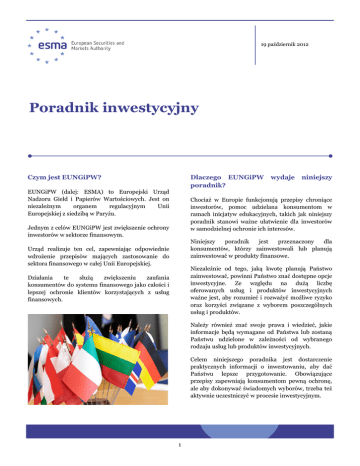 19 październik 2012 Poradnik inwestycyjny Czym jest EUNGiPW? Dlaczego EUNGiPW poradnik? EUNGiPW (dalej: ESMA) to Europejski Urząd Nadzoru Giełd i Papierów Wartościowych. Jest on niezależnym organem regulacyjnym Unii Europejskiej z siedzibą w Paryżu. wydaje niniejszy Chociaż w Europie funkcjonują przepisy chroniące inwestorów, pomoc udzielana konsumentom w ramach inicjatyw edukacyjnych, takich jak niniejszy poradnik stanowi ważne ułatwienie dla inwestorów w samodzielnej ochronie ich interesów. Jednym z celów EUNGiPW jest zwiększenie ochrony inwestorów w sektorze finansowym. Niniejszy poradnik jest przeznaczony dla konsumentów, którzy zainwestowali lub planują zainwestować w produkty finansowe. Urząd realizuje ten cel, zapewniając odpowiednie wdrożenie przepisów mających zastosowanie do sektora finansowego w całej Unii Europejskiej. Niezależnie od tego, jaką kwotę planują Państwo zainwestować, powinni Państwo znać dostępne opcje inwestycyjne. Ze względu na dużą liczbę oferowanych usług i produktów inwestycyjnych ważne jest, aby rozumieć i rozważyć możliwe ryzyko oraz korzyści związane z wyborem poszczególnych usług i produktów. Działania te służą zwiększeniu zaufania konsumentów do systemu finansowego jako całości i lepszej ochronie klientów korzystających z usług finansowych. Należy również znać swoje prawa i wiedzieć, jakie informacje będą wymagane od Państwa lub zostaną Państwu udzielone w zależności od wybranego rodzaju usług lub produktów inwestycyjnych. Celem niniejszego poradnika jest dostarczenie praktycznych informacji o inwestowaniu, aby dać Państwu lepsze przygotowanie. Obowiązujące przepisy zapewniają konsumentom pewną ochronę, ale aby dokonywać świadomych wyborów, trzeba też aktywnie uczestniczyć w procesie inwestycyjnym. 1 Jakie rodzaje usług inwestycyjnych są dostępne? Inwestując, należy zastanowić się, jakiego rodzaju i poziomu wsparcia oczekują Państwo od firmy inwestycyjnej lub dostawcy usług inwestycyjnych – pozwoli to ograniczyć wybór do tych firm, które mogą spełnić Państwa potrzeby. Pełna świadomość swoich celów może pozwolić uniknąć płacenia za niepotrzebne w rzeczywistości usługi lub wyboru firmy, która nie jest w stanie spełnić Państwa oczekiwań. Dostępne są następujące usługi inwestycyjne: Na jakie pytania trzeba odpowiedzieć, korzystając z usług doradztwa i n w e s t yc y j n e g o l u b z a r z ą d z a n i a portfelem? Doradztwo inwestycyjne: otrzymują Państwo osobiste zalecenia dotyczące produktów. Ta usługa jest najwłaściwsza dla inwestorów, którzy pragną podejmować własne decyzje inwestycyjne, ale zarazem chcą uzyskać wsparcie i specjalistyczne porady doradców finansowych. Wybierając doradztwo lub zarządzanie portfelem, polegają Państwo na firmie inwestycyjnej w większym stopniu niż w przypadku transakcji realizowanych bez doradztwa. Dlatego muszą Państwo żywić przekonanie, że firma ta rozumie Państwa indywidualne potrzeby i sytuację, dzięki czemu może zalecić odpowiedni produkt, kupić go lub sprzedać w Państwa imieniu. Inwestowanie (lub obrót) bez doradztwa inwestycyjnego: firma inwestycyjna przyjmuje od Państwa, a następnie przekazuje lub realizuje zlecenia zakupu lub sprzedaży produktów bez udzielania porad. Ta usługa jest zazwyczaj najwłaściwsza dla bardziej doświadczonych lub samodzielnych inwestorów, którzy potrafią we własnym zakresie gromadzić i oceniać informacje na temat produktów oraz potrafią podejmować decyzje inwestycyjne bez pomocy z zewnątrz. Ten rodzaj usług coraz częściej bywa świadczony za pośrednictwem Internetu. Ważne jest, aby firma uzyskała od Państwa pełne i dokładne informacje pozwalające jej zalecić lub wybrać odpowiednie produkty. Dostarczenie prawidłowych, aktualnych i pełnych informacji leży w Państwa najlepiej pojętym interesie. Należy również informować ją o wszelkich znaczących zmianach w swojej sytuacji. Obowiązkiem firmy jest zachować wszystkie takie informacje w poufności. Zarządzanie portfelem: inwestycjami zarządza w Państwa imieniu firma inwestycyjna i polegają Państwo na jej decyzjach oraz wyborach. Firma nie kontaktuje się z Państwem przy dokonywaniu każdej kolejnej inwestycji, ma jednak obowiązek regularnie składać sprawozdania z działań podejmowanych w Państwa imieniu. Ta usługa (zarządzanie portfelem) jest najwłaściwsza dla inwestorów, którzy są skłonni zlecać wybór inwestycji innym osobom. 2 Firma będzie musiała zadać Państwu kilka pytań w ramach tzw. oceny odpowiedniości. Pytania te dotyczą Państwa celów inwestycyjnych, sytuacji finansowej oraz wiedzy i doświadczenia. Firma dostosuje swoje zalecenia zależnie od Państwa odpowiedzi. w banku, nieruchomości lub innych inwestycji). Firma powinna też w stosownych przypadkach zgromadzić informacje o warunkach, zasadach dostępu, kredytach, gwarancjach i innych możliwych ograniczeniach dotyczących powyższych aktywów. Cele inwestycyjne – pytania na temat Państwa celów inwestycyjnych mogą obejmować następujące kwestie: Cel inwestycji. Mogą Państwo na przykład inwestować, aby osiągać dochód (regularne płatności, takie jak dywidendy czy odsetki) lub zwiększenie kapitału (wzrost wartości kapitału na koniec okresu zapadalności inwestycji) albo też chronić swój kapitał. Informacje te mają również związek z Państwa gotowością do podejmowania ryzyka i profilem ryzyka. Podsumowanie zobowiązań finansowych, w tym regularnych (na przykład czynszu, czesnego, składek ubezpieczenia na życie). Wysokość regularnych i całkowitych dochodów, ich stały lub tymczasowy charakter oraz źródło tych dochodów (np. stosunek pracy, emerytura, dochody z inwestycji, dochody z wynajmu itp.). Ubezpieczenie zdrowotne. Kwotę inwestycji. Plany zabezpieczenia emerytalnego. Okres, przez który pragną Państwo 
