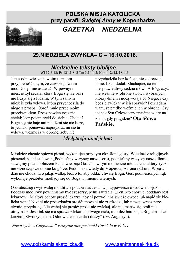 POLSKA MISJA KATOLICKA przy parafii Świętej Anny w Kopenhadze GAZETKA NIEDZIELNA 29.NIEDZIELA ZWYKŁA– C – 16.10.2016. Niedzielne teksty biblijne: Wj 17,8-13; Ps 121,1-8; 2 Tm 3,14-4,2; Hbr 4,12; Łk 18,1-8 Jezus odpowiedział swoim uczniom przypowieść o tym, że zawsze powinni modlić się i nie ustawać: W pewnym mieście żył sędzia, który Boga się nie bał i nie liczył się z ludźmi. W tym samym mieście żyła wdowa, która przychodziła do niego z prośbą: Obroń mnie przed moim przeciwnikiem. Przez pewien czas nie chciał; lecz potem rzekł do siebie: Chociaż Boga się nie boję ani z ludźmi się nie liczę, to jednak, ponieważ naprzykrza mi się ta wdowa, wezmę ją w obronę, żeby nie przychodziła bez końca i nie zadręczała mnie. I Pan dodał: Słuchajcie, co ten niesprawiedliwy sędzia mówi. A Bóg, czyż nie weźmie w obronę swoich wybranych, którzy dniem i nocą wołają do Niego, i czy będzie zwlekał w ich sprawie? Powiadam wam, że prędko weźmie ich w obronę. Czy jednak Syn Człowieczy znajdzie wiarę na ziemi, gdy przyjdzie? Oto Słowo Pańskie. Medytacja niedzielna: Młodzież chętnie śpiewa pieśni, wykonując przy tym określone gesty. W jednej z religijnych piosenek są takie słowa: „Podnieśmy wszyscy nasze serca, podnieśmy wszyscy nasze dłonie, stawajmy przed obliczem Pana, wielbiąc Go…” – w tym momencie młodzi charakterystycznie wznoszą swe dłonie ku górze. Podobni są wtedy do Mojżesza, Aarona i Chura. Wprawdzie nie chodzi tu o jakąś walkę, lecz o to, aby oddać chwałę Bogu. Gest podniesionych rąk wykonuje prezbiter modlący się do Boga w imieniu wiernych. O skutecznej i wytrwałej modlitwie poucza nas Jezus w przypowieści o wdowie i sędzi. Podczas modlitwy powinniśmy być szczerzy, pełni zaufania. „Ten, kto choruje, poddany jest lekarzowi. Miałbyś ochotę prosić lekarza, aby ci pozwolił na świeże owoce lub napić się kielicha wina? Nikt ci nie przeszkadza prosić: może ci nie zaszkodzi, lub nawet, wręcz przeciwnie, przyda się. Nie wahaj się prosić: proś i nie zwlekaj, ale nie martw się, jeśli nie otrzymasz. Jeśli tak się ma sprawa z lekarzem twego ciała, to o ileż bardziej z Bogiem – Lekarzem, Stworzycielem, Odnowicielem ciała i duszy” (św. Augustyn). Nowe życie w Chrystusie” Program duszpasterski Kościoła w Polsce www.polskamisjakatolicka.dk www.sanktannaekirke.dk Nowenna Pompejańska trwa 54 dni. Każdego dnia odmawiamy trzy części Różańca Świętego (radosną, bolesną i chwalebną). Jeśli ktoś chce, może odmawiać czwartą część z Tajemnicami Światła. Przed rozpoczęciem każdej z wszystkich trzech części różańca, wymieniamy najpierw intencję (tylko jedną), a następnie mówimy: Ten Różaniec odmawiam na Twoją cześć, Królowo Różańca Świętego. Przez 27 dni odmawiamy część błagalną nowenny pompejańskiej i codziennie, na końcu różańca, odmawiamy następującą modlitwę: Pomnij o miłosierna Panno Różańcowa z Pompejów, jako nigdy jeszcze nie słyszano, aby ktokolwiek z czcicieli Twoich, z Różańcem Twoim, pomocy Twojej wzywający, miał być przez Ciebie opuszczony. Ach, nie gardź prośbą moją, o Matko Słowa Przedwiecznego, ale przez święty Twój różaniec i przez upodobanie, jakie okazujesz dla Twojej świątyni w Pompejach wysłuchaj mnie dobrotliwie. Amen. Przez pozostałe 27 dni odmawiamy część dziękczynną nowenny Pompejańskiej i codziennie, na końcu różańca, odmawiamy następującą modlitwę: Cóż Ci dać mogę, o Królowo pełna miłości? Moje całe życie poświęcam Tobie. Ile mi sił starczy, będę rozszerzać cześć Twoją, o Dziewico Różańca Świętego z Pompejów, bo gdy Twojej pomocy wezwałem, nawiedziła mnie łaska Boża. Wszędzie będę opowiadać o miłosierdziu, które mi wyświadczyłaś. O ile zdołam będę rozszerzać nabożeństwo do Różańca Świętego, wszystkim głosić będę, jak dobrotliwie obeszłaś się ze mną, aby i niegodni, tak jak i ja, grzesznicy, z zaufaniem do Ciebie się udawali. O, gdyby cały świat wiedział jak jesteś dobra, jaką masz litość nad cierpiącymi, wszystkie stworzenia uciekałyby się do Ciebie. Amen. www.polskamisjakatolicka.dk www.sanktannaekirke.dk Niedziela 16 X 2016 Poniedziałek 17 X 2016 Wtorek 18 X 2016 Środa 19 X 2016 Czwartek 20 X 2016. Piątek 21 X 2016 Sobota 22 X 2016 29.NIEDZIELA ZWYKŁA –– „C”. 16 X 2016 2 Krl 5,14-17; Ps 98,1-4; 2 Tm 2,8-13; Łk 17,11-19 Wspom. św. Ignacego Antiocheńskiego, bpa i męczennika Ef 2,1-10; Ps 100,1-5; Mt 5,3; Łk 12,13-21 Święto św. Łukasza Ewangelisty 2 Tm 4,9-17a; Ps 145,10-13.17-18; Łk 10,1-9 Wspom. bł. Jerzego Popiełuszki, prezbitera i męczennika Ef 3,2-12; Ps: Iz 12,2-5; Mt 24,42a.44; Łk 12,39-48 Wspomnienie św. Jana Kantego, prezbitera Ef 3,14-21; Ps 33,1-5.11-12.18-19; Łk 12,49; Łk 12,49-53 Wspomnienie bł. Jakuba Strzemię, biskupa Ef 4,1-6; Ps 24,1-6; Mt 11,25; Łk 12,54-59 Wspomnienie św. Jana Pawła II, papieża Ef 4,7-16; Ps 122,1-2.4-5; Ez 33,11; Łk 13,1-9 OGŁOSZENIA DUSZPASTERSKIE 29.NIEDZIELA ZWYKŁA – C – 16 X 2016. 1. Pan Jezus w Ewangelii przypomina o tym, że powinniśmy wytrwale się modlić; że nasza modlitwa winna być ufna, żarliwa, pokorna, szczera, cierpliwa i wytrwała. Wierność modlitwie różańcowej − przesuwaniu paciorków i powtarzaniu tych samych zdań może nam dopomóc, by nasza modlitwa charakteryzowała się wymienionymi przymiotnikami, bo „modlitwa różańcowa – jak przed laty powiadał Prymas Polski kard. August Hlond – jest modlitwą potężną” i że „każdy Polak powinien odmawiać różaniec”, bo „tą bronią pokonamy zło”. Zatem zapraszamy w każdą środę na godz.18.30 na wspólny różaniec. 2. Dzisiaj powracamy pamięcią do pamiętnych wydarzeń sprzed 38 lat, gdy nasz Rodak, dziś już nasz Święty orędownik w niebie, Karol Wojtyła został wybrany na papieża i przyjął imię Jana Pawła 