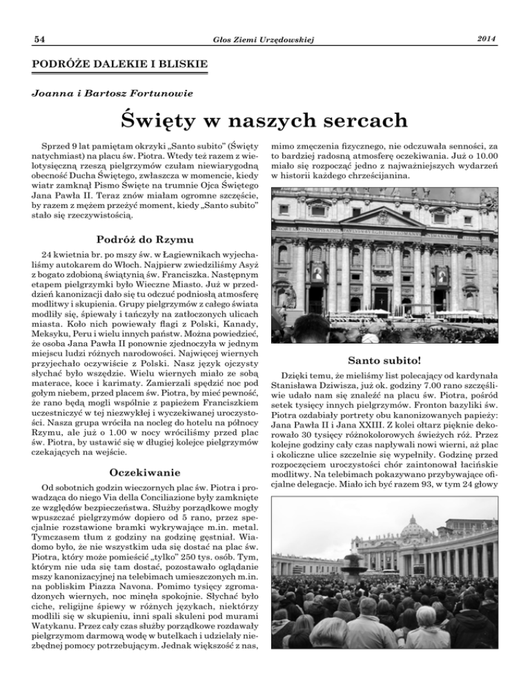 54 2014 Głos Ziemi Urzędowskiej PODRÓŻE DALEKIE I BLISKIE Joanna i Bartosz Fortunowie Święty w naszych sercach Sprzed 9 lat pamiętam okrzyki „Santo subito” (Święty natychmiast) na placu św. Piotra. Wtedy też razem z wielotysięczną rzeszą pielgrzymów czułam niewiarygodną obecność Ducha Świętego, zwłaszcza w momencie, kiedy wiatr zamknął Pismo Święte na trumnie Ojca Świętego Jana Pawła II. Teraz znów miałam ogromne szczęście, by razem z mężem przeżyć moment, kiedy „Santo subito” stało się rzeczywistością. mimo zmęczenia fizycznego, nie odczuwała senności, za to bardziej radosną atmosferę oczekiwania. Już o 10.00 miało się rozpocząć jedno z najważniejszych wydarzeń w historii każdego chrześcijanina. Podróż do Rzymu 24 kwietnia br. po mszy św. w Łagiewnikach wyjechaliśmy autokarem do Włoch. Najpierw zwiedziliśmy Asyż z bogato zdobioną świątynią św. Franciszka. Następnym etapem pielgrzymki było Wieczne Miasto. Już w przeddzień kanonizacji dało się tu odczuć podniosłą atmosferę modlitwy i skupienia. Grupy pielgrzymów z całego świata modliły się, śpiewały i tańczyły na zatłoczonych ulicach miasta. Koło nich powiewały flagi z Polski, Kanady, Meksyku, Peru i wielu innych państw. Można powiedzieć, że osoba Jana Pawła II ponownie zjednoczyła w jednym miejscu ludzi różnych narodowości. Najwięcej wiernych przyjechało oczywiście z Polski. Nasz język ojczysty słychać było wszędzie. Wielu wiernych miało ze sobą materace, koce i karimaty. Zamierzali spędzić noc pod gołym niebem, przed placem św. Piotra, by mieć pewność, że rano będą mogli wspólnie z papieżem Franciszkiem uczestniczyć w tej niezwykłej i wyczekiwanej uroczystości. Nasza grupa wróciła na nocleg do hotelu na północy Rzymu, ale już o 1.00 w nocy wróciliśmy przed plac św. Piotra, by ustawić się w długiej kolejce pielgrzymów czekających na wejście. Oczekiwanie Od sobotnich godzin wieczornych plac św. Piotra i prowadząca do niego Via della Conciliazione były zamknięte ze względów bezpieczeństwa. Służby porządkowe mogły wpuszczać pielgrzymów dopiero od 5 rano, przez specjalnie rozstawione bramki wykrywające m.in. metal. Tymczasem tłum z godziny na godzinę gęstniał. Wiadomo było, że nie wszystkim uda się dostać na plac św. Piotra, który może pomieścić „tylko” 250 tys. osób. Tym, którym nie uda się tam dostać, pozostawało oglądanie mszy kanonizacyjnej na telebimach umieszczonych m.in. na pobliskim Piazza Navona. Pomimo tysięcy zgromadzonych wiernych, noc minęła spokojnie. Słychać było ciche, religijne śpiewy w różnych językach, niektórzy modlili się w skupieniu, inni spali skuleni pod murami Watykanu. Przez cały czas służby porządkowe rozdawały pielgrzymom darmową wodę w butelkach i udzielały niezbędnej pomocy potrzebującym. Jednak większość z nas, Santo subito! Dzięki temu, że mieliśmy list polecający od kardynała Stanisława Dziwisza, już ok. godziny 7.00 rano szczęśliwie udało nam się znaleźć na placu św. Piotra, pośród setek tysięcy innych pielgrzymów. Fronton bazyliki św. Piotra ozdabiały portrety obu kanonizowanych papieży: Jana Pawła II i Jana XXIII. Z kolei ołtarz pięknie dekorowało 30 tysięcy różnokolorowych świeżych róż. Przez kolejne godziny cały czas napływali nowi wierni, aż plac i okoliczne ulice szczelnie się wypełniły. Godzinę przed rozpoczęciem uroczystości chór zaintonował łacińskie modlitwy. Na telebimach pokazywano przybywające oficjalne delegacje. Miało ich być razem 93, w tym 24 głowy 2014 55 Głos Ziemi Urzędowskiej państw. Nie zabrakło oczywiście przedstawicieli rządu polskiego, w tym prezydenta Bronisława Komorowskiego. Kiedy w bramie bazyliki pojawił się emerytowany papież Benedykt XVI, na placu rozległy się gromkie brawa. Mszę św. rozpoczęło modlitewne przygotowanie: Koronka do Miłosierdzia Bożego oraz Litania do Wszystkich Świętych. Razem z ojcem św. Franciszkiem mszę koncelebrowało ponad 100 kardynałów i około tysiąca biskupów. O wpisanie Jana Pawła II i Jana XXIII w poczet świętych poprosili papieża Franciszka: prefekt Kongregacji Spraw Kanonizacyjnych kard. Angelo Amato oraz postulatorzy procesów: ojciec Giovangiuseppe Califano i ksiądz Sławomir Oder. Dzięki temu, że transmisji z mszy św. można było słuchać również po polsku na falach Radia Watykan, wszystko rozumieliśmy i mogliśmy w pełni w niej uczestniczyć. Papież rodziny W homilii ojciec św. Franciszek podkreślił, że „w posłudze ludowi bożemu Jan Paweł II był papieżem rodziny”. Wspomniał, że początkowo Włosi mówili o Nim „papież Polak”, jednak z czasem zaczęli Go nazywać „swoim papieżem”. Zaznaczył też, że obaj nowi święci otrzymali w darze od Jezusa nadzieję i radość. Współpracowali z Duchem Świętym, aby odnowić i dostosować Kościół do jego pierwotnego obrazu. „To właśnie święci prowadzą Kościół naprzód i sprawiają, że się rozwija” – dodał. Na zakończenie aktu kanonizacji, kardynał Amato podziękował papieżowi Franciszkowi za wpisanie Jana XXIII i Jana Pawła II w poczet świętych. Wzbudziło to długie i gromkie brawa. Wszyscy wiedzieliśmy, że uczestniczymy w wydarzeniu epokowym, być może nawet na skalę stulecia. Na pewno pozostanie ono przez nas zapamiętane na zawsze i będą je wspominać także następne pokolenia. Tym bardziej jesteśmy wdzięczni i szczęśliwi, że mieliśmy okazję osobiście brać udział w tej podniosłej uroczystości. * Przez wiele lat my, Polacy, żyliśmy wyjątkowym pontyfikatem Jana Pawła II. Czerpaliśmy z Jego nauk, miłości do Boga i bliźnich, przeżywaliśmy Jego pielgrzymki po całym świecie i obserwowaliśmy, jak zjednuje sobie ludzi różnych wyznań i narodowości. Dnia 2 kwietnia 2005 roku o godzinie 21:37 zjednoczyliśmy się w żałobie i poc