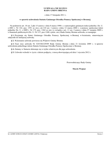 UCHWAŁA NR XI/129/11 RADY GMINY BRENNA z dnia 17 listopada 2011 r. w sprawie uchwalenia Statutu Gminnego Ośrodka Pomocy Społecznej w Brennej. Na podstawie art. 18 ust. 2 pkt 15 ustawy z dnia 8 marca 1990 r. o samorządzie gminnym (tekst jednolity: Dz. U. z 2001 r. Nr 142, poz. 1591 ze zm.), art.110 ust. 1 ustawy z dnia 12 marca 2004 r. o pomocy społecznej (tekst jednolity Dz. U. z 2009 r. Nr 175, poz. 1362 ze zm.) w związku z art. 11 ust. 2 ustawy z dnia 27 sierpnia 2009 r. o finansach publicznych (Dz. U. Nr 157, poz.1240 z późn. zm.) Rada Gminy Brenna uchwala, co następuje: § 1. Przyjmuje się Statut Gminnego Ośrodka Pomocy Społecznej w Brennej w brzmieniu, stanowiącym załącznik do niniejszej uchwały. § 2. Wykonanie uchwały powierza się Wójtowi Gminy Brenna. § 3. Traci moc uchwała Nr XXVIII/229/09 Rady Gminy Brenna z dnia 21 kwietnia 2009 r. w sprawie uchwalenia jednolitego tekstu Statutu Gminnego Ośrodka Pomocy Społecznej w Brennej. § 4. Zmiany w Statucie dokonuje się w trybie właściwym dla jego uchwalenia. § 5. Uchwała wchodzi w życie z dniem podjęcia, z mocą obowiązującą od dnia 1 stycznia 2012 r. Przewodniczący Rady Gminy Marek Wojnar Id: AJORPXFBUDUHSZTOOSRFLHFNG. Podpisany Strona 1 Załącznik do Uchwały Nr XI/129/11 Rady Gminy Brenna z dnia 17 listopada 2011 r. STATUT GMINNEGO OŚRODKA POMOCY SPOŁECZNEJ W BRENNEJ Rozdział 1. Postanowienia ogólne § 1. 1. Gminny Ośrodek Pomocy Społecznej w Brennej zwany dalej GOPS jest budżetową jednostką organizacyjną gminy Brenna. 2. Siedzibą GOPS jest Urząd Gminy Brenna, ul. Wyzwolenia 77. Wypożyczalnia sprzętu rehabilitacyjno – ortopedycznego zlokalizowana jest w Brennej, przy ul. Leśnica 8. Statut wypożyczalni określony jest w Regulaminie wypożyczalni i Regulaminie organizacyjnym GOPS. 3. Obszarem działania GOPS jest teren gminy Brenna. 4. GOPS używa pieczęci okrągłej z Godłem Państwa pośrodku i nazwą GOPS w otoku oraz pieczęci podłużnej z nazwą i określeniem siedziby. Pieczęć podłużna GOPS może dodatkowo zawierać dane dotyczące numeru telefonu, numeru REGON i NIP. § 2. 1. GOPS działa w szczególności na podstawie: 1) ustawy z dnia 12 marca 2004 r. o pomocy społecznej (Dz. U. z 2009 r., Nr 175, poz. 1362 ze zm.), 2) ustawy z dnia 28 listopada 2003 r. o świadczeniach rodzinnych (Dz. U. z 2006, Nr 139. poz. 992 ze zm.), 3) ustawy z dnia 29 lipca 2005 r. o przeciwdziałaniu przemocy w rodzinie (Dz. U. z 2005 r., Nr 180, poz. 1493 ze zm.), 4) ustawy z dnia 9 czerwca 2011 r. o wspieraniu rodziny i systemie pieczy zastępczej (tekst jednolity: Dz. U. z 2011 r., Nr 149, poz. 887 ze zm.), 5) ustawy z dnia 27 sierpnia 2009 r. o finansach publicznych (Dz. U. z 2009 r., Nr 157, poz. 1240 ze zm.), 6) innych właściwych aktów prawnych. Rozdział 2. Zakres działania Gminnego Ośrodka Pomocy Społecznej § 1. 1. Celem działania GOPS jest rozpoznawanie i zaspakajanie niezbędnych potrzeb życiowych osób i rodzin, które własnym staraniem nie są w stanie pokonać trudności życiowych oraz umożliwienie im bytowania w warunkach odpowiadających godności człowieka. 2. GOPS powinien w miarę możliwości doprowadzić do życiowego usamodzielniania się osób i rodzin, o których mowa w ust. 1 oraz ich integracji ze środowiskiem, jak również zapobiegać powstawaniu nowych problemów społecznych rodzących zapotrzebowanie na świadczenia pomocy społecznej ze strony tychże osób i rodzin. § 2. 1. GOPS realizuje zadania własne gminy Brenna obejmujące w szczególności: 1) przyznawanie i wypłacanie zasiłków celowych i celowych specjalnych, 2) przyznawanie i wypłacanie zasiłków okresowych, 3) przyznawanie i wypłacanie zasiłków stałych, 4) przyznawanie pomocy w naturze, 5) przyznawanie i wypłacanie zasiłków na ekonomiczne usamodzielnienie się, 6) udzielanie schronienia, posiłku, niezbędnego ubrania osobom tego pozbawionym, w tym bezdomnym, ofiarom przemocy, Id: AJORPXFBUDUHSZTOOSRFLHFNG. Podpisany Strona 1 7) świadczenie usług opiekuńczych, w tym specjalistycznych, w miejscu zamieszkania, z wyłączeniem specjalistycznych usług opiekuńczych w miejscu zamieszkania dla osób z zaburzeniami psychicznymi, 8) udzielanie zasiłków celowych na świadczenia zdrowotne osobom bezdomnym i innym nie mającym dochodu oraz możliwości uzyskania świadczeń na podstawie przepisów o świadczeniach opieki zdrowotnej finansowanych ze środków publicznych, 9) udzielanie zasiłków celowych na pokrycie wydatków powstałych w wyniku zdarzenia losowego, 10) sprawianie pogrzebów dla osób bezdomnych i samotnych, 11) pracę socjalną zmierzającą do wzmacniania lub przywrócenia potrzebującym osobom i rodzinom możliwości samodzielnego funkcjonowania w społeczeństwie, 12) opłacanie składek na ubezpieczenie emerytalne i rentowe za osobę, która rezygnuje z zatrudnienia w związku z koniecznością sprawowania bezpośredniej, osobistej opieki nad długotrwale lub ciężko chorym członkiem rodziny oraz wspólnie niezamieszkującymi z matką, ojcem lub rodzeństwem, 13) udział w tworzeniu gminnego systemu profilaktyki i opieki nad dzieckiem i rodziną, 14) diagnozę problemów społecznych na terenie obszaru swojego działania oraz sporządzanie bilansu lokalnych potrzeb społecznych, 15) dożywianie dzieci, 16) sporządzanie sprawozdawczości z zakresu przedmiotu działalności GOPS, 17) współpracę z Powiatowym Urzędem Pracy w zakresie upowszechniania ofert pracy oraz informacji o wolnych miejscach pracy, upowszechniania informacji o usługach poradnictwa zawodowego i szkoleniach, 18) przydzielanie asystenta rodziny, która przeżywa trudności w wypełnianiu funkcji opiekuńczo wychowawczych, 19) ustanawianie rodziny wspierającej dla rodziny przeżywającej trudności w wypełnianiu funkcji opiekuńczo wychowawczych, 20) kierowanie do prac społecznie użytecznych i robót publicznych, 21) współpracę z właściwymi organami administracji publicznej (r