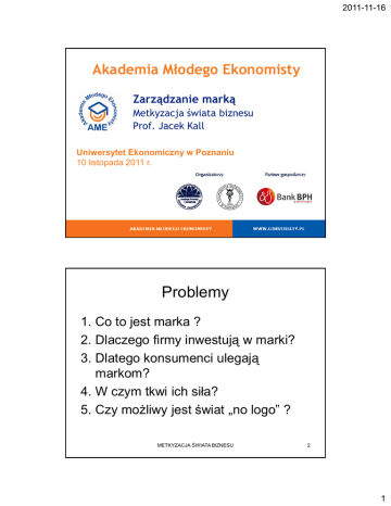 2011-11-16 Akademia Młodego Ekonomisty Zarządzanie marką Metkyzacja świata biznesu Prof. Jacek Kall Uniwersytet Ekonomiczny w Poznaniu 10 listopada 2011 r. Problemy 1. Co to jest marka ? 2. Dlaczego firmy inwestują w marki? 3. Dlatego konsumenci ulegają markom? 4. W czym tkwi ich siła? 5. Czy możliwy jest świat „no logo” ? METKYZACJA ŚWIATA BIZNESU 2 1 2011-11-16 Książkowa definicja marki • ‘nazwa, termin, znak, symbol, rysunek lub kombinacja tych elementów stworzona, bądź opracowana w celu oznaczenia produktu (lub usługi) oraz jego odróżnienia od oferty konkurentów’ METKYZACJA ŚWIATA BIZNESU 3 Czym jest marka ? 1. Marka istnieje WYŁĄCZNIE w głowie i w sercu nabywcy 2. Marka (poprzez jej znajomośd i emocje, jakie wywołuje) wpływa na odbiór produktu/usługi METKYZACJA ŚWIATA BIZNESU 4 2 2011-11-16 Dlaczego firmy inwestują w marki MOTYWY EKONOMICZNE • Wyższa sprzedaż dziś • Wyższe zyski • Wyższa sprzedaż jutro • Marki mają swoją wartość (najcenniejsze ponad 100 mld USD) MOTYWY STRATEGICZNE • Utrudnienie życia konkurentom (także potencjalnym) • Wykorzystanie silnej marki dla znakowania nowych produktów • Korzyści z globalnej skali działania METKYZACJA ŚWIATA BIZNESU 5 Dlaczego konsumenci ulegają markom ? 1. Łatwiejsze kupowanie 2. Pewniejszy zakup (redukowanie ryzyka) 3. Wyjątkowe wrażenia z konsumpcji (efekt placebo) 4. Marki coś o nas „mówią” METKYZACJA ŚWIATA BIZNESU 6 3 2011-11-16 Holistyczna percepcja Ogólne wrażenie, a nie ważenie zalet i wad Odrzucenie nielubianego Symboliczne znaczenie konsumpcji Kreowani e własnej tożsamości Niewerbalne wyobrażenia „Nie wiemy do końca co lubimy” „Obrazy” a nie „słowa” Nieracjonalne preferencje Konstruowanie świata społecznego Auto-iluzja Konsumpcja to szukanie przyjemności: mniej trzeźwej racjonalności = METKYZACJA ŚWIATA BIZNESU większa frajda Auto-koncentracja Nie „jakie to jest”, ale „jak się z tym czuję/wyglądam…” 7 Skąd się bierze siła marek Odmienno ść Znaczenie Bliskość Renoma METKYZACJA ŚWIATA BIZNESU 8 4 2011-11-16 Czy możliwy jest świat „no logo” ? TAK, jeśli sami tak wybierzemy … METKYZACJA ŚWIATA BIZNESU 9 Poradnik nastoletniego nabywcy 1. Fajnie jeśli coś pozytywnego o Tobie mówią nie tylko marki, które posiadasz 2. Nie kupuj czegoś tylko dlatego, że mają to inni 3. Nie zakładaj, że droższe musi być zawsze lepsze 4. Pamiętaj, że w reklamie nie mówi się całej prawdy METKYZACJA ŚWIATA BIZNESU 10 5 2011-11-16 A teraz zadanie… Wymyśl markę szkoły gimnazjalnej, w której chciałbyś się uczyć: • Wyróżniki ? • Czy te wybrane są na pewno ważne ? • Jak budować renomę szkoły ? • Kiedy taka marka stanie się Wam „bliska” METKYZACJA ŚWIATA BIZNESU ?11 6