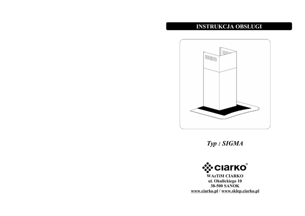 INSTRUKCJA OBSŁUGI NSTRUKCJA OBSŁUGI Typ : SIGMA WAzTiM CIARKO ul. Okulickiego 10 38-500 SANOK www.ciarko.pl / www.sklep.ciarko.pl SPIS TREŚCI I Charakterystyka.................................................................................. ....3 II Wyposażenie...........................................................................................3 III Dane techniczne......... ...................................................................... ....4 IV Warunki eksploatacji......................................................................... ....4 V Montaż................................................................................................ ....5 1. Montaż wieszaka ściennego.........................................................5 2. Montaż obudowy okapu...............................................................6 3. Podłączenie do sieci elektrycznej i kontrola działania............ ....6 4. Ustawienie trybu pracy okapu nadkuchennego......... ..................6 4.1. Ustawienie wyciągowego trybu pracy okapu...... ..................6 4.2. Ustawienie trybu pracy okapu jako pochłaniacz zapachów...7 5. Montaż teleskopowej kolumny komina................................... ....7 VI Obsługa i konserwacja...................................................................... ....7 1. Bezpieczeństwo użytkowania.................................................. ....7 2.Obsługa..................................................................................... ....8 2.1. Panel sterowania................................................................ ....8 2.2. Funkcja programu.............................................................. ....9 3. Konserwacja............................................................................... ....9 3.1. Metalowe filtry przeciwtłuszczowe................................... ....9 3.2. Filtr węglowy..................................................................... ..10 3.3. Oświetlenie...........................................................................10 3.4. Czyszczenie........................................................................ ..11 VII Karta gwarancyjna........................................................................... ..12 VII Karta gwarancyjna: ..................................................... data sprzedaży ……………………………………. pieczęć i podpis sprzedawcy Adnotacje Zakładu Usługowego Nr zlecenia Data zgłoszenia Data naprawy Zakres naprawy Gwarancję przedłużono o dni Podpis serwisanta Szanowni Państwo Staliście się Państwo użytkownikami najnowszej generacji okapu kuchennego typu "Sigma". Okap ten został zaprojektowany i wykonany specjalnie z myślą o spełnieniu Państwa oczekiwań i z pewnością będzie stanowić część nowocześnie wyposażonej kuchni. Zastosowane w nim nowoczesne rozwiązania konstrukcyjne i użycie najnowszej technologii produkcji, zapewniają mu wysoką funkcjonalność i estetykę. Przed przystąpieniem do montażu okapu prosimy o dokładne zapoznanie się z treścią niniejszej instrukcji. Dzięki temu unikną Państwo błędnej instalacji i obsługi okapu. Życzymy satysfakcji i zadowolenia z wyboru okapu naszej firmy. „CIARKO” A B C Karta gwarancyjna Karta gwarancyjna Karta gwarancyjna Nr ................................ Nr ................................ Nr ................................ ................ data .............................. pieczęć i podpis sprzedawcy ................ data .............................. pieczęć i podpis sprzedawcy 13 ................ data .............................. pieczęć i podpis sprzedawcy 2 I Charakterystyka NOTATKI: Okap nadkuchenny "SIGMA” do usuwania oparów kuchennych na zewnątrz pomieszczenia. Wymaga on zainstalowania przewodu odprowadzającego powietrze na zewnątrz. Długość przewodu (rura ø 120 ) nie powinna być większa niż 4-5 m. Po zainstalowaniu filtra z węglem aktywnym okap może pracować jako pochłaniacz zapachów. W tym przypadku nie wymaga się instalowania przewodu odprowadzającego powietrze na zewnątrz. Okap nadkuchenny jest urządzeniem elektrycznym wykonanym w II klasie ochrony przeciwporażeniowej z zamocowanym na stałe sznurem przyłączeniowym i wtyczką ze stykiem ochronnym. Ponadto posiada niezależne oświetlenie oraz wentylator wyciągowy z możliwością ustawienia jednej z trzech prędkości obrotowych. Okap jest przeznaczony do trwałego zamocowania na pionowej ścianie ponad kuchenką gazową lub elektryczną; II Wyposażenie Okap jest złożony z następujących elementów (rys. 1 ): 1 ) szyby C 2) komina teleskopowego złożonego z: a) 1 komina górnego A , b) 1 komina dolnego B wyposażonego w światła i zespół wentylatora, 3) wieszaka ściennego D 3 12 3.4. Czyszczenie. Podczas normalnego czyszczenia okapu: • Nie należy używać namoczonych szmatek lub gąbek ani strumienia wody. • Nie należy stosować rozpuszczalników ani alkoholu ponieważ mogą one zmatowić lakierowane powierzchnie. • Nie należy stosować substancji żrących, zwłaszcza do czyszczenia powierzchni wykonanych ze stali nierdzewnej. Zaleca się stosowanie wilgotnej szmatki oraz obojętnych środków czyszczących. III Dane techniczne Cechy charakterystyczne Napięcie zasilania Silnik wentylatora Oświetlenie Ilość filtrów tłuszczowych Stopnie prędkości Szerokość [cm] Głębokość [cm] Wysokość [cm] Wylot [ø mm] Wydajność [m 3 /h] Pobór mocy [W] Głośność [dBA] Rodzaj pracy Kolor Typ okapu Sigma AC 230V 50Hz 1 Halogeny 2x20W 1 3 60 50 485– 915 150 do 500 150 max. 56 wyciąg, pochłaniacz stal nierdzewna IV Warunki eksploatacji 11 1. Okap do usuwania oparów kuchennych na zewnątrz należy podłączyć do odpowiedniego kanału wentylacyjnego (nie podłączać do kanałów kominowych , dymowych lub spalinowych, będących w eksploatacji). 2. Bezpieczna odległość pomiędzy płytą kuchenną a okapem kuchen