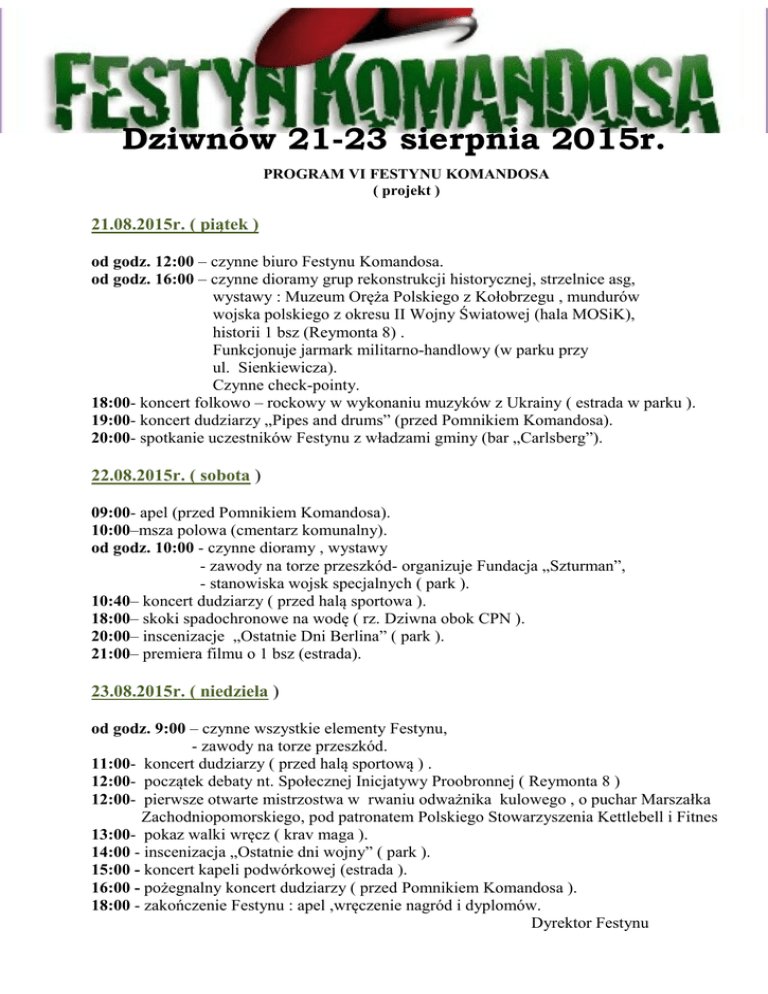 Dziwnów 21-23 sierpnia 2015r. PROGRAM VI FESTYNU KOMANDOSA ( projekt ) 21.08.2015r. ( piątek ) od godz. 12:00 – czynne biuro Festynu Komandosa. od godz. 16:00 – czynne dioramy grup rekonstrukcji historycznej, strzelnice asg, wystawy : Muzeum Oręża Polskiego z Kołobrzegu , mundurów wojska polskiego z okresu II Wojny Światowej (hala MOSiK), historii 1 bsz (Reymonta 8) . Funkcjonuje jarmark militarno-handlowy (w parku przy ul. Sienkiewicza). Czynne check-pointy. 18:00- koncert folkowo – rockowy w wykonaniu muzyków z Ukrainy ( estrada w parku ). 19:00- koncert dudziarzy „Pipes and drums” (przed Pomnikiem Komandosa). 20:00- spotkanie uczestników Festynu z władzami gminy (bar „Carlsberg”). 22.08.2015r. ( sobota ) 09:00- apel (przed Pomnikiem Komandosa). 10:00–msza polowa (cmentarz komunalny). od godz. 10:00 - czynne dioramy , wystawy - zawody na torze przeszkód- organizuje Fundacja „Szturman”, - stanowiska wojsk specjalnych ( park ). 10:40– koncert dudziarzy ( przed halą sportowa ). 18:00– skoki spadochronowe na wodę ( rz. Dziwna obok CPN ). 20:00– inscenizacje „Ostatnie Dni Berlina” ( park ). 21:00– premiera filmu o 1 bsz (estrada). 23.08.2015r. ( niedziela ) od godz. 9:00 – czynne wszystkie elementy Festynu, - zawody na torze przeszkód. 11:00- koncert dudziarzy ( przed halą sportową ) . 12:00- początek debaty nt. Społecznej Inicjatywy Proobronnej ( Reymonta 8 ) 12:00- pierwsze otwarte mistrzostwa w rwaniu odważnika kulowego , o puchar Marszałka Zachodniopomorskiego, pod patronatem Polskiego Stowarzyszenia Kettlebell i Fitnes 13:00- pokaz walki wręcz ( krav maga ). 14:00 - inscenizacja „Ostatnie dni wojny” ( park ). 15:00 - koncert kapeli podwórkowej (estrada ). 16:00 - pożegnalny koncert dudziarzy ( przed Pomnikiem Komandosa ). 18:00 - zakończenie Festynu : apel ,wręczenie nagród i dyplomów. Dyrektor Festynu
