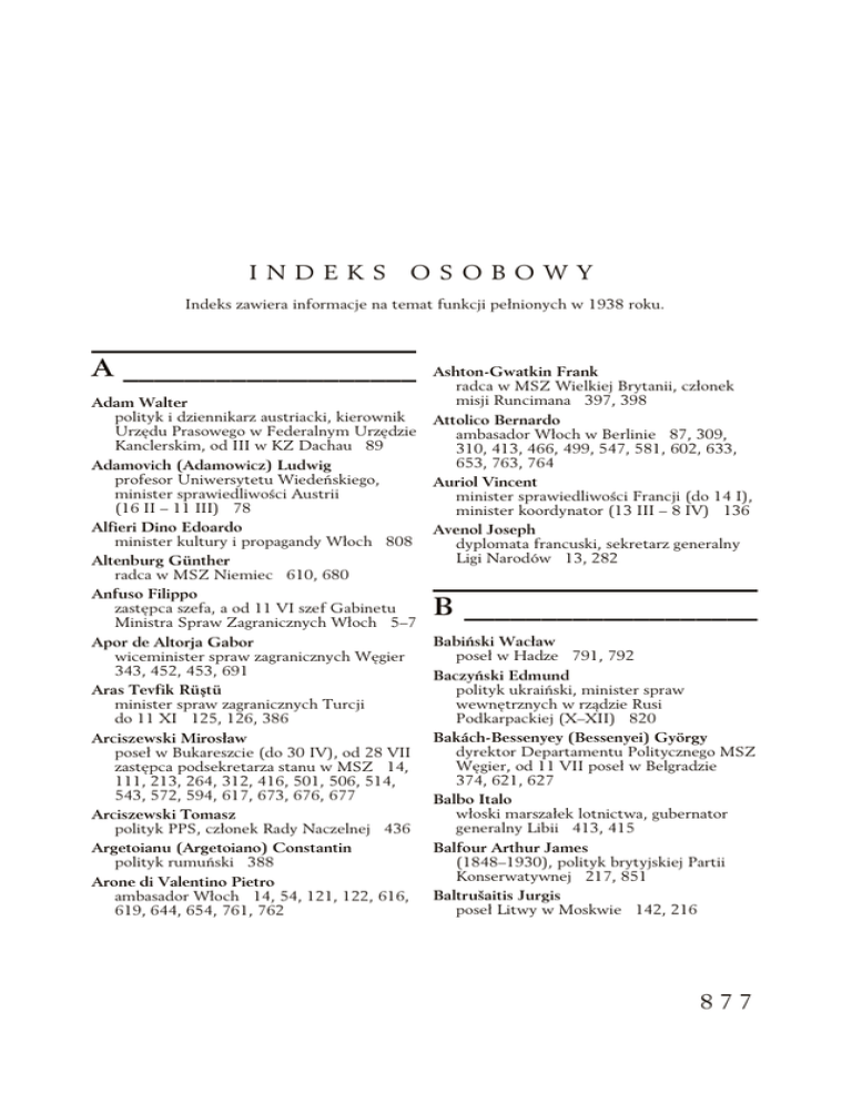 INDEKS OSOBOWY Indeks zawiera informacje na temat funkcji pełnionych w 1938 roku. A ___________________ Adam Walter polityk i dziennikarz austriacki, kierownik Urzędu Prasowego w Federalnym Urzędzie Kanclerskim, od III w KZ Dachau 89 Adamovich (Adamowicz) Ludwig profesor Uniwersytetu Wiedeńskiego, minister sprawiedliwości Austrii (16 II – 11 III) 78 Alfieri Dino Edoardo minister kultury i propagandy Włoch 808 Altenburg Günther radca w MSZ Niemiec 610, 680 Anfuso Filippo zastępca szefa, a od 11 VI szef Gabinetu Ministra Spraw Zagranicznych Włoch 5–7 Apor de Altorja Gabor wiceminister spraw zagranicznych Węgier 343, 452, 453, 691 Aras Tevfik Rüºtü minister spraw zagranicznych Turcji do 11 XI 125, 126, 386 Arciszewski Mirosław poseł w Bukareszcie (do 30 IV), od 28 VII zastępca podsekretarza stanu w MSZ 14, 111, 213, 264, 312, 416, 501, 506, 514, 543, 572, 594, 617, 673, 676, 677 Arciszewski Tomasz polityk PPS, członek Rady Naczelnej 436 Argetoianu (Argetoiano) Constantin polityk rumuński 388 Arone di Valentino Pietro ambasador Włoch 14, 54, 121, 122, 616, 619, 644, 654, 761, 762 Ashton-Gwatkin Frank radca w MSZ Wielkiej Brytanii, członek misji Runcimana 397, 398 Attolico Bernardo ambasador Włoch w Berlinie 87, 309, 310, 413, 466, 499, 547, 581, 602, 633, 653, 763, 764 Auriol Vincent minister sprawiedliwości Francji (do 14 I), minister koordynator (13 III – 8 IV) 136 Avenol Joseph dyplomata francuski, sekretarz generalny Ligi Narodów 13, 282 B ___________________ Babiński Wacław poseł w Hadze 791, 792 Baczyński Edmund polityk ukraiński, minister spraw wewnętrznych w rządzie Rusi Podkarpackiej (X–XII) 820 Bakách-Bessenyey (Bessenyei) György dyrektor Departamentu Politycznego MSZ Węgier, od 11 VII poseł w Belgradzie 374, 621, 627 Balbo Italo włoski marszałek lotnictwa, gubernator generalny Libii 413, 415 Balfour Arthur James (1848–1930), polityk brytyjskiej Partii Konserwatywnej 217, 851 Baltrušaitis Jurgis poseł Litwy w Moskwie 142, 216 877 INDEKS OSOBOWY Bałachowicz-Bułak Stanisław generał, dowódca Grupy Białoruskiej w wojnie 1920 r. 756 Banach Ignacy K. pułkownik dypl., szef Wydziału IV (Studiów) Oddziału II Sztabu Głównego 402 Barański Leon naczelny dyrektor Banku Polskiego 226 Barcza de Nagylásony György poseł Węgier w Londynie (od 1 VI) 538, 551, 559, 561, 562, 590, 591 Bárdossy László de poseł Węgier w Bukareszcie 213, 669 Barthélémy Joseph polityk francuski, profesor prawa 493 Baruch Bernard Mannes bankier amerykański 758 Bastianini Giuseppe podsekretarz stanu w MSZ Włoch 363, 516, 614, 751 Battaglia Roman radca w Komisariacie Generalnym RP w Wolnym Mieście Gdańsku 768 Beck Jadwiga żona ministra spraw zagranicznych 61, 109, 210 Beck Józef minister spraw zagranicznych passim Beneš (Benesz) Edvard prezydent Czechosłowacji do 5 X, od 22 X na emigracji 18, 96, 112, 130, 168, 169, 174, 221, 240, 250, 268, 275, 280, 308, 309, 325, 340, 344, 354, 355, 375, 379, 399, 401, 412, 415, 461–464, 467, 477, 501, 524, 542, 548, 552, 553, 565, 566, 569, 572, 573, 578, 581, 583, 585, 586, 590–592, 605, 612, 620, 629, 637, 640, 641, 644, 657, 708, 711, 781, 786, 799, 817, 853 Beran Rudolf senator, przewodniczący partii agrarnej, od 1 XII premier Czecho-Słowacji 856 Bernolák Anton (1762–1813) ksiądz, językoznawca słowacki 199 Bethlen István polityk węgierski, premier w latach 1921–1931 690, 691 Biddle Anthony J. Drexel ambasador USA 36, 54, 330–332, 346, 348, 644 878 Bismarck Otto von (1815–1898), niemiecki mąż stanu, jeden z twórców i pierwszy kanclerz II Rzeszy 181 Blomberg Eva żona Wernera 69 Blomberg Werner von feldmarszałek niemiecki, minister wojny do 4 II 59, 69, 86, 433 Blondel Jules-François chargé d’affaires Francji w Rzymie 125, 407, 439 Blücher (Bluecher) Wasilij K. marszałek ZSRR, do VIII dowódca Samodzielnej Armii Dalekiego Wschodu, aresztowany w X, stracony 9 XI 217, 331, 748 Blum Léon polityk francuski, socjalista, premier Francji 13 III – 8 IV 28, 136, 182, 183, 443, 686 Boeck Adalbert senator ds. kultury i edukacji w Wolnym Mieście Gdańsku 769 Boheman Erik Carlsson poseł Szwecji (do 27 I), następnie podsekretarz stanu w MSZ 301 Bohle Ernst Wilhelm szef Organizacji Zagranicznej NSDAP, sekretarz stanu w MSZ Niemiec 60, 66, 209 Bonnet Georges minister finansów (do 14 I), minister stanu (18 I – 10 III), minister spraw zagranicznych Francji (od 10 IV) 219, 220, 228, 232–235, 240, 247–249, 278, 281, 287, 293–300, 302–307, 323, 325, 327–330, 333–336, 347–349, 361, 367, 394, 406, 407, 409–411, 417, 423, 424, 459, 469, 470, 496, 497, 500, 512, 514, 515, 534, 539–542, 612, 671, 674–678, 838–840, 842, 843, 845, 852, 853 Boris Georges ekonomista, doradca premiera Francji 136 Borys III car Bułgarii 441 Bossy (Bossi) Raoul poseł Rumunii w Budapeszcie 60, 289 Bourguès Lucien korespondent zagraniczny francuskiego dziennika „Le Petit Parisien” 190 INDEKS OSOBOWY Brãtianu Gheorghe (Bratianu Jerzy) historyk i polityk rumuński 388, 765 Brauchitsch Walther von generał, naczelny dowódca niemieckich sił lądowych (od 5 II) 446 Briand Aristide (1862–1932), polityk francuski, socjalista, wielokrotny premier 443 Brinkmann Rudolf podsekretarz stanu w ministerstwie gospodarki Niemiec 196 Brodij Andrij premier Rusi Podkarpackiej (9–26 X) 718 Bucharin Nikołaj I. polityk i ideolog radziecki, stracony 15 III 119, 126 Bullitt William ambasador USA w Paryżu 55, 215–218, 300, 302, 303, 331, 576, 675, 678 Bülow Bernhard Wilhelm von (1885–1936), sekretarz stanu w MSZ Niemiec 65 Burckhardt (Burkhardt) Carl Jacob historyk szwajcarski, Wysoki Komisarz Ligi Narodów w Wolnym Mieście Gdańsku 13, 16, 446, 770, 772, 776, 777, 783, 784, 799, 800, 813, 831, 855 Burhardt-Bukacka Jadwiga ® Beck Jadwiga Buzek Jan Andrzej attaché poselstwa (od 1 VI ambasady) w Bukareszcie, w XI referent w Departamencie Polityczno-Ekonomicznym 458 C ___________________ Cãdere Victor d