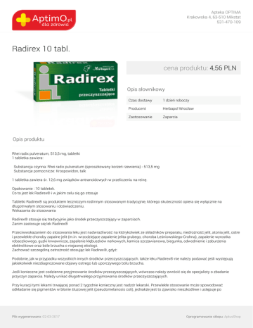 Apteka OPTIMA Krakowska 4, 63-510 Mikstat 531-470-109 Radirex 10 tabl. cena produktu: 4,56 PLN Opis słownikowy Czas dostawy 1 dzień roboczy Producent Herbapol Wrocław Zastosowanie Zaparcia Opis produktu Rhei radix pulveratum, 513,5 mg, tabletki 1 tabletka zawiera: Substancja czynna: Rhei radix pulveratum (sproszkowany korzeń rzewienia) - 513,5 mg Substancje pomocnicze: Krospowidon, talk 1 tabletka zawiera śr. 12,6 mg związków antranoidowych w przeliczeniu na reinę. Opakowanie : 10 tabletek. Co to jest lek Radirex® i w jakim celu się go stosuje Tabletki Radirex® są produktem leczniczym roślinnym stosowanym tradycyjnie, którego skuteczność opiera się wyłącznie na długotrwałym stosowaniu i doświadczeniu. Wskazania do stosowania Radirex® stosuje się tradycyjnie jako środek przeczyszczający w zaparciach. Zanim zastosuje się lek Radirex® Przeciwwskazaniem do stosowania leku jest nadwrażliwość na którykolwiek ze składników preparatu, niedrożność jelit, atonia jelit, ostre i przewlekłe choroby zapalne jelit (m.in. wrzodziejące zapalenie jelita grubego, choroba Leśniowskiego-Crohna), zapalenie wyrostka robaczkowego, guzki krwawnicze, zapalenie kłębuszków nerkowych, kamica szczawianowa, biegunka, odwodnienie i zaburzenia elektrolitowe oraz bóle brzucha o niejasnej etiologii. Zachować szczególną ostrożność stosując lek Radirex®, gdyż: Podobnie, jak w przypadku wszystkich innych środków przeczyszczających, także leku Radirex® nie należy podawać jeśli występują jakiekolwiek niezdiagnozowane objawy ostrego lub uporczywego bólu brzucha. Jeśli konieczne jest codzienne przyjmowanie środków przeczyszczających, wówczas należy zwrócić się do specjalisty o zbadanie przyczyn zaparcia. Należy unikać długotrwałego przyjmowania środków przeczyszczających. Przy kuracji tymi lekami trwającej ponad 2 tygodnie konieczny jest nadzór lekarski. Przewlekłe stosowanie może spowodować odkładanie się pigmentów w błonie śluzowej jelit (pseudomelanosis coli), jednakże jest to zjawisko nieszkodliwe i ustępuje po Plik wygenerowano: 02-03-2017 Oprogramowanie sklepu: AptusShop Apteka OPTIMA Krakowska 4, 63-510 Mikstat 531-470-109 zaprzestaniu przyjmowania leku. Nadużywanie leku Radirex® prowadzące do strat płynów i elektrolitów, może spowodować uzależnienie związane z koniecznością przyjmowania zwiększonych dawek leku w celu uzyskania efektu przeczyszczającego. Nadużywanie spowodować może zaburzenia gospodarki wodno-elektrolitowej (głównie obniżenie poziomu potasu), zaburzenia funkcjonowania okrężnicy ( zanik prawidłowego napięcia mięśni gładkich ). Obniżenie poziomu potasu może prowadzić do zaburzeń pracy serca i zaburzeń nerwowo-mięśniowych, szczególnie w przypadku jednoczesnego przyjmowania glikozydów nasercowych, diuretyków lub kortykosteroidów. Przyjmowanie przez dłuższy okres środków przeczyszczających zawierających antranoidy może spowodować nasilenie zaparć. Przewlekłe stosowanie może prowadzić do wystąpienia białkomoczu i krwiomoczu. Stosowanie stymulujących środków przeczyszczających przy przewlekłych zaparciach, nie może zastąpić konieczności zmiany diety. Należy unikać stosowania leku podczas miesiączki. Stosowanie leku Radirex® u dzieci Leku nie należy stosować u dzieci poniżej 12 roku życia. Stosowanie leku Radirex® w okresie ciąży i karmienia piersią Nie należy stosować leku w okresie ciąży i karmienia piersią. Prowadzenie pojazdów i obsługa maszyn Nie stwierdzono niekorzystnego wpływu leku na zdolność prowadzenia pojazdów mechanicznych. Stosowanie innych leków Działanie glikozydów nasercowych może ulec nasileniu w przypadku obniżenia poziomu potasu, spowodowanego nadużywaniem preparatów z rzewienia. Obniżenie poziomu potasu może wpływać na działanie równocześnie stosowanych leków antyarytmicznych i glikozydów nasercowych. Stosowane równocześnie środki moczopędne, sterydy kory nadnerczy czy korzeń lukrecji mogą zwiększyć utratę potasu. Jak stosować lek Radirex® Doustnie: dorosłym i dzieciom powyżej 12 roku życia 2 tabletki jednorazowo, najlepiej przed snem. W razie potrzeby dawkowanie można zwiększyć do 3 tabletek dziennie. Działanie przeczyszczające następuje po 6-8 godzinach. Najodpowiedniejszą dawką indywidualną jest najmniejsza dawka potrzebna do uzyskania miękkiego stolca. W przypadku zażycia większej dawki leku Radirex® niż zalecana Przedawkowanie leku może spowodować gwałtowną biegunkę, prowadzącą do zaburzeń gospodarki wodno-elektrolitowej, z typowymi następstwami jak m.in. zaburzenia rytmu serca, osłabienie mięśniowe. Przy przedawkowaniu należy doprowadzić do zbilansowania płynów i elektrolitów w ustroju. Możliwe działania niepożądane Zwykle nie obserwuje się działań niepożądanych. Rzadko mogą wystąpić reakcje nadwrażliwości na składniki preparatu, biegunka, obniżenie poziomu potasu (hipokaliemia), skurcze oraz bóle brzucha, szczególnie u pacjentów z zespołem jelita drażliwego. Żółte lub czerwono-brązowe (w zależności od pH) zabarwienie moczu wywołane przez metabolity leku jest nieistotne klinicznie i ustępuje po zaprzestaniu stosowania leku. Przechowywanie leku Radirex® Przechowywać w temperaturze nie wyższej niż 25°C. Lek należy przechowywać w miejscu niedostępnym i niewidocznym dla dzieci. Nie należy stosować leku po upływie terminu ważności podanym na opakowaniu. Plik wygenerowano: 02-03-2017 Powered by TCPDF (www.tcpdf.org) Oprogramowanie sklepu: AptusShop