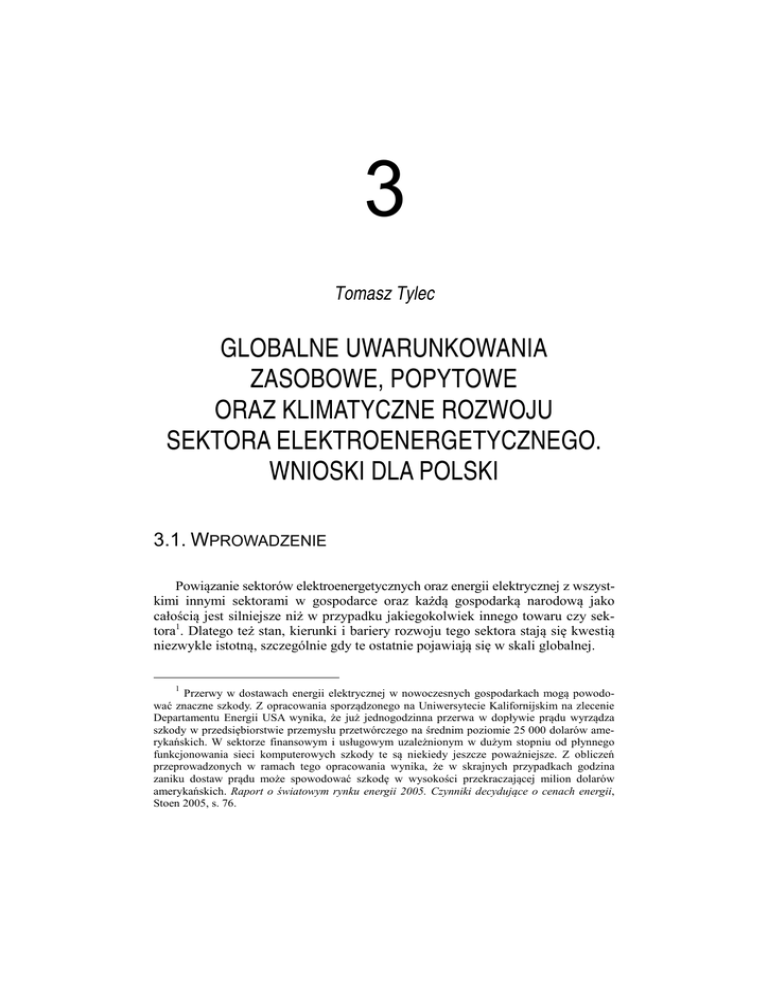 3 Tomasz Tylec GLOBALNE UWARUNKOWANIA ZASOBOWE, POPYTOWE ORAZ KLIMATYCZNE ROZWOJU SEKTORA ELEKTROENERGETYCZNEGO. WNIOSKI DLA POLSKI 3.1. WPROWADZENIE Powiązanie sektorów elektroenergetycznych oraz energii elektrycznej z wszystkimi innymi sektorami w gospodarce oraz każdą gospodarką narodową jako całością jest silniejsze niż w przypadku jakiegokolwiek innego towaru czy sektora1. Dlatego też stan, kierunki i bariery rozwoju tego sektora stają się kwestią niezwykle istotną, szczególnie gdy te ostatnie pojawiają się w skali globalnej. 1 Przerwy w dostawach energii elektrycznej w nowoczesnych gospodarkach mogą powodować znaczne szkody. Z opracowania sporządzonego na Uniwersytecie Kalifornijskim na zlecenie Departamentu Energii USA wynika, że już jednogodzinna przerwa w dopływie prądu wyrządza szkody w przedsiębiorstwie przemysłu przetwórczego na średnim poziomie 25 000 dolarów amerykańskich. W sektorze finansowym i usługowym uzależnionym w dużym stopniu od płynnego funkcjonowania sieci komputerowych szkody te są niekiedy jeszcze poważniejsze. Z obliczeń przeprowadzonych w ramach tego opracowania wynika, że w skrajnych przypadkach godzina zaniku dostaw prądu może spowodować szkodę w wysokości przekraczającej milion dolarów amerykańskich. Raport o światowym rynku energii 2005. Czynniki decydujące o cenach energii, Stoen 2005, s. 76. 53 Z powodu znacznej inercji sektorów elektroenergetycznych powodowanej dużym rozmiarem jednostek, długim okresem ich użytkowania, koniecznością ponoszenia znacznych nakładów inwestycyjnych na ich powstanie, a także przyznania im statusu monopoli naturalnych, przez długi czas sektory te nie poddawały się zmianom. Dopiero szoki paliwowe lat 70. XX w. przyczyniły się znacznie do zmiany w sposobach funkcjonowania i organizacji sektorów elektroenergetycznych. Zapoczątkowany został proces oszczędzania i podnoszenia efektywności w zakresie funkcjonowania tych sektorów. Już od lat 80. XX w. rozpoczął się niezwykle szybki proces zmian w zarządzaniu tym sektorem, zmian właścicielskich oraz w sposobie sprawowania kontroli i nadzoru tego sektora przez organy publiczne2. Zmiany te zostały wzmocnione przez trzy czynniki: powszechną akceptację dla rozwiązań rynkowych powstałą na gruncie antyetatystycznej krytyki oddziaływania państwa na procesy gospodarcze, szybkie i niespotykane wcześniej zmiany technologiczne w zakresie technologii wytwórczych oraz systemów komunikacyjnych i informatycznych, a także rosnące zagrożenia i obawy dotyczące środowiska naturalnego, co z kolei skutkowało poszukiwaniem rozwiązań najbardziej efektywnych pod względem produkcji, dystrybucji i wykorzystania energii elektrycznej. Proces liberalizacji3 ukierunkowany został na wykorzystanie mechanizmów rynkowych oraz własności prywatnej (w tym wdrożenie mechanizmów analizy 2 Jako miejsce rozpoczęcia światowych przemian w sektorach elektroenergetycznych wskazuje się Chile. Reformy po raz pierwszy zostały podjęte na podstawie ustawy energetycznej w 1982 r. Szerzej zob.: M. Pollitt, Electricity Reform in Chile. Lessons for Developing Countries, University of Cambridge, CMI Working Paper 51, 2005. Ogólny paradygmat, w oparciu o który sektory elektroenergetyczne ewoluują na całym świecie, jest podobny we wszystkich krajach. Różnice sprowadzić można do tempa i zaawansowania reform oraz rozwiązań szczegółowych, co determinowane jest przez szereg czynników lokalnych. 3 Zgodnie z opracowaniem Agencji Energii Atomowej (Nuclear Energy Agency – NEA), Międzynarodowej Agencji Energetycznej (International Enemy Agency – IEA) oraz Organizacji ds. Ekonomicznej Współpracy i Rozwoju (Organisation for Economic Co-operation and Development – OECD) pod pojęciem liberalizacji sektora elektroenergetycznego rozumie się ogół reform w zakresie funkcjonowania sektora, realizowanych jednocześnie lub niezależnie od siebie. Zalicza się do nich: – korporatyzację (lub komercjalizację) – proces przekształcania przedsiębiorstw państwowych w sektorze elektroenergetycznym w przedsiębiorstwa organizacyjnie i operacyjnie ukierunkowane na działalność w warunkach rynkowych, – prywatyzację – przekazanie lub sprzedaż aktywów przedsiębiorstw elektroenergetycznych z przedsiębiorstw państwowych do przedsiębiorstw prywatnych, – deregulację – ograniczenie bezpośredniej kontroli lub nadzoru administracyjnego przez aparat państwa nad funkcjonowaniem przedsiębiorstw elektroenergetycznych, – wprowadzenie konkurencji – zapewnienie swobody wyboru producenta energii elektrycznej przez przedsiębiorstwa dostarczające energię elektryczną (konkurencja na poziomie hurtowym) lub zapewnienie swobody wyboru dostawcy energii elektrycznej odbiorcom końcowym (konkurencja na poziomie detalicznym). Projected Costs of Generating Electricity. 1998 Update, NEA/IEA/OECD 1998, s. 201–202. 54 i zarządzania ryzykiem umożliwiających jego internalizację w warunkach rynkowych), co wymusiłoby tworzenie bodźców dla pojawienia się efektywności rynkowej. Nowe kierunki polityki gospodarczej polegające na wprowadzaniu mechanizmów konkurencji do sektora miały przyczynić się do poprawy efektywności jego funkcjonowania4 (w zakresie efektywności alokacyjnej, produkcyjnej, dynamicznej), urealnienia cen (traktowanie energii jako towaru wymagającego optymalnej alokacji), z jednoczesnym zachowaniem bezpieczeństwa dostaw (w okresie krótkim i długim), a tym samym właściwego poziomu inwestycji5. Pojawieniu się globalnego trendu ukierunkowanego na liberalizację i prywatyzację sektorów elektroenergetycznych towarzyszyła rosnąca świadomość zagrożeń wynikających z degradacji środowiska naturalnego, a także związanej z tym konieczności poszukiwania sposobów ich ograniczania. Obawy o stan środowiska naturalnego wpłynęły z kolei na powstanie bardziej efektywnych technologii produkcji ener