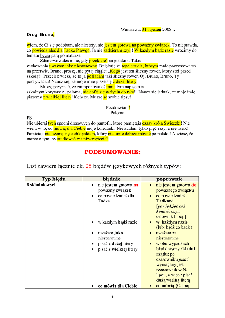 PODSUMOWANIE: List zawiera łącznie ok. 25 błędów językowych