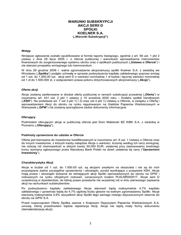 WARUNKI SUBSKRYPCJI AKCJI SERII D SPÓŁKI KOELNER S.A. („Warunki Subskrypcji”) Wstęp Niniejsze ogłoszenie zostało opublikowane w formie raportu bieŜącego, zgodnie z art. 56 ust. 1 pkt 2 ustawy z dnia 29 lipca 2005 r. o ofercie publicznej i warunkach wprowadzania instrumentów finansowych do zorganizowanego systemu obrotu oraz o spółkach publicznych („Ustawa o Ofercie”) i nie stanowi prospektu emisyjnego lub memorandum. W dniu 29 grudnia 2006 r. walne zgromadzenie akcjonariuszy spółki Koelner S.A. z siedzibą we Wrocławiu („Spółka”) podjęło uchwałę w sprawie podwyŜszenia kapitału zakładowego poprzez emisję od 1 szt. do 1.500.00 szt. akcji serii D o wartości nominalnej 1 zł kaŜda i łącznej wartości nominalnej od 1 zł do 1.500.000 zł, z wyłączeniem prawa poboru dotychczasowych akcjonariuszy („Akcje”). Oferta akcji Akcje zostaną zaoferowane w drodze oferty publicznej w ramach subskrypcji prywatnej („Oferta”) w rozumieniu art. 431 ust. 2 pkt 1 ustawy z 15 września 2000 roku – Kodeks spółek handlowych („KSH"). Na podstawie art. 7 ust 3 pkt 1) i 2) oraz ust 4 pkt 1) Ustawy o Ofercie, w związku z Ofertą i wprowadzeniem Akcji do obrotu na rynku regulowanym na Giełdzie Papierów Wartościowych w Warszawie („GPW”) nie zostaną sporządzone Ŝadne dokumenty informacyjne. Oferujący Podmiotem oferującym akcje w publicznej ofercie jest Dom Maklerski BZ WBK S.A. z siedzibą w Poznaniu („Oferujący”). Podmioty uprawnione do udziału w Ofercie Oferta jest kierowana do inwestorów kwalifikowanych w rozumieniu art. 8 ust. 1 Ustawy o Ofercie oraz do innych inwestorów, z których kaŜdy nabędzie Akcje o wartości, liczonej według ich ceny emisyjnej, nie niŜszej niŜ równowartość w złotych kwoty 50.000 EUR, ustalonej przy zastosowaniu średniego kursu wymiany ogłoszonego przez Narodowy Bank Polski na dzień ustalenia tej ceny (“Uprawnieni Inwestorzy”). Charakterystyka Akcji Akcje w liczbie od 1 szt. do 1.500.00 szt. są akcjami zwykłymi na okaziciela i nie są do nich przywiązane Ŝadne szczególne uprawnienia i obowiązki, ponad wynikające z przepisów KSH. Akcje mają prawa i obowiązki toŜsame do istniejących akcji Spółki wprowadzonych do obrotu na GPW i notowanych na rynku oficjalnych notowań, oznaczonych kodem PLKLNR000017. Akcje serii D uczestniczą w dywidendzie, do której prawo powstanie nie wcześniej niŜ w dniu pierwszego zapisania akcji na rachunkach subskrybentów. Po podwyŜszeniu kapitału zakładowego Akcje stanowić będą maksymalnie 4,7% kapitału zakładowego i uprawniać będą do 4,7% ogólnej liczby głosów na walnym zgromadzeniu Spółki. Akcje stanowią maksymalnie 4,9% wszystkich akcji Spółki tego samego rodzaju dopuszczonych obecnie do obrotu na GPW S.A. Przed rozpoczęciem Oferty Spółka zawrze z Krajowym Depozytem Papierów Wartościowych S.A. umowę, której przedmiotem będzie rejestracja Akcji. Akcje nie będą miały formy dokumentu (dematerializacja akcji). 1 Po zarejestrowaniu podwyŜszenia kapitału przez sąd, Spółka niezwłocznie złoŜy wniosek o dopuszczenie Akcji do obrotu giełdowego na GPW. Nie przewiduje się notowania praw do akcji serii D. Terminy Oferty 22.02.2007 r. publikacja raportu bieŜącego zawierającego niniejsze Warunki Subskrypcji 05.03.2007 r. rozpoczęcie budowania księgi popytu zakończenie budowania księgi popytu 06.03.2007 r. ustalenie Ceny Emisyjnej dokonanie wstępnego przydziału, sporządzenie Listy 07.03.2007 r. 09.03.2007 r. otwarcie subskrypcji zawarcie Umów zamknięcie subskrypcji Spółka zastrzega sobie prawo do zmiany kaŜdego z powyŜszych terminów, w tym równieŜ do skrócenia terminu budowania księgi popytu, jeśli zgłoszony popyt pozwoli na ustalenie satysfakcjonującej ceny emisyjnej. Spółka ogłosi informacje o zmianie terminu w drodze raportu bieŜącego, najpóźniej w dniu roboczym poprzedzającym termin, którego zmiana dotyczy. O zmianie polegającej na wydłuŜeniu terminu budowania księgi popytu lub o zmianie terminu zawarcia Umów i zamknięcia subskrypcji, Spółka moŜe ogłosić w formie raportu bieŜącego w dniu, w którym upływa termin podlegający zmianie. Budowanie księgi popytu i ustalenie ceny emisyjnej Oferujący, działając z upowaŜnienia Spółki, zaprosi wybranych Uprawnionych Inwestorów do składania deklaracji zainteresowania nabyciem Akcji („Deklaracja”), w których wskaŜą oni w szczególności liczbę Akcji, którą zamierzają nabyć oraz cenę, po której zamierzają nabyć Akcje. Zaproszenie moŜe zostać skierowane do inwestora w dowolnej formie. Na podstawie księgi popytu, Zarząd Spółki, w oparciu o rekomendację Oferującego, ustali cenę emisyjną Akcji („Cena Emisyjna”). Spółka niezwłocznie przekaŜe informację o Cenie Emisyjnej w trybie art. 54 i 56 Ustawy o Ofercie. Spółka na podstawie rekomendacji Oferującego, według jej wyłącznego uznania określi liczbę Akcji wstępnie przydzieloną kaŜdemu z Uprawnionych Inwestorów, przy czym liczba Akcji wstępnie przydzielona kaŜdemu z Uprawnionych Inwestorów nie moŜe być wyŜsza niŜ liczba określona w Deklaracji złoŜonej przez danego Uprawnionego Inwestora. Uprawnionym Inwestorom, którzy w swojej deklaracji zainteresowania wskaŜą cenę niŜszą niŜ Cena Emisyjna nie zostaną przydzielone Akcje. Spółka stworzy listę Uprawnionych Inwestorów, którym wstępnie przydzielono Akcje („Lista”). Do Uprawnionych Inwestorów wpisanych na Listę, Oferujący w imieniu Spółki wystosuje ofertę objęcia Akcji. JeŜeli Uprawniony Inwestor nie przyjmie oferty objęcia Akcji w terminie wskazanym w ofercie lub nie dokona wpłaty na Akcje w wyznaczonym terminie, Spółka ma prawo wystosować ofertę do innego Uprawnionego Inwestora, w której równieŜ wskaŜe termin na przyjęcie oferty oraz na dokonanie wpłaty na Akcje. 2 Deklaracje, od momentu przekazania Uprawnionym Inwestorom oferty objęcia Akcji, mają dla 