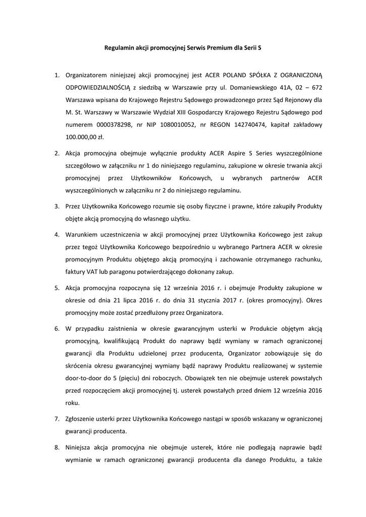Regulamin akcji promocyjnej Serwis Premium dla Serii S 1. Organizatorem niniejszej akcji promocyjnej jest ACER POLAND SPÓŁKA Z OGRANICZONĄ ODPOWIEDZIALNOŚCIĄ z siedzibą w Warszawie przy ul. Domaniewskiego 41A, 02 – 672 Warszawa wpisana do Krajowego Rejestru Sądowego prowadzonego przez Sąd Rejonowy dla M. St. Warszawy w Warszawie Wydział XIII Gospodarczy Krajowego Rejestru Sądowego pod numerem 0000378298, nr NIP 1080010052, nr REGON 142740474, kapitał zakładowy 100.000,00 zł. 2. Akcja promocyjna obejmuje wyłącznie produkty ACER Aspire S Series wyszczególnione szczegółowo w załączniku nr 1 do niniejszego regulaminu, zakupione w okresie trwania akcji promocyjnej przez Użytkowników Końcowych, u wybranych partnerów ACER wyszczególnionych w załączniku nr 2 do niniejszego regulaminu. 3. Przez Użytkownika Końcowego rozumie się osoby fizyczne i prawne, które zakupiły Produkty objęte akcją promocyjną do własnego użytku. 4. Warunkiem uczestniczenia w akcji promocyjnej przez Użytkownika Końcowego jest zakup przez tegoż Użytkownika Końcowego bezpośrednio u wybranego Partnera ACER w okresie promocyjnym Produktu objętego akcją promocyjną i zachowanie otrzymanego rachunku, faktury VAT lub paragonu potwierdzającego dokonany zakup. 5. Akcja promocyjna rozpoczyna się 12 września 2016 r. i obejmuje Produkty zakupione w okresie od dnia 21 lipca 2016 r. do dnia 31 stycznia 2017 r. (okres promocyjny). Okres promocyjny może zostać przedłużony przez Organizatora. 6. W przypadku zaistnienia w okresie gwarancyjnym usterki w Produkcie objętym akcją promocyjną, kwalifikującą Produkt do naprawy bądź wymiany w ramach ograniczonej gwarancji dla Produktu udzielonej przez producenta, Organizator zobowiązuje się do skrócenia okresu gwarancyjnej wymiany bądź naprawy Produktu realizowanej w systemie door-to-door do 5 (pięciu) dni roboczych. Obowiązek ten nie obejmuje usterek powstałych przed rozpoczęciem akcji promocyjnej tj. usterek powstałych przed dniem 12 września 2016 roku. 7. Zgłoszenie usterki przez Użytkownika Końcowego nastąpi w sposób wskazany w ograniczonej gwarancji producenta. 8. Niniejsza akcja promocyjna nie obejmuje usterek, które nie podlegają naprawie bądź wymianie w ramach ograniczonej gwarancji producenta dla danego Produktu, a także wymiany bądź naprawy Produktu realizowanej na podstawie ograniczonej gwarancji producenta w inny sposób niż door-to-door. Akcja promocyjna nie obejmuje również wymiany bądź naprawy Produktu przez sprzedawcę w ramach rękojmi na podstawie przepisów kodeksu cywilnego. 9. Okres pięciu dni roboczych na realizację naprawy lub wymiany gwarancyjnej będzie liczony od dnia odebrania Produktu od Użytkownika Końcowego do dnia podjęcia pierwszej próby doręczenia sprzętu po wykonanej naprawie bądź wymianie Użytkownikowi Końcowemu. Dnia odebrania Produktu nie uwzględnia się przy obliczaniu terminu. Dla każdej naprawy lub wymiany okres pięciu dni roboczych na realizację naprawy lub wymiany gwarancyjnej jest liczony indywidualnie. 10. Za dzień roboczy uznaje się dzień od poniedziałku do piątku, z wyłączeniem dni ustawowo wolnych od pracy. 11. W przypadku gdyby Użytkownik Końcowy nie odebrał naprawionego bądź wymienionego sprzętu przy pierwszej próbie doręczenia, a także gdyby na wniosek Użytkownika końcowego (złożony w dowolnej formie) doręczenie nastąpiło w późniejszym niż przewidzianym terminie, uznaje się, że Organizator wypełnił zobowiązanie do skrócenia czasu realizacji naprawy gwarancyjnej do 5 dni roboczych. 12. W przypadku gdyby Organizator nie wykonał zobowiązania do skrócenia okresu realizacji naprawy bądź wymiany Produktu w ramach ograniczonej gwarancji producenta, zobowiązuje się on uiścić na wniosek Użytkownika Końcowego odszkodowanie na jego rzecz w wysokości odpowiadającej cenie zakupu Produktu przez Użytkownika Końcowego. Do ceny zakupu Produktu nie wlicza się opłat za dostawę i ceny wszelkich akcesoriów, urządzeń peryferyjnych, oprogramowania, dodatkowych opcji lub innych aplikacji zakupionych dla danego Produktu. Użytkownikom Końcowym, którzy są zarejestrowanymi podatnikami VAT odszkodowanie przysługuje w wysokości równej cenie zakupu netto, a pozostałym Użytkownikom Końcowym przysługuje odszkodowanie równe uiszczonej cenie zakupu brutto. 13. Odszkodowanie określone wyżej przysługuje wyłącznie jeden raz w stosunku do danego Produktu i wyczerpuje wszystkie roszczenia Użytkownika Końcowego względem Organizatora z tytułu braku realizacji zobowiązania do skrócenia okresu realizacji naprawy bądź wymiany Produktu w ramach ograniczonej gwarancji producenta. 14. Użytkownik Końcowy, który jest uprawniony do udziału w Akcji Promocyjnej zgłasza wniosek o zapłatę odszkodowania o którym mowa wyżej w terminie 30 dni od daty niewykonania przez Organizatora zobowiązania do skrócenia okresu realizacji naprawy bądź wymiany Produktu w ramach ograniczonej gwarancji producenta. Za datę niewykonania zobowiązania do skrócenia okresu realizacji naprawy bądź wymiany Produktu w ramach ograniczonej gwarancji producenta uznaje się następny dzień po ostatnim dniu 5 dniowego terminu do wymiany lub naprawy Produktu. Wniosek o zapłatę odszkodowania złożony po upływie terminu do jego złożenia nie zostanie uwzględniony. 15. Użytkownik Końcowy zgłasza wniosek o którym mowa wyżej na formularzu dostępnym pod adresem internetowym http://www.acer.com/ac/pl/PL/content/support, w formie elektronicznej na adres email: [email protected]. Do wniosku należy dołączyć skan/zdjęcie dowodu zakupu z widoczną datą zakupu, ceną oraz danymi sprzedawcy, a także skan/zdjęcie nr seryjnego Produktu (SN), a także kodu kreskowego Produktu (SNID) celem umożliwienia Organizatorowi weryfikacji uprawnienia do uzyskania odszkodowania. W przypadku wystąpienia braków zgłoszenia Organizator zwróci się 