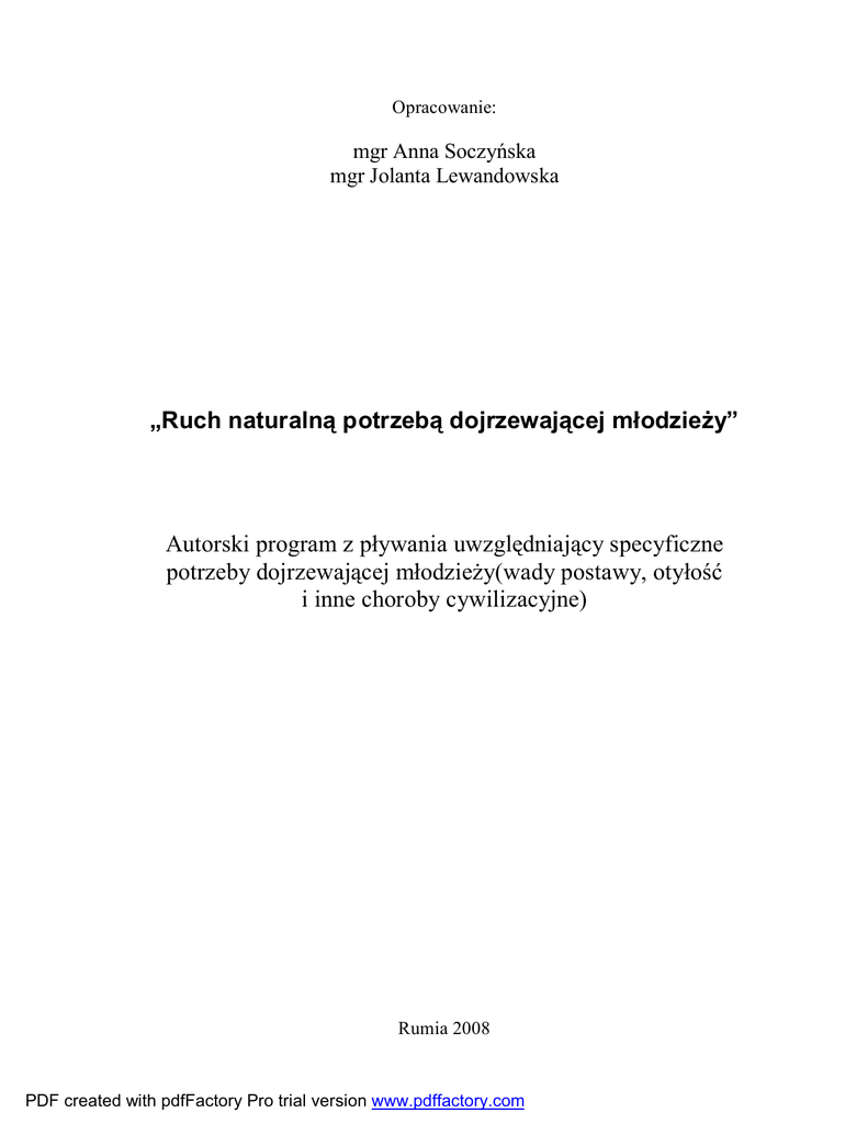 Opracowanie: mgr Anna Soczyńska mgr Jolanta Lewandowska „Ruch naturalną potrzebą dojrzewającej młodzieży” Autorski program z pływania uwzględniający specyficzne potrzeby dojrzewającej młodzieży(wady postawy, otyłość i inne choroby cywilizacyjne) Rumia 2008 PDF created with pdfFactory Pro trial version www.pdffactory.com Spis treści I. Pływanie a organizm. Rozwój fizyczny młodzieży gimnazjalnej. 1. Wszechstronność pływania………………………….…………………....3 2. Wiek gimnazjalny-„okres burzy i naporu”………………………….…....4 II. „Ruch naturalną potrzebą dojrzewającej młodzieży”- autorski program z pływania uwzględniający specyficzne potrzeby dojrzewającej młodzieży (wady postawy, otyłość i inne choroby cywilizacyjne) 3. Cele edukacyjne……………………………………………………………..5 4. Zadania szkoły………………………………………………………………6 5. Warunki do realizacji programu…………………………………………….6 6. Treści programu..……………………………………………………………7 7. Umiejętności………………………………………………..……………….7 8. Postawy i motywacje……………………………………..…………………7 9. Wiadomości...………………………………………………..……………...7 10. Procedury osiągania celów………………..………………..……………….8 11. Ocenianie……………………………………………..……………………..8 12. Treści kształcenia……………………………………………………………9 13. Standardy wymagań……………………..…………………………………12 14. Uwagi o realizacji programu……………………………………………….13 15. Wynikowy plan nauczania z pływania dla gimnazjum klasa II (chłopcy i dziewczęta)…………………………………………………………………14 16. Kryteria oceniania i zasady wystawiania oceny semestralnej i rocznej…....31 17. Metody i formy pracy……………………………………………………...35 18. Ewaluacja programu. Testy pomiaru osiągnięć ucznia……………………37 19. Materiały wspomagające realizację treści kształcenia i wychowania (przykładowe konspekty, gry i zabawy w wodzie )…………….…………38 20. Bibliografia………………………………………………………......…….60 -2- PDF created with pdfFactory Pro trial version www.pdffactory.com Wszechstronność pływania. Pływanie zalecane jest dla wszystkich ludzi, o różnym poziomie sprawności fizycznej i psychicznej, płci i zainteresowaniach. Oddziaływanie jego jest wszechstronne ze względu na pozorne zmniejszenie ciężaru ciała i odciążenie. Układ sercowo-naczyniowy - zwiększa się przepływ krwi dzięki czemu następuje lepsze ukrwienie wszystkich partii ciała. Przyśpieszone krążenie ułatwia usuwanie złogów z tętnic, obniżając równocześnie ciśnienie, poziom cholesterolu, zapobiegając utracie jędrności ciała i opóźniając proces starzenia się organizmu. Pływanie to doskonały trening dla układu oddechowego, powoduje zwiększoną wymianę powietrza zalegającego w płucach. Osoby korzystające regularnie z pływania mają większą wytrzymałość, siłę mięśniową, gibkość oraz następuje zmniejszenie tkanki tłuszczowej. Wpływa to pozytywnie na układ kostno-stawowy, a w szczególności na kręgosłup. Dzięki ćwiczeniom w wodzie następuje zmniejszenie nabytych i wrodzonych wad postawy, które nie tylko sprawiają ból, cierpienie, lecz także obniżają sprawność fizyczną. Wspaniałym wybawieniem z opresji są gry i zabawy w wodzie, które pomagają walczyć z wadami postawy, otyłością, wzmacniają psychiczną stronę człowieka oraz barwią życie, czyniąc je radosnym i przyjemnym. Emocje i radość czerpane z licznych form zabawowych i rekreacyjnych w wodzie sprzyjają samoakceptacji, ogólnemu wychowaniu oraz opanowaniu wiedzy i umiejętności z zakresu pływania oraz korekcji ciała. -3- PDF created with pdfFactory Pro trial version www.pdffactory.com Wiek gimnazjalny-„okres burzy i naporu” Okres dojrzewania to czas w życiu młodego człowieka między 12 a 16 rokiem życia. W tym czasie dokonuje się przeobrażenie dziecka w osobę dorosłą. Dzieci wcześniej dojrzewające przechodzą ten okres szybciej, u tych, u których rozwój jest spowolniony dojrzewają wolniej. U dzieci dojrzewających wolniej często występują problemy w sferze biologii, motoryczności i osobowości. Czasami dochodzi do depresji spowodowanych niemożnością nadążenia w zmianach biologicznych za rówieśnikami. Dzieci zaczynają przejmować się swoim wyglądem. Dziewczynki wstydzą się piersi a chłopcy np. trądziku oraz mutacji głosu. Klimat, tryb życia to wszystko przekłada się na funkcjonowanie młodego organizmu. Cały okres dojrzewania płciowego jest procesem wieloetapowym, w którym kształtują się odpowiednio cechy fizyczne, zdolność do wytwarzania komórek rozrodczych oraz cechy psychiczne. Dziecko zaczyna rosnąć, pojawiają się drugorzędowe cechy płciowe, zmienia się barwa głosu, cera, sposób poruszania się i gestykulacji. Proces dojrzewania nie przebiega w tym samym tempie u wszystkich i dochodzi do jego odchyleń. Zdarza się, że w jednej klasie są dzieci, które już zaczęły dojrzewać jak i takie, które jeszcze nie zaczęły. Widać duże dysproporcje we wzroście wśród osobników w jednej klasie. Dzieci dzielą się wtedy na bardziej i mniej dorosłych. Negatywnym skutkiem takiego podziału są waśnie i rywalizacja pomiędzy nieformalnie stworzonymi grupami. Okres dojrzewania to okres, w którym dzieci stają przed trudnymi zadaniami. Muszą zaakceptować zmiany, które w nich zachodzą, przyzwycz