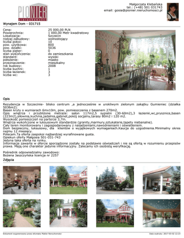Małgorzata Klebańska tel.: (+48) 501 031743 email: [email protected] Wynajem Dom - 031715 Cena: Powierzchnia: Lokalizacja: rodzaj zabudowy: liczba pokoi: pow. użytkowa: pow. działki: liczba pięter: stan wykończenia: standard: położenie: przeznaczenie: rok budowy: liczba kuchni: liczba łazienek: liczba wc: 25 000,00 PLN 1 000,00 Metr kwadratowy Szczecin wolnostojący 10 800 5036 0 do zamieszkania wysoki miasto mieszkalny 2008 1 3 3 Opis Rezydencja w Szczecinie- blisko centrum ,a jednocześnie w urokliwym zielonym zakątku Gumieniec (działka 5036m2). Basen kryty o wymiarach 6mx10m, pow. pomieszczenia z basenem 270m2. Opis wnętrza i przybliżone metraże: salon 117m2,5 sypialni (30-60m2),3 łazienki,wc,prysznice,basen (223m2),siłownia,kuchnia,jadalnia,gabinet,pokój socjalny,tarasy 80m2 i 120 m2. Wysokość pomieszczeń na parterze 3,7m. Wnętrza wykończone w luksusowym standardzie (granity,marmury,sztukaterie,tapety niebanalne). Cały teren monitorowany i zagospodarowany z nasadzeniami,nawodnieniami i oświetleniem. Dom bezpieczny, luksusowy, dla klientów o wyjątkowych wymaganiach.Kaucja do uzgodnienia.Minimalny okres najmu 12 miesięcy. Polecam.Ta oferta zaspokoi najbardziej wyrafinowane gusta. Opiekun oferty Małgosia 501-031-743 Jedyna taka oferta na rynku. Informacje zawarte w ofercie sporządzone zostały na podstawie oświadczeń i nie są ofertą w rozumieniu przepisów prawa. Mają one charakter jedynie informacyjny. Zalecamy ich osobistą weryfikację. Pośrednik odpowiedzialny zawodowo: Bożena Jaszczyńska licencja nr 2257 Zdjęcia Dokument wygenerowany przez eKomako Makler Nieruchomości Data wydruku: 2017-03-02 12:23
