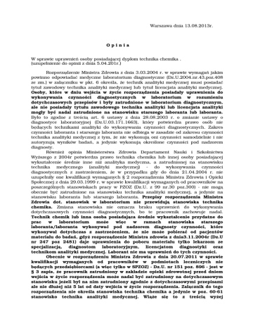 Warszawa dnia 13.08.2013r. Opinia W sprawie uprawnień osoby posiadającej dyplom technika chemika . (uzupełnienie do opinii z dnia 5.04.201r.) Rozporządzenie Ministra Zdrowia z dnia 3.03.2004 r. w sprawie wymagań jakim powinno odpowiadać medyczne laboratorium diagnostyczne (Dz.U.2004.nr.43.poz.408 ze zm.) w załączniku w pkt. 6 określa, że technik analityki medycznej musi posiadać tytuł zawodowy technika analityki medycznej lub tytuł licencjata analityki medycznej. Osoby, które w dniu wejścia w życie rozporządzenia posiadały uprawnienia do wykonywania czynności diagnostycznych w laboratorium w rozumieniu dotychczasowych przepisów i były zatrudnione w laboratorium diagnostycznym, ale nie posiadały tytułu zawodowego technika analityki lub licencjata analityki mogły być nadal zatrudnione na stanowisku starszego laboranta lub laboranta. Było to zgodne z treścią art. 6 ustawy z dnia 28.08.2003 r. o zmianie ustawy o diagnostyce laboratoryjnej (Dz.U.03.171.1663), który potwierdza prawo osób nie będących technikami analityki do wykonywania czynności diagnostycznych. Zakres czynności laboranta i starszego laboranta nie odbiega w zasadzie od zakresu czynności technika analityki medycznej z tym, że nie wykonują oni czynności samodzielnie i nie autoryzują wyników badań, a jedynie wykonują określone czynności pod nadzorem diagnosty. Również opinia Ministerstwa Zdrowia Departament Nauki i Szkolnictwa Wyższego z 2004r potwierdza prawo technika chemika lub innej osoby posiadającej wykształcenie średnie inne niż analityka medyczna, a zatrudnionej na stanowisku technika medycznego (analityki medycznej) - do wykonywania czynności diagnostycznych z zastrzeżeniem, że w przypadku gdy do dnia 21.04.2004 r. nie uzupełniły one kwalifikacji wymaganych § 2 rozporządzenia Ministra Zdrowia i Opieki Społecznej z dnia 29.03.1999 r. w sprawie kwalifikacji wymaganych od pracowników na poszczególnych stanowiskach pracy w PZOZ (Dz.U. z 99 nr.30 poz.300) - nie mogą obecnie być zatrudnione na stanowisku technika analityki medycznej, a jedynie na stanowisku laboranta lub starszego laboranta. Przepisy rozporządzenia Ministra Zdrowia dot. stanowisk w laboratorium nie przewidują stanowiska technika chemika. Zmiana stanowiska nie oznacza braku uprawnień do wykonywania dotychczasowych czynności diagnostycznych, bo te pracownik zachowuje nadal. Technik chemik lub inna osoba posiadająca średnie wykształcenie przydatne do prac w laboratorium może więc w ramach stanowiska starszego laboranta/laboranta wykonywać pod nadzorem diagnosty czynności, które wykonywał dotychczas z zastrzeżeniem, że nie może pobierać od pacjentów materiału do badań, gdyż rozporządzenie Ministra zdrowia z dnia3.11.2004r (Dz.U nr 247 poz 2481) daje uprawnienia do poboru materiału tylko lekarzom ze specjalizacją, diagnostom laboratoryjnym, licencjatom diagnostyki oraz technikom analityki medycznej. Laborant nie ma uprawnień do tych czynności. Obecnie w rozporządzeniu Ministra Zdrowia z dnia 20.07.2011 w sprawie kwalifikacji wymaganych od pracowników w podmiotach leczniczych nie będących przedsiębiorcami (a więc tylko w SPZOZ) - Dz.U. nr 151 poz. 896 - jest w § 3 zapis, że pracownik zatrudniony w zakładzie opieki zdrowotnej przed dniem wejścia w życie rozporządzenia może nadal być zatrudniony na dotychczasowym stanowisku jeżeli był na nim zatrudniony zgodnie z dotychczasowymi przepisami ale nie dłużej niż 5 lat od daty wejścia w życie rozporządzenia. Załącznik do tego rozporządzenia nie określa stanowiska technika chemika a jedynie w poz. 60-61 stanowisko technika analityki medycznej. Wiąże się to z treścią wyżej cytowanego rozporządzenia Ministra Zdrowia z 29.03.1999r, które już wówczas zobowiązywało osoby zatrudnione w laboratorium na określonym stanowisku do uzupełnienia kwalifikacji lub zatrudnienia na stanowisku laboranta. Jedynie w rozporządzeniu Ministra Zdrowia z dnia 4.11.2004r w sprawie kwalifikacji osób zatrudnionych w jednostkach organizacyjnych publicznej służby krwi (Dz.U. nr 247 poz. 2482)w zał. nr l pod poz. 5 wskazano stanowiska starszy technik i technik posiadający wykształcenie średnie technika chemika i technika farmaceutycznego. Oznacza to, że tylko w jednostkach RCKiK mogą być nadal zatrudnieni technicy chemicy, którzy wykonują czynności określone zakresem zezwolenia RCKiK natomiast w laboratoriach diagnostycznych nie ma możliwości zatrudnienia technika chemika na stanowisku technika analityki medycznej a jedynie na stanowisku laboranta. Radca Prawny Grażyna Filipowska - Kejna Nr rej. WAR 1376 07.11.2005