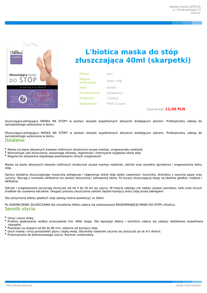 Apteka Polska APTE.PL ul. Derdowskiego 21 Rumia L'biotica maska do stóp złuszczająca 40ml (skarpetki) Postać: płyn Miejsce stosowania: stopy, nogi Wiek: dorośli Przeznaczenie: pielęgnacja Producent: L'biotica Opakowanie: 40ml (1 para) Cena brutto: 11,59 PLN złuszczająco-pilingująca MASKA NA STOPY w postaci skarpet wypełnionych aktywnie działającym płynem. Profesjonalny zabieg do samodzielnego wykonania w domu. Złuszczająco-pilingująca MASKA NA STOPY w postaci skarpet wypełnionych aktywnie działającym płynem. Profesjonalny zabieg do samodzielnego wykonania w domu. Działanie: Maska na bazie aktywnych kwasów roślinnych skutecznie usuwa martwy, zrogowaciały naskórek. Normalizuje cykl złuszczania, wspomaga odnowę, regeneruje i intensywne wygładza skórę stóp Regularnie stosowana zapobiega powstawaniu silnych zrogowaceń. Maska na bazie aktywnych kwasów roślinnych skutecznie usuwa martwy naskórek, odciski oraz wszelkie zgrubienia i zrogowacenia skóry stóp. Oprócz działania złuszczającego maseczka pielęgnuje i regeneruje skórę stóp dzięki zawartości mocznika, ekstraktu z owoców papai oraz cytryny. Wyciąg z rumianku delikatnie koi świeżo złuszczoną i odnowioną skórę. Po kuracji złuszczającej stopy są idealnie gładkie, miękkie i delikatne. Odciski i zrogowacenia zaczynają złuszczać się od 4 do 10 dni po użyciu. W trakcie zabiegu nie należy używać pumeksu, tarki oraz innych środków do usuwania odcisków. Długość procesu złuszczania zależeć będzie kondycji skóry stóp przed zabiegiem. Dla utrzymania efektu gładkich stóp zabieg można powtórzyć co 30dni. Po ZAKOŃCZENIU ZŁUSZCZANIA dla utrwalenia efektu zaleca się zastosowanie REGENERUJĄCEJ MASKI DO STÓP L?biotica. Sposób użycia: Umyj i osusz stopy. Przetnij opakowanie wzdłuż przerywanej linii. Włóż stopę. Dla lepszego efektu i komfortu zaleca się założyć dodatkowo bawełniane skarpetki. Pozostaw na stopach od 60 do 90 min, zależnie od kondycji stóp. Usuń maskę i zmyj pozostałość płynu ciepłą wodą. Obumarły naskórek zacznie się złuszczać po ok 4-5 dniach. Przeznaczone do jednorazowego użycia. Rozmiar uniwersalny. http://www.apte.pl sklep internetowy