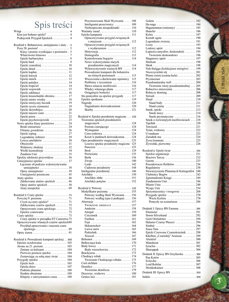 Spis treści Wstęp . . . . . . . . . . . . . . . . . . . . . . . . . . . . . . . . . . 4 Kim jest bohater epicki? . . . . . . . . . . . . . . . 4 Podręcznik Przygód Epickich . . . . . . . . . . . 4 Rozdział 2: Czary epickie . . . . . . . . . . . . . . . . . 71 Powyżej 9. poziomu . . . . . . . . . . . . . . . . . 71 Czym są czary epickie? . . . . . . . . . . . . 71 Zdobywanie czarów epickich . . . . . . . . 72 Opracowanie czaru epickiego . . . . . . . . 72 Epickie czarowanie . . . . . . . . . . . . . . . . 72 Czary epickie . . . . . . . . . . . . . . . . . . . . . . . 73 Czary epickie w porządku ST Czarostwa 73 Opracowywanie własnych czarów epickich88 Przykład opracowania i rzucenia czaru epickiego . . . . . . . . . . . . . . . . . . . . . . 89 Opisy ziaren . . . . . . . . . . . . . . . . . . . . . . . . 91 Rozdział 3: Prowadzenie kampanii epickiej . . 103 Epickie oczekiwania . . . . . . . . . . . . . . . . 103 Awans na 21. poziom . . . . . . . . . . . . . . . . 103 Zmiany za kulisami . . . . . . . . . . . . . . . 104 Pierwsze postacie epickie . . . . . . . . . . 104 Zostawiając za sobą stary świat . . . . . 104 Przygody epickie . . . . . . . . . . . . . . . . . . . 104 Epicki loch . . . . . . . . . . . . . . . . . . . . . . 105 Epicka dzicz . . . . . . . . . . . . . . . . . . . . 107 Podróże planarne . . . . . . . . . . . . . . . . . 108 Średnie obrażenia . . . . . . . . . . . . . . . . 108 Kłopoty z zatrzymaniem czasu . . . . . . 108 108 109 110 110 111 112 112 112 113 114 114 114 115 115 116 116 117 117 117 119 120 120 121 Rozdział 4: Epickie przedmioty magiczne . . . 123 Tworzenie epickich przedmiotów magicznych . . . . . . . . . . . . . . . . . . . . . 124 Poziom czarującego . . . . . . . . . . . . . . 124 Wymagania . . . . . . . . . . . . . . . . . . . . . 124 Cena rynkowa . . . . . . . . . . . . . . . . . . . 124 Koszt w punktach doświadczenia . . . . 124 Opis przedmiotów magicznych . . . . . . . . 125 Losowe epickie przedmioty magiczne 125 Pancerze . . . . . . . . . . . . . . . . . . . . . . . 125 Broń . . . . . . . . . . . . . . . . . . . . . . . . . . . 129 Pierścienie . . . . . . . . . . . . . . . . . . . . . . 135 Berła . . . . . . . . . . . . . . . . . . . . . . . . . . 136 Zwoje . . . . . . . . . . . . . . . . . . . . . . . . . . 140 Laski . . . . . . . . . . . . . . . . . . . . . . . . . . 142 Cudowne przedmioty . . . . . . . . . . . . . 144 Inteligentne przedmioty . . . . . . . . . . . . . . 146 Artefakty . . . . . . . . . . . . . . . . . . . . . . . . . 150 Artefakty słabe . . . . . . . . . . . . . . . . . . 151 Artefakty potężne . . . . . . . . . . . . . . . . 152 Rozdział 5: Potwory . . . . . . . . . . . . . . . . . . . . 155 Modyfikator poziomu . . . . . . . . . . . . . . . 155 Potwory według Skali Wyzwania . . . . 156 Potwory według typu (i podtypu) . . . . 156 Aberracja . . . . . . . . . . . . . . . . . . . . . . . . . 157 TWORZENIE ABERRACJI . . . . . . . . . . . . . 157 Anaksim . . . . . . . . . . . . . . . . . . . . . . . . 158 Atropal . . . . . . . . . . . . . . . . . . . . . . . . . 159 Cziczimek . . . . . . . . . . . . . . . . . . . . . . 160 Faethon . . . . . . . . . . . . . . . . . . . . . . . . 161 Fejn . . . . . . . . . . . . . . . . . . . . . . . . . . . 162 Hekatoncheir . . . . . . . . . . . . . . . . . . . . 164 Larwa snów . . . . . . . . . . . . . . . . . . . . . 165 Piekielnik . . . . . . . . . . . . . . . . . . . . . . . 166 Xixecal . . . . . . . . . . . . . . . . . . . . . . . . . 167 Behemot . . . . . . . . . . . . . . . . . . . . . . . . . . 169 Bełkocząca kula . . . . . . . . . . . . . . . . . . . . 170 Biały łowca . . . . . . . . . . . . . . . . . . . . . . . 171 Biały wierzchowiec . . . . . . . . . . . . . . . 172 Brachyurus . . . . . . . . . . . . . . . . . . . . . . . . 173 Chodzący robak . . . . . . . . . . . . . . . . . . . . 174 Tworzenie Chodzącego robaka . . . . . . 175 Cień otchłani . . . . . . . . . . . . . . . . . . . . . . 176 Demilicz . . . . . . . . . . . . . . . . . . . . . . . . . . 177 Tworzenie demilicza . . . . . . . . . . . . . . 179 Drzewiec, wiekowy . . . . . . . . . . . . . . . . . 180 Genius loci . . . . . . . . . . . . . . . . . . . . . . . . 181 Golem . . . . . . . . . . . . . . . . . . . . . . . . . . . Ha-naga . . . . . . . . . . . . . . . . . . . . . . . . . . Hagunemnon (zmienny) . . . . . . . . . . . . . Hunefer . . . . . . . . . . . . . . . . . . . . . . . . . . Kolos . . . . . . . . . . . . . . . . . . . . . . . . . . . . Kształt ognia . . . . . . . . . . . . . . . . . . . . . . Legendarne zwierzę . . . . . . . . . . . . . . . . . Leszy . . . . . . . . . . . . . . . . . . . . . . . . . . . . Lodowy upiór . . . . . . . . . . . . . . . . . . . . . Łupieżca umysłów, doskonałość . . . . . . . Tworzenie doskonałości . . . . . . . . . . . Magmowy upiór . . . . . . . . . . . . . . . . . . . Merkant . . . . . . . . . . . . . . . . . . . . . . . . . . Mrok . . . . . . . . . . . . . . . . . . . . . . . . . . . . . Neh-thalggu (kolekcjoner mózgów) . . . . Niszczycielski rój . . . . . . . . . . . . . . . . . . Plama cienia (czarna kula) . . . . . . . . . . . . Pryzmozaur . . . . . . . . . . . . . . . . . . . . . . . Pseudonaturalny troll . . . . . . . . . . . . . . . . Tworzenie istoty pseudonaturalnej . . . Robactwo zniszczenia . . . . . . . . . . . . . . . Robaczy demiurg . . . . . . . . . . . . . . . . . . . Sirrush . . . . . . . . . . . . . . . . . . . . . . . . . . . Slaad . . . . . . . . . . . . . . . . . . . . . . . . . . . . . Slaad biały . . . . . . . . . . . . . . . . . . . . . Slaad czarny . . . . . . . . . . . . . . . . . . . . Smok, epicki . . . . . . . . . . . . . . . . . . . . . . Smok mocy . . . . . . . . . . . . . . . . . . . . . Smok pryzmatyczny . . . . . . . . . . . . . . Smok o rozwiniętych możliwościach . . . Tajellah . . . . . . . . . . . . . . . . . . . . . . . . . . . Torciasid . . . . . . . . . . . . . . . . . . . . . . . . . . Tytan, wi