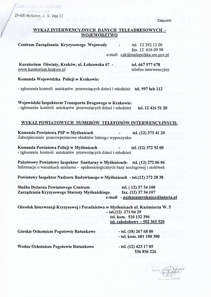 8 2 - 4 0 0 Myślenice, ul. M . Rejo 1 3 Załącznik WYKAZ INTERWENCYJNYCH DANYCH TELEADRESOWYCH WOJEWÓDZTWO Centrum Zarządzania Kryzysowego Wojewody - tel. 12 392 13 00 fax. 12 616 09 98 e-mail: [email protected] Kuratorium Oświaty, Kraków, ul. Łobzowska 67 - tel. 667 977 678 www.kuratorium.krakow.pl telefon interwencyjny Komenda Wojewódzka Policji w Krakowie: - zgłoszenia kontroli autokarów przewożących dzieci i młodzież Wojewódzki Inspektorat Transportu Drogowego w Krakowie: - zgłoszenia kontroli autokarów przewożących dzieci i młodzież teł. 997 lub 112 tel. 12 416 51 20 WYKAZ POWIATOWYCH NUMERÓW TELEFONÓW INTERWENCYJNYCH: Komenda Powiatowa PSP w Myślenicach tel. (12) 373 41 20 Zabezpieczenie przeciwpożarowe obiektów letniego wypoczynku Komenda Powiatowa Policji w Myślenicach tel. (12) 372 92 00 - zgłoszenia kontroli autokarów przewożących dzieci i młodzież Państwowy Powiatowy Inspektor Sanitarny w Myślenicach- tel. (12) 272 06 06 Informacje o warunkach sanitarno - epidemiologicznych bazy noclegowej i stołówek Powiatowy Inspektor Nadzoru Budowlanego w Myślenicach - tel.(12) 272 28 38 Służba Dyżurna Powiatowego Centrum tel. ( 1 2 ) 37 34 100 Zarządzania Kryzysowego Starosty Myślenickiego fax. (12) 37 34 107 e-mail - [email protected] Ośrodek Interwencji Kryzysowej i Poradnictwa w Myślenicach ul. Kazimierza W. 5 - tel.(12) 271 04 29 tel. kom. 510 132 396 tel. całodobowy - 502 365 520 Górskie Ochotnicze Pogotowie Ratunkowe - tel. (18) 267 68 80 - tel. kom. 601 100 300 Wodne Ochotnicze Pogotowie Ratunkowe - teł. (12) 423 17 85 536 856 226