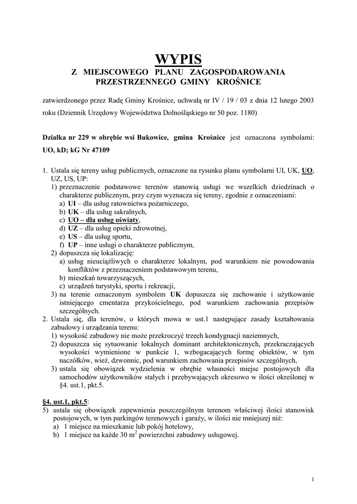 WYPIS Z MIEJSCOWEGO PLANU ZAGOSPODAROWANIA PRZESTRZENNEGO GMINY KROŚNICE zatwierdzonego przez Radę Gminy Krośnice, uchwałą nr IV / 19 / 03 z dnia 12 lutego 2003 roku (Dziennik Urzędowy Województwa Dolnośląskiego nr 50 poz. 1180) Działka nr 229 w obrębie wsi Bukowice, gmina Krośnice jest oznaczona symbolami: UO, kD; kG Nr 47109 1. Ustala się tereny usług publicznych, oznaczone na rysunku planu symbolami UI, UK, UO, UZ, US, UP: 1) przeznaczenie podstawowe terenów stanowią usługi we wszelkich dziedzinach o charakterze publicznym, przy czym wyznacza się tereny, zgodnie z oznaczeniami: a) UI – dla usług ratownictwa pożarniczego, b) UK – dla usług sakralnych, c) UO – dla usług oświaty, d) UZ – dla usług opieki zdrowotnej, e) US – dla usług sportu, f) UP – inne usługi o charakterze publicznym, 2) dopuszcza się lokalizację: a) usług nieuciążliwych o charakterze lokalnym, pod warunkiem nie powodowania konfliktów z przeznaczeniem podstawowym terenu, b) mieszkań towarzyszących, c) urządzeń turystyki, sportu i rekreacji, 3) na terenie oznaczonym symbolem UK dopuszcza się zachowanie i użytkowanie istniejącego cmentarza przykościelnego, pod warunkiem zachowania przepisów szczególnych. 2. Ustala się, dla terenów, o których mowa w ust.1 następujące zasady kształtowania zabudowy i urządzania terenu: 1) wysokość zabudowy nie może przekroczyć trzech kondygnacji naziemnych, 2) dopuszcza się sytuowanie lokalnych dominant architektonicznych, przekraczających wysokości wymienione w punkcie 1, wzbogacających formę obiektów, w tym naczółków, wież, dzwonnic, pod warunkiem zachowania przepisów szczególnych, 3) ustala się obowiązek wydzielenia w obrębie własności miejsc postojowych dla samochodów użytkowników stałych i przebywających okresowo w ilości określonej w §4. ust.1, pkt.5. §4. ust.1, pkt.5: 5) ustala się obowiązek zapewnienia poszczególnym terenom właściwej ilości stanowisk postojowych, w tym parkingów terenowych i garaży, w ilości nie mniejszej niż: a) 1 miejsce na mieszkanie lub pokój hotelowy, b) 1 miejsce na każde 30 m2 powierzchni zabudowy usługowej. 1 kD – tereny dróg dojazdowych o minimalnej szerokości w liniach rozgraniczających 10m lub zgodnie z lokalnymi uwarunkowaniami. kG 1/2 nr 47 109 - teren drogi głównej w ciągu drogi powiatowej nr 47 109, relacji Twardogóra – Grabowno Małe – Bukowice – Czeszów, o minimalnej szerokości w liniach rozgraniczających 25 m lub zgodnie z lokalnymi uwarunkowaniami, jak na rysunku planu. Działka leży w następujących strefach: „B” ochrony konserwatorskiej, w granicach której: a) wszystkie nowe inwestycje, przebudowy, rozbudowy, remonty, zmiany funkcji, podziały działek, obiektów figurujących w wykazie zabytków na tym terenie należy uzgadniać z właściwymi Służbami Ochrony Zabytków, b) należy dostosowywać nową zabudowę do historycznej kompozycji przestrzennej w zakresie skali, formy bryły, przy założeniu harmonijnego współistnienia elementów kompozycji historycznej i współczesnej, – „K” ochrony krajobrazu, w granicach których: a) wszystkie nowe inwestycyjne należy uzgadniać z właściwymi Służbami Ochrony Zabytków, b) formę nowych i modernizowanych obiektów należy dostosować do skali, ukształtowania bryły i detalu historycznej zabudowy, w tym formy i wysokości dachu, układu kalenicy, poziomu posadowienia parteru, formy i wysokości ogrodzenia, c) wysokość nowej i modernizowanej zabudowy nie może przekroczyć dwóch kondygnacji naziemnych, to jest parter i poddasze użytkowe i nie więcej niż 9m licząc od posadowienia budynku do kalenicy dachu, d) należy stosować dachy strome, o symetrycznych połaciach, pokryte dachówką lub materiałem imitującym dachówkę, kąt nachylenia połaci i dachowych wynosi od 35° do 55°, e) zakazuje się stosowania dachów o połaciach niesymetrycznych lub mijających się na wysokości kalenicy, f) przy lokalizacji nowej zabudowy należy uwzględniać historyczne związki przestrzenne, g) należy chronić i utrzymywać istniejące układy dróg, miedz, zadrzewień śródpolnych, alei, szpalerów, cieków wodnych, grobli i stawów. „OW” obserwacji archeologicznej, w granicach której: a) wszelkie zamierzenia inwestycyjne podlegają uzgodnieniu z właściwymi Służbami Ochrony Zabytków, b) prace ziemne muszą być prowadzone pod nadzorem archeologicznokonserwatorskim, c) inwestor jest zobowiązany do powiadomienia właściwe Służby Ochrony Zabytków o terminie rozpoczęcia i zakończenia prac ziemnych z 7-dniowym wyprzedzeniem, d) w przypadku wystąpienia zabytków i obiektów archeologicznych zostaną podjęte ratownicze badania wykopaliskowe. ochrony sanitarnej cmentarzy, w granicach których zakazuje się lokalizowania mieszkań, usług związanych z obrotem żywnością oraz obiektów gastronomii i rozrywki. 2 WYRYS Z MIEJSCOWEGO PLANU ZAGOSPODAROWANIA PRZESTRZENNEGO GMINY KROŚNICE zatwierdzonego przez Radę Gminy Krośnice, uchwałą nr IV / 19 / 03 z dnia 12 lutego 2003 roku (Dziennik Urzędowy Województwa Dolnośląskiego nr 50 poz. 1180) Działka nr 229 w obrębie wsi Bukowice, gmina Krośnice jest oznaczona symbolami: UO, kD; kG Nr 47109 3