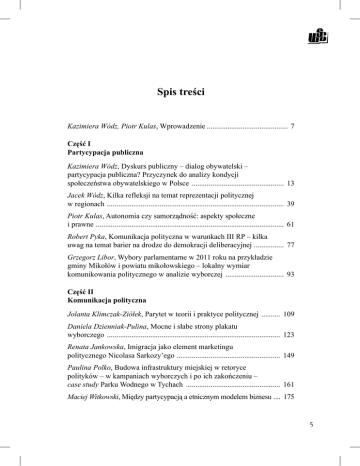 Spis treści Kazimiera Wódz, Piotr Kulas, Wprowadzenie ............................................ 7 Część I Partycypacja publiczna Kazimiera Wódz, Dyskurs publiczny – dialog obywatelski – partycypacja publiczna? Przyczynek do analizy kondycji społeczeństwa obywatelskiego w Polsce .................................................. 13 Jacek Wódz, Kilka refleksji na temat reprezentacji politycznej w regionach ............................................................................................... 39 Piotr Kulas, Autonomia czy samorządność: aspekty społeczne i prawne ..................................................................................................... 61 Robert Pyka, Komunikacja polityczna w warunkach III RP – kilka uwag na temat barier na drodze do demokracji deliberacyjnej ................. 77 Grzegorz Libor, Wybory parlamentarne w 2011 roku na przykładzie gminy Mikołów i powiatu mikołowskiego – lokalny wymiar komunikowania politycznego w analizie wyborczej ................................ 93 Część II Komunikacja polityczna Jolanta Klimczak-Ziółek, Parytet w teorii i praktyce politycznej ........... 109 Daniela Dzienniak-Pulina, Mocne i słabe strony plakatu wyborczego ............................................................................................. 123 Renata Jankowska, Imigracja jako element marketingu politycznego Nicolasa Sarkozy’ego ........................................................ 149 Paulina Polko, Budowa infrastruktury miejskiej w retoryce polityków – w kampaniach wyborczych i po ich zakończeniu – case study Parku Wodnego w Tychach ................................................... 161 Maciej Witkowski, Między partycypacją a etnicznym modelem biznesu ..... 175 5