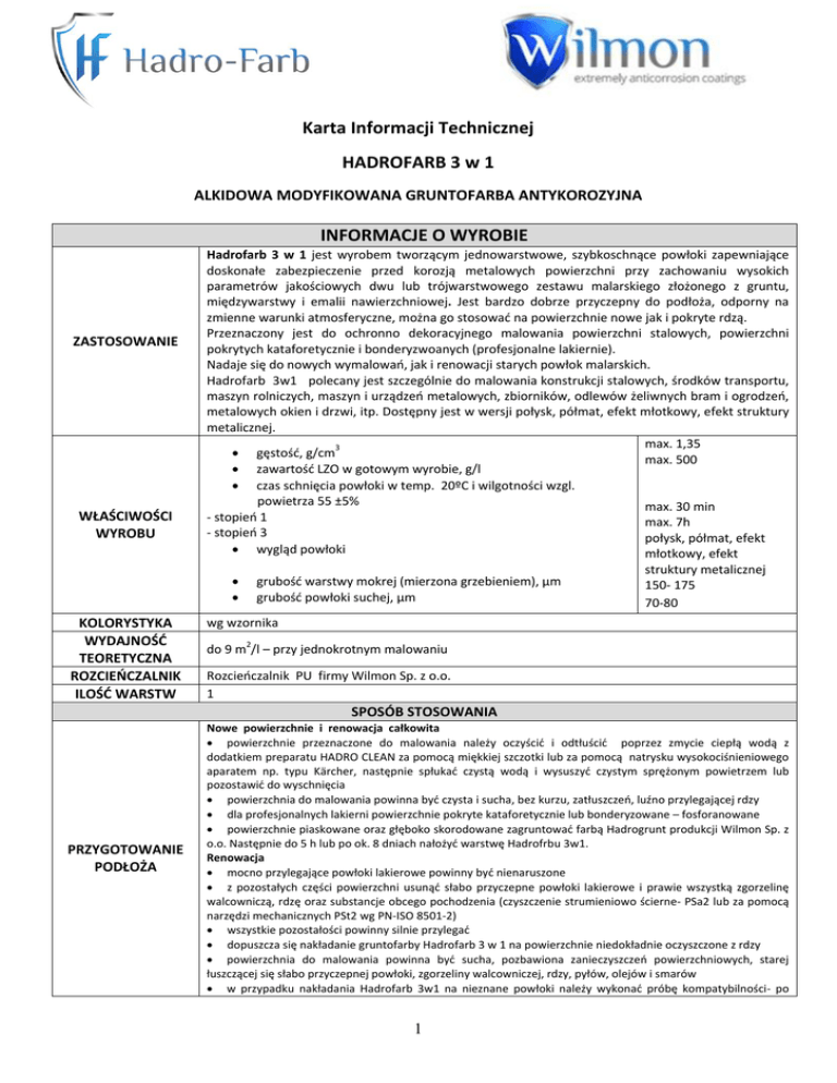 Karta Informacji Technicznej HADROFARB 3 w 1 ALKIDOWA MODYFIKOWANA GRUNTOFARBA ANTYKOROZYJNA INFORMACJE O WYROBIE ZASTOSOWANIE WŁAŚCIWOŚCI WYROBU Hadrofarb 3 w 1 jest wyrobem tworzącym jednowarstwowe, szybkoschnące powłoki zapewniające doskonałe zabezpieczenie przed korozją metalowych powierzchni przy zachowaniu wysokich parametrów jakościowych dwu lub trójwarstwowego zestawu malarskiego złożonego z gruntu, międzywarstwy i emalii nawierzchniowej. Jest bardzo dobrze przyczepny do podłoża, odporny na zmienne warunki atmosferyczne, można go stosować na powierzchnie nowe jak i pokryte rdzą. Przeznaczony jest do ochronno dekoracyjnego malowania powierzchni stalowych, powierzchni pokrytych kataforetycznie i bonderyzwoanych (profesjonalne lakiernie). Nadaje się do nowych wymalowań, jak i renowacji starych powłok malarskich. Hadrofarb 3w1 polecany jest szczególnie do malowania konstrukcji stalowych, środków transportu, maszyn rolniczych, maszyn i urządzeń metalowych, zbiorników, odlewów żeliwnych bram i ogrodzeń, metalowych okien i drzwi, itp. Dostępny jest w wersji połysk, półmat, efekt młotkowy, efekt struktury metalicznej. max. 1,35 gęstość, g/cm3 max. 500 zawartość LZO w gotowym wyrobie, g/l czas schnięcia powłoki w temp. 20ºC i wilgotności wzgl. powietrza 55 ±5% max. 30 min - stopień 1 max. 7h - stopień 3 połysk, półmat, efekt wygląd powłoki młotkowy, efekt KOLORYSTYKA WYDAJNOŚĆ TEORETYCZNA ROZCIEŃCZALNIK ILOŚĆ WARSTW grubość warstwy mokrej (mierzona grzebieniem), µm grubość powłoki suchej, µm struktury metalicznej 150- 175 70-80 wg wzornika do 9 m2/l – przy jednokrotnym malowaniu Rozcieńczalnik PU firmy Wilmon Sp. z o.o. 1 SPOSÓB STOSOWANIA PRZYGOTOWANIE PODŁOŻA Nowe powierzchnie i renowacja całkowita powierzchnie przeznaczone do malowania należy oczyścić i odtłuścić poprzez zmycie ciepłą wodą z dodatkiem preparatu HADRO CLEAN za pomocą miękkiej szczotki lub za pomocą natrysku wysokociśnieniowego aparatem np. typu Kärcher, następnie spłukać czystą wodą i wysuszyć czystym sprężonym powietrzem lub pozostawić do wyschnięcia powierzchnia do malowania powinna być czysta i sucha, bez kurzu, zatłuszczeń, luźno przylegającej rdzy dla profesjonalnych lakierni powierzchnie pokryte kataforetycznie lub bonderyzowane – fosforanowane powierzchnie piaskowane oraz głęboko skorodowane zagruntować farbą Hadrogrunt produkcji Wilmon Sp. z o.o. Następnie do 5 h lub po ok. 8 dniach nałożyć warstwę Hadrofrbu 3w1. Renowacja mocno przylegające powłoki lakierowe powinny być nienaruszone z pozostałych części powierzchni usunąć słabo przyczepne powłoki lakierowe i prawie wszystką zgorzelinę walcowniczą, rdzę oraz substancje obcego pochodzenia (czyszczenie strumieniowo ścierne- PSa2 lub za pomocą narzędzi mechanicznych PSt2 wg PN-ISO 8501-2) wszystkie pozostałości powinny silnie przylegać dopuszcza się nakładanie gruntofarby Hadrofarb 3 w 1 na powierzchnie niedokładnie oczyszczone z rdzy powierzchnia do malowania powinna być sucha, pozbawiona zanieczyszczeń powierzchniowych, starej łuszczącej się słabo przyczepnej powłoki, zgorzeliny walcowniczej, rdzy, pyłów, olejów i smarów w przypadku nakładania Hadrofarb 3w1 na nieznane powłoki należy wykonać próbę kompatybilności- po 1 PRZYGOTOWANIE WYROBU MALOWANIE METODY APLIKACJI oczyszczeniu na starą powłokę nałożyć na niewielkiej powierzchni Hadrofarb 3w1. Po wyschnięciu powłoka powinna być jednorodna, bez spęcznienia i pomarszczenia. W razie wystąpienia wad- stara farbę usunąć. w przypadku podłoża wcześniej malowanego, na którym próba kompatybilności wypadła pozytywnie, sprawdzić przyczepność powłok do podłoża- poprzez nacięcia nożem i szpachelką. Jeśli farby odspajają się lub odpryskują, należy oczyścić powierzchnię ze starej powłoki malarskiej. do mycia i odtłuszczania powierzchni należy stosować preparat HADRO CLEAN (zgodnie z instrukcja na opakowaniu). farba po dokładnym wymieszaniu nadaje się do aplikacji. W związku z możliwością zagęszczania wyrobu w trakcie magazynowania (w wyniku częściowego odparowania rozpuszczalnika), w razie potrzeby dodać maksymalnie 5 % rozcieńczalnika PU produkcji Wilmon Sp. z o.o. w przypadku zakupu dwóch lub więcej opakowań farby tego samego koloru z różnych partii produkcyjnych należy przelać całą farbę do większego pojemnika i wymieszać (pomiędzy partiami produkcyjnymi mogą wytypować nieznaczne różnice w odcieniu i połysku) prace malarskie prowadzić w temperaturze otoczenia +10°C do +25 °C, temperatura podłoża co najmniej 3 ºC wyższa od temperatury punktu rosy powinna mieścić się w przedziale pomiędzy +5 °C a +25ºC wilgotność względna powietrza nie powinna przekraczać 80% nie malować podczas intensywnych upałów, wilgotnych powierzchni oraz gdy istnieje prawdopodobieństwo opadów deszczu, nakładać miękkim pędzlem z krótkim włosiem, wałkiem lub za pomocą natrysku, prace rozpocząć od dokładnego pomalowania krawędzi wyroby połyskowe, półmatowe oraz z efektem struktury metalicznej malować sposobem krzyżowym metodą „mokro na mokro” (tzn. poziomymi i pionowymi pasami 2-3 razy), tak aby grubość powłoki mierzona przyrządem grzebieniowym na mokro wynosiła 150µm (grubość na sucho 70- 80 µm), gruntofarbę z efektem młotkowym rozprowadzić cienko na malowanej powierzchni. Po upływie 10 minut, lecz nie później niż po 1,5 godz., nałożyć kolejną warstwę sposobem krzyżowym, tak aby grubość suchej powłoki wynosiła 70-80 µm, w przypadku, gdy czas od nałożenia poprzedniej warstwy przekroczył 2h, kolejna warstwę nakładać po 5 dniach (każdorazowo należy wykonać próbne wymalowanie, tj. na małą powierzchnię nałożyć kolejną warstwę farby- jeżeli w ciągu 20 min. nie wystąpią wady powłoki (pomarszczenie, odspojenie), malowanie można kontynuować, przy n