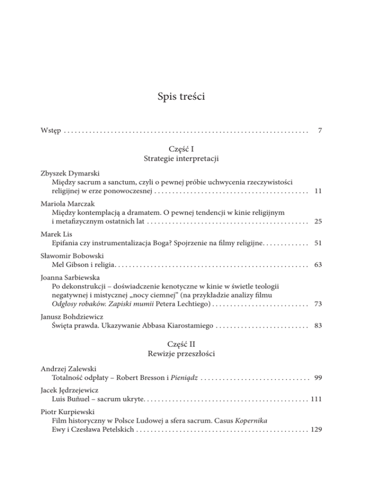 Spis treści Wstęp . . . . . . . . . . . . . . . . . . . . . . . . . . . . . . . . . . . . . . . . . . . . . . . . . . . . . . . . . . . . . . . . . . . . . 7 Część I Strategie interpretacji Zbyszek Dymarski Między sacrum a sanctum, czyli o pewnej próbie uchwycenia rzeczywistości religijnej w erze ponowoczesnej . . . . . . . . . . . . . . . . . . . . . . . . . . . . . . . . . . . . . . . . . . . 11 Mariola Marczak Między kontemplacją a dramatem. O pewnej tendencji w kinie religijnym i metafizycznym ostatnich lat . . . . . . . . . . . . . . . . . . . . . . . . . . . . . . . . . . . . . . . . . . . . . . 25 Marek Lis Epifania czy instrumentalizacja Boga? Spojrzenie na filmy religijne . . . . . . . . . . . . . 51 Sławomir Bobowski Mel Gibson i religia . . . . . . . . . . . . . . . . . . . . . . . . . . . . . . . . . . . . . . . . . . . . . . . . . . . . . . 63 Joanna Sarbiewska Po dekonstrukcji – doświadczenie kenotyczne w kinie w świetle teologii negatywnej i mistycznej „nocy ciemnej” (na przykładzie analizy filmu Odgłosy robaków. Zapiski mumii Petera Lechtiego) . . . . . . . . . . . . . . . . . . . . . . . . . . . 73 Janusz Bohdziewicz Święta prawda. Ukazywanie Abbasa Kiarostamiego . . . . . . . . . . . . . . . . . . . . . . . . . . . 83 Część II Rewizje przeszłości Andrzej Zalewski Totalność odpłaty – Robert Bresson i Pieniądz . . . . . . . . . . . . . . . . . . . . . . . . . . . . . . 99 Jacek Jędrzejewicz Luis Buñuel – sacrum ukryte . . . . . . . . . . . . . . . . . . . . . . . . . . . . . . . . . . . . . . . . . . . . . 111 Piotr Kurpiewski Film historyczny w Polsce Ludowej a sfera sacrum. Casus Kopernika Ewy i Czesława Petelskich . . . . . . . . . . . . . . . . . . . . . . . . . . . . . . . . . . . . . . . . . . . . . . . . 129 6 Spis treści Część III Między sacrum a profanum Andrzej Szpulak Filmy Pawła Łungina Car i Wyspa wobec duchowej tradycji rosyjskiego prawosławia . . . . . . . . . . . . . . . . . . . . . . . . . . . . . . . . . . . . . . . . . . . . . . . . . . 147 Barbara Forysiewicz Katechizm (ojca) Anatolija, czyli człowiek wobec sacrum w filmie Pawła Łungina Wyspa . . . . . . . . . . . . . . . . . . . . . . . . . . . . . . . . . . . . . . . . . . . . . . . . . . . 157 Paweł Biliński Dojść do sacrum poprzez kino. O Życiu Jezusa i Ludzkości Brunona Dumonta . . . 171 Julia Gierczak Duchowość ateistyczna według Brunona Dumonta . . . . . . . . . . . . . . . . . . . . . . . . . . 189 Marek Kotyński Cudowny Bóg. Poszukiwanie transcendencji w Lourdes Jessiki Hausner . . . . . . . . 197 Mirosław Przylipiak Walka o krzyż – dwa spojrzenia . . . . . . . . . . . . . . . . . . . . . . . . . . . . . . . . . . . . . . . . . . . 219 Część IV Na orbicie popkultury Sebastian Jakub Konefał New Age i filmowe przypowieści o poszukiwaniu „kosmicznej duchowości”. Klasyka i współczesne kontynuacje . . . . . . . . . . . . . . . . . . . . . . . . . . . . . . . . . . . . . . . . 241 Aleksander Roman Michalak Kino i apokryfy . . . . . . . . . . . . . . . . . . . . . . . . . . . . . . . . . . . . . . . . . . . . . . . . . . . . . . . . . 261 Przemysław Zawrotny Straszne i śmieszne filmy o Kościele. Kultura popularna a narracje o sacrum – na przykładzie Kodu da Vinci i Dogmy . . . . . . . . . . . . . . . . . . . . . . . . . . . . . . . . . . 273 Piotr Przytuła Religia Hollywood. Popkulturowe przetwarzanie duchowości w kinie popularnym ostatniej dekady . . . . . . . . . . . . . . . . . . . . . . . . . . . . . . . . . . . . . . . . . . . . . . . . . . . . . . . . 287 Marek Adamiec Diabeł w świecie audiowizualnym w ubiegłym i obecnym stuleciu . . . . . . . . . . . . . 299 Jerzy Szyłak A.I. Sztuczna Inteligencja jako przypowieść o pewnym złudzeniu . . . . . . . . . . . . . . 325 Agnieszka Kiejziewicz Shintoistyczni bogowie na dużym ekranie. Przenikanie sacrum do popkultury na przykładzie kinematografii japońskiej . . . . . . . . . . . . . . . . . . . . . . . . . . . . . . . . . . . 333 Krzysztof Kornacki Bóg i zaświaty w kinie postmodernistycznym . . . . . . . . . . . . . . . . . . . . . . . . . . . . . . . 355